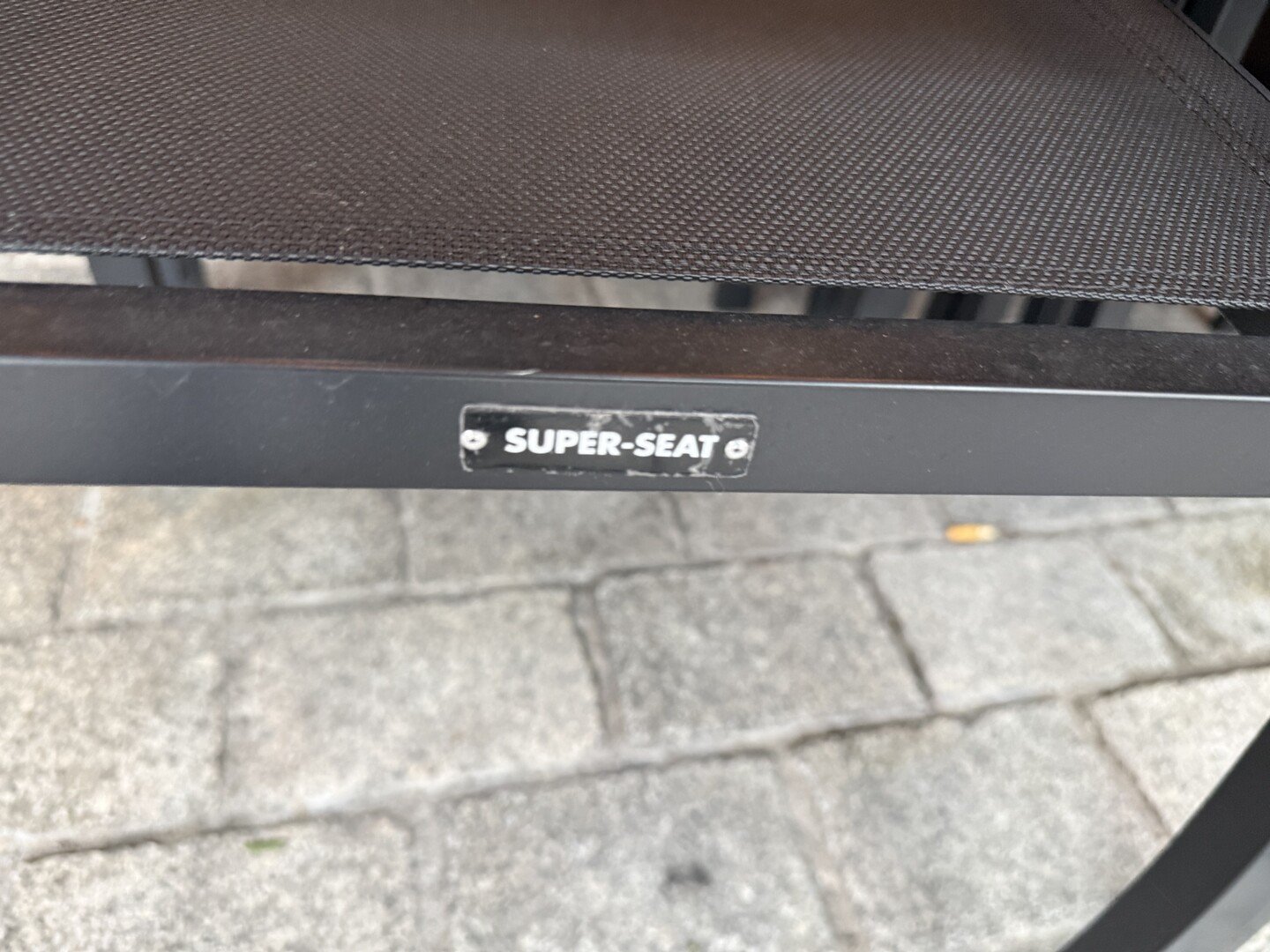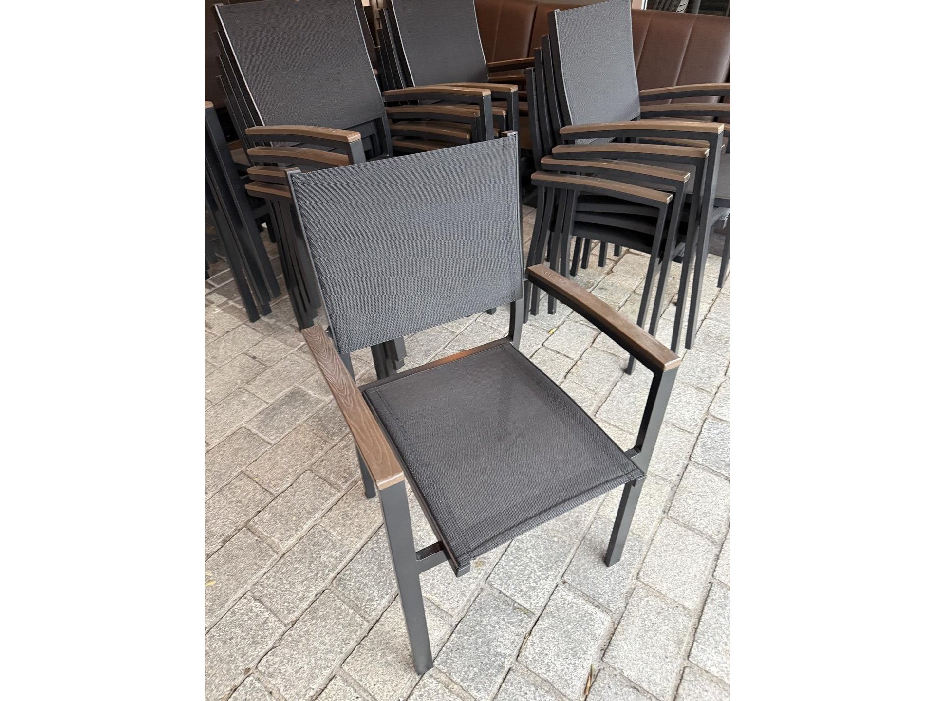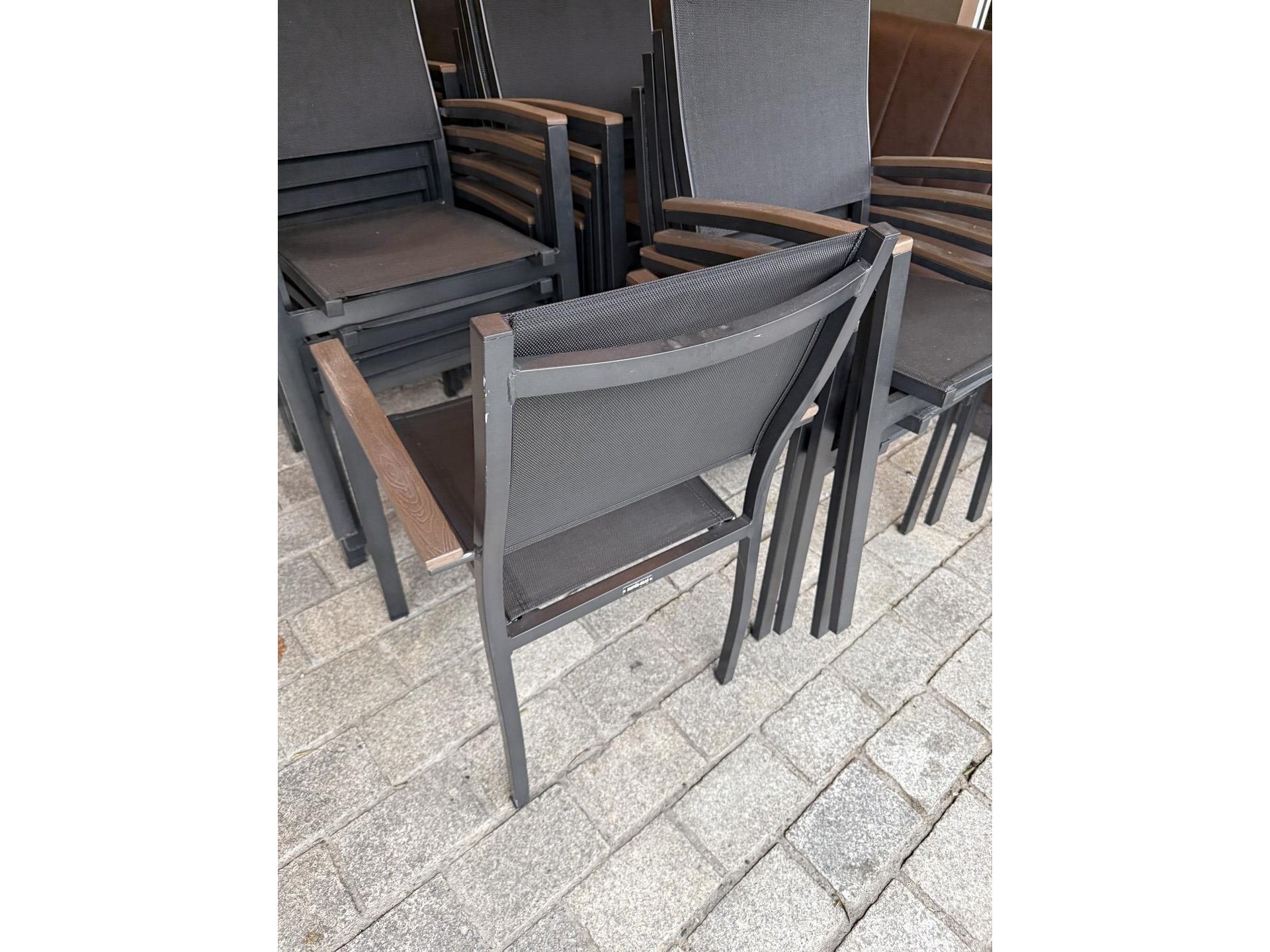 33 stapelbare terrasstoelen met armleuning, zwarte kleur, merk SUPER SEAT ( staande op terras )
