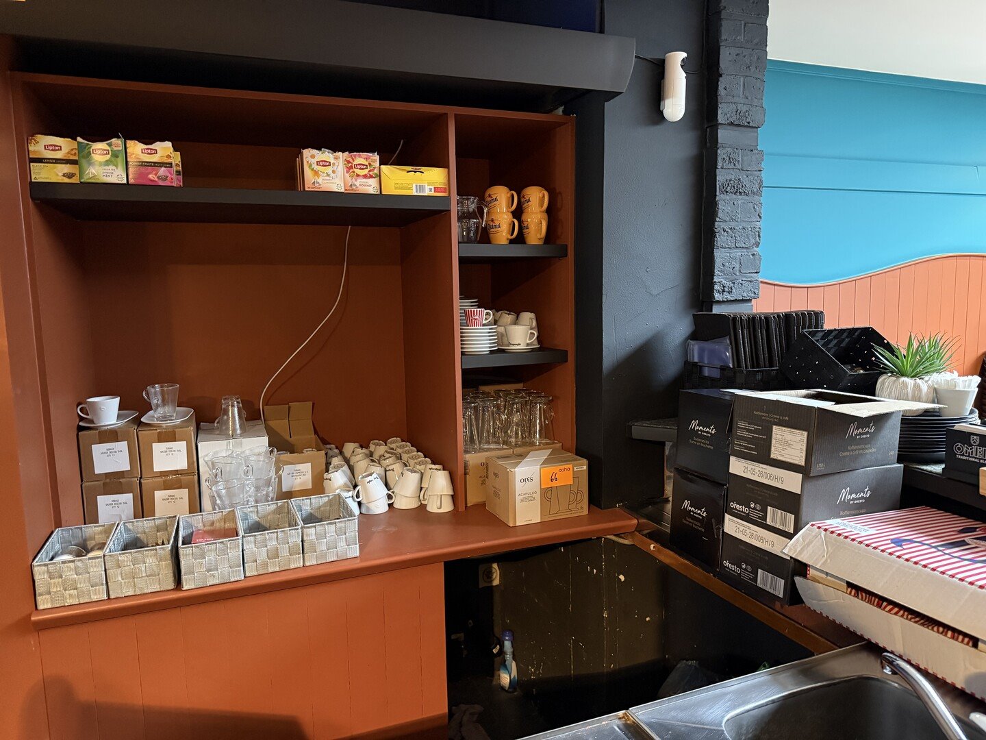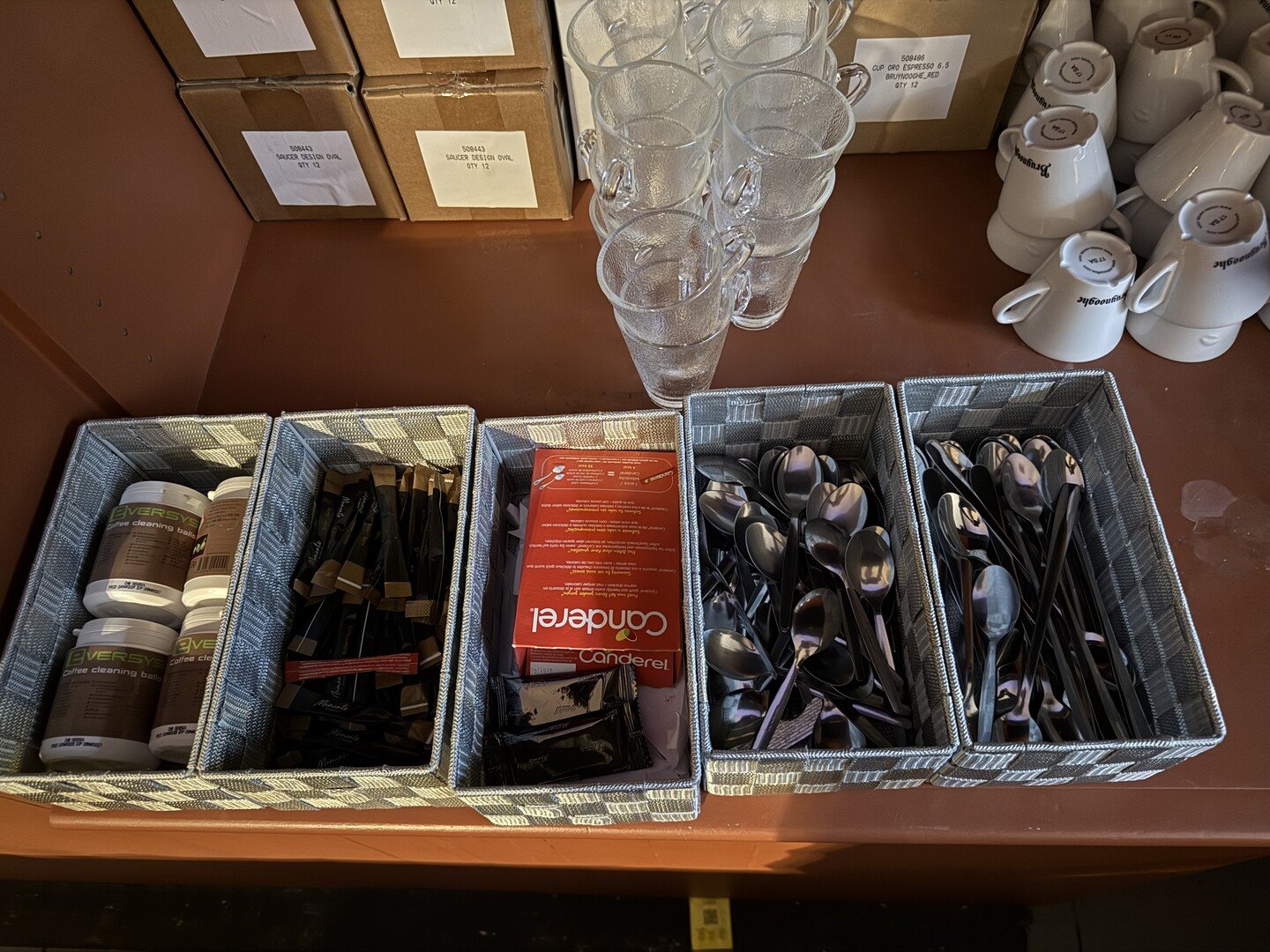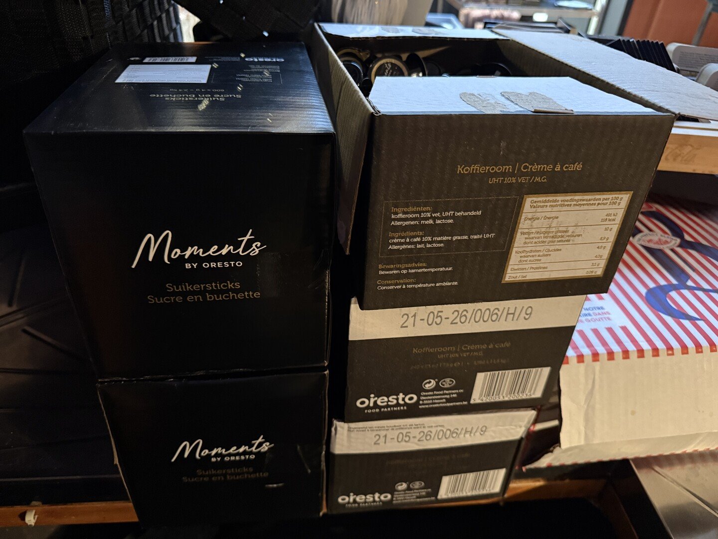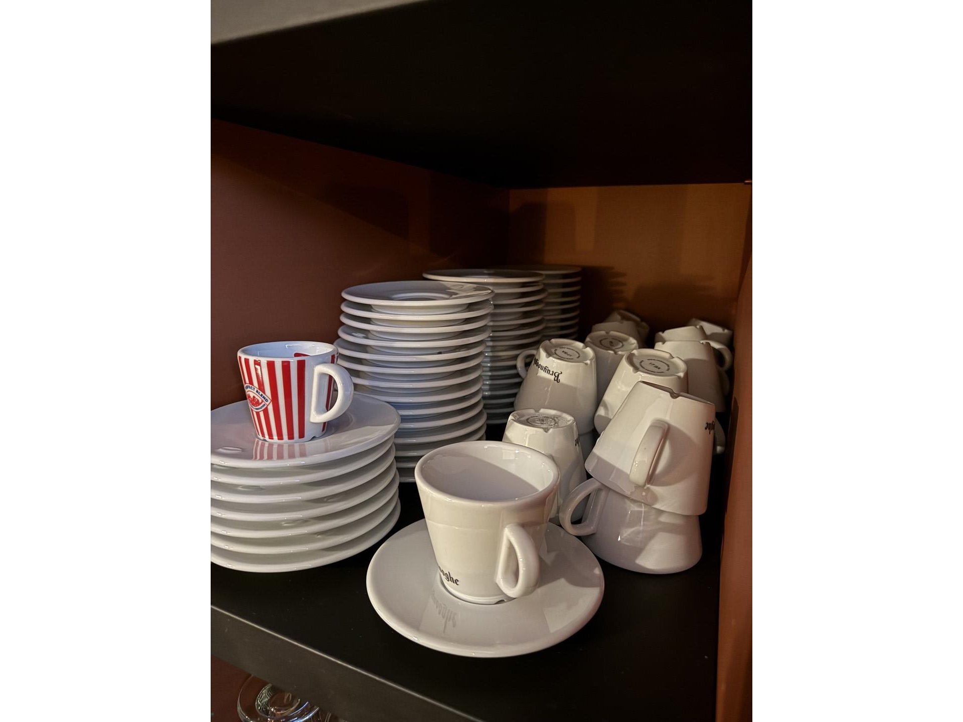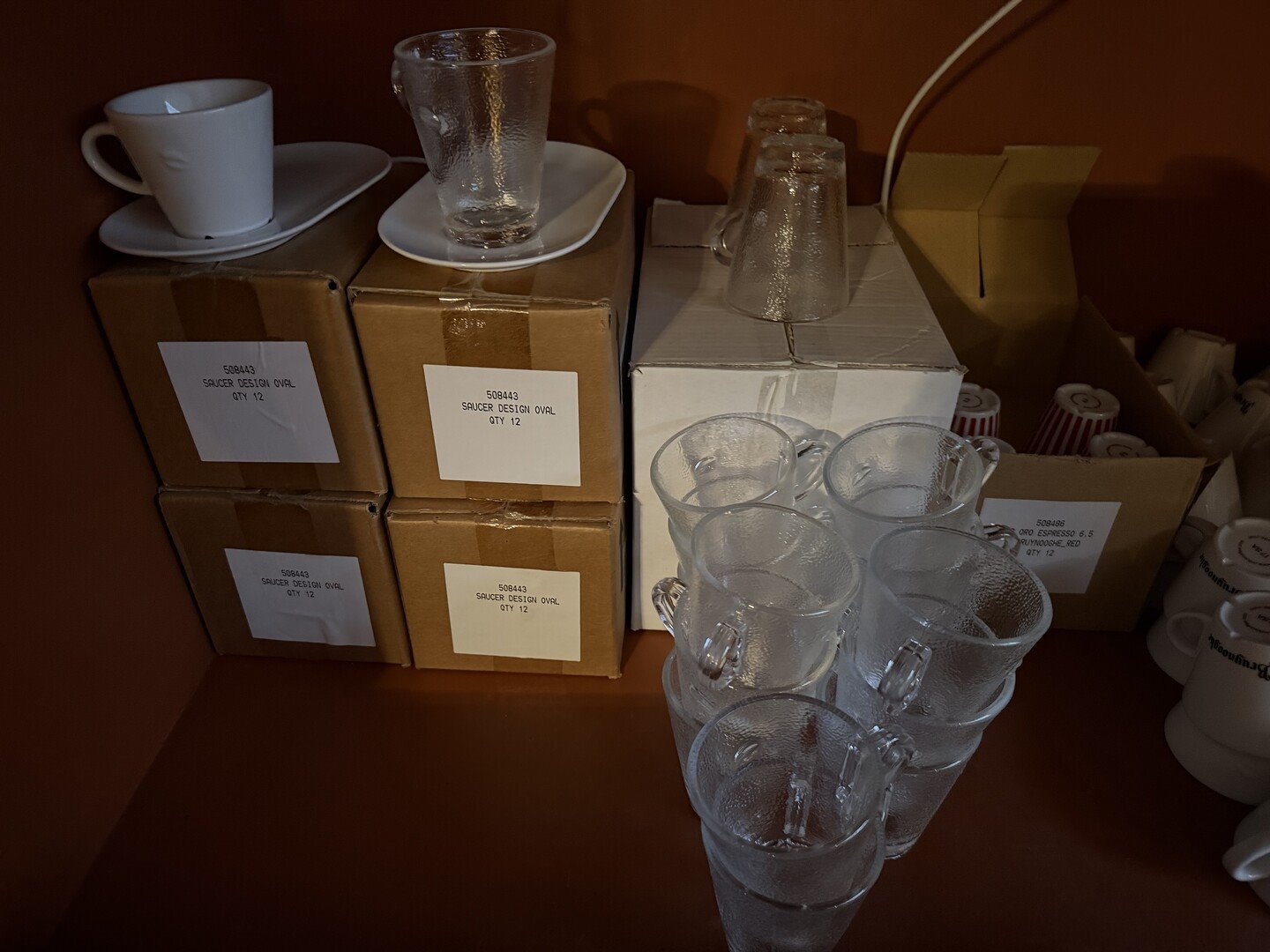 Koffietassen en ondertassen, cécémeltassen, glazen thee-tassen, …<br /> + diverse soorten thee, vnl LIPTON + suiker, melkcups + deca koffiebonen