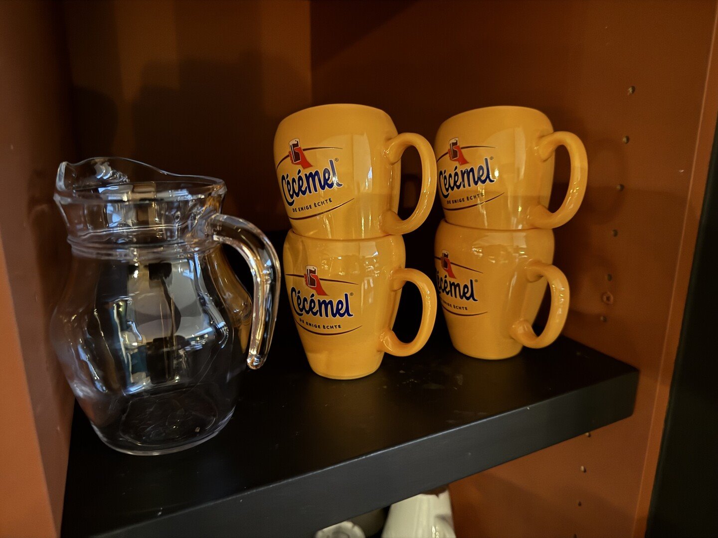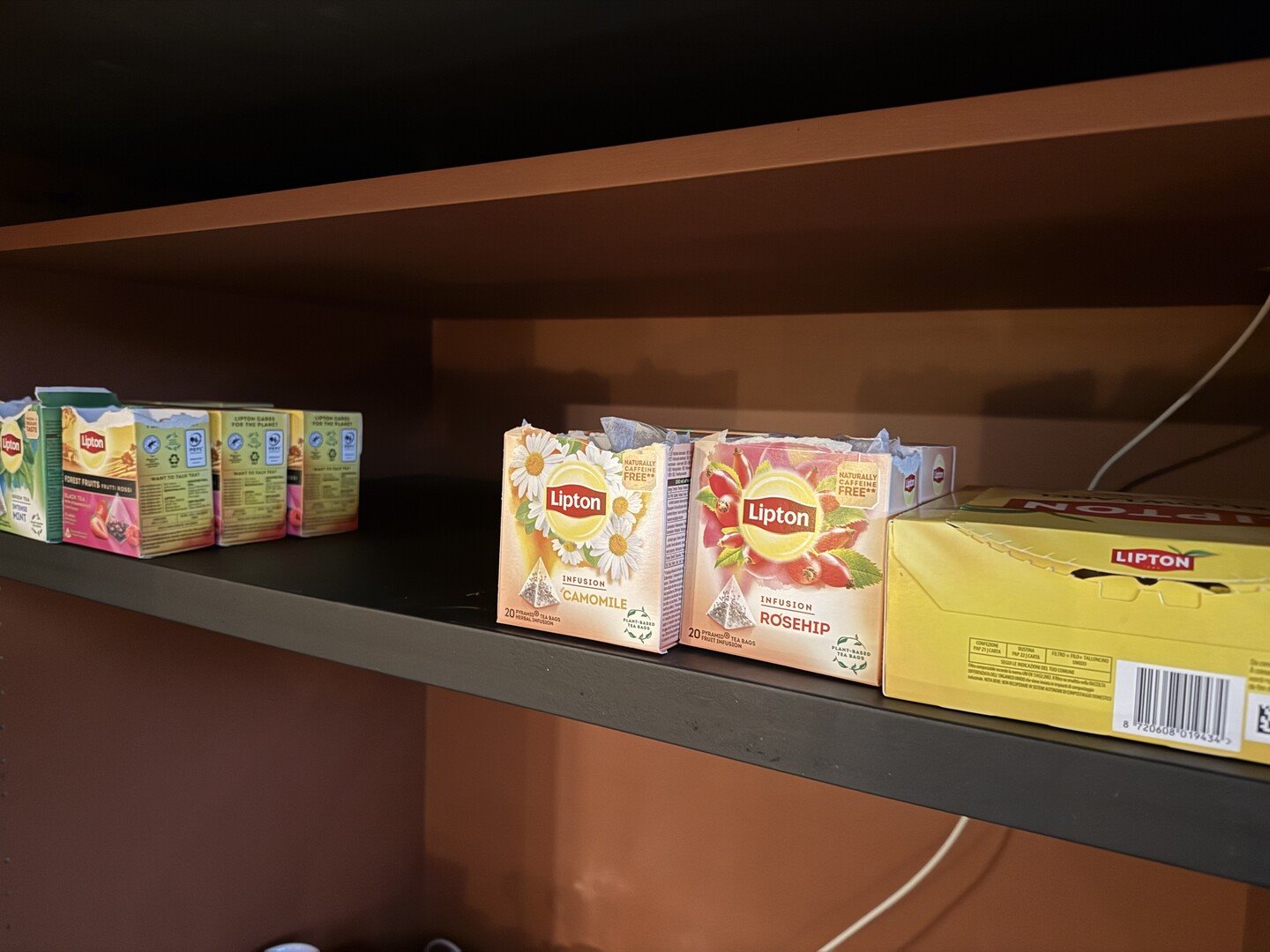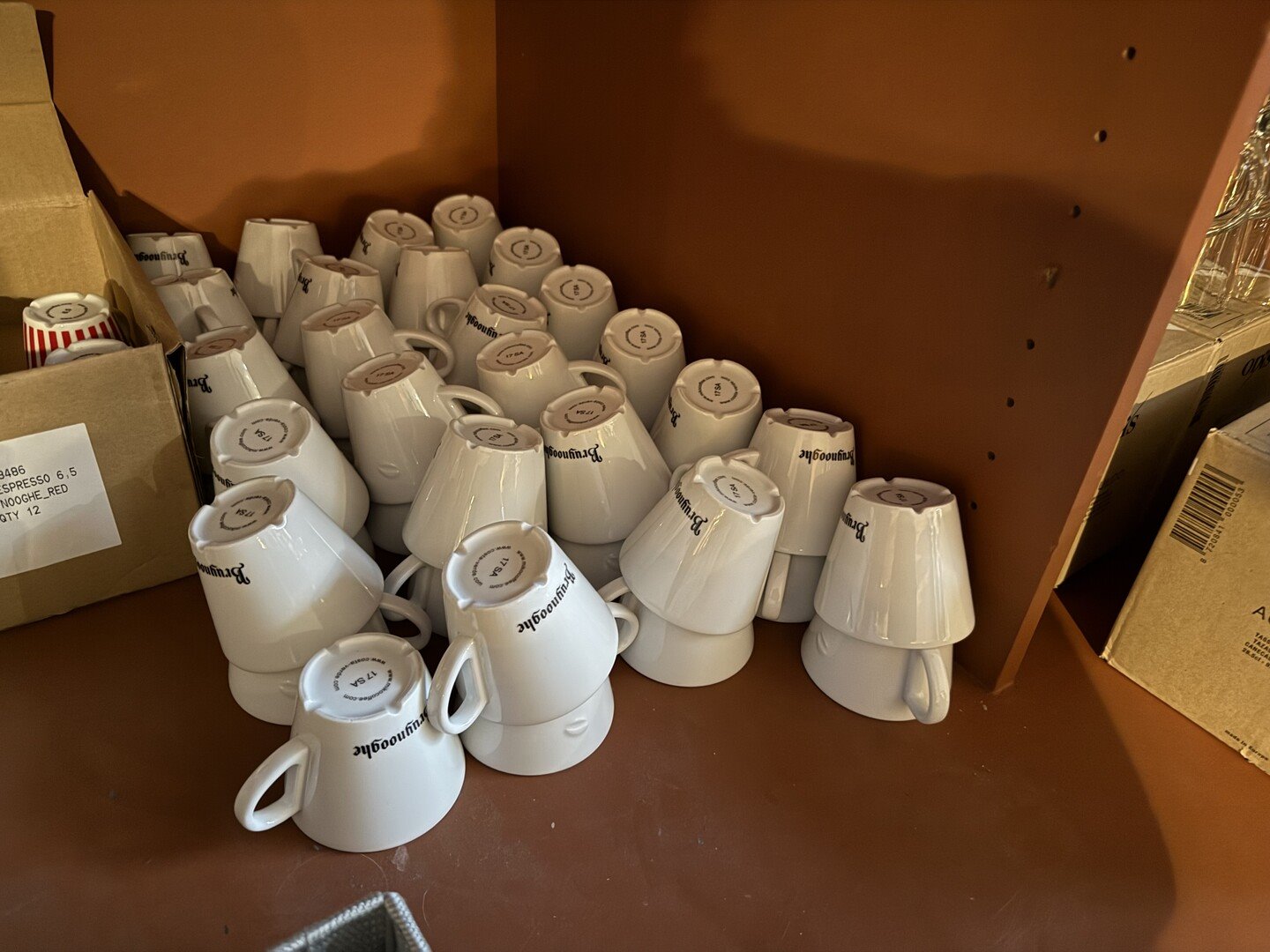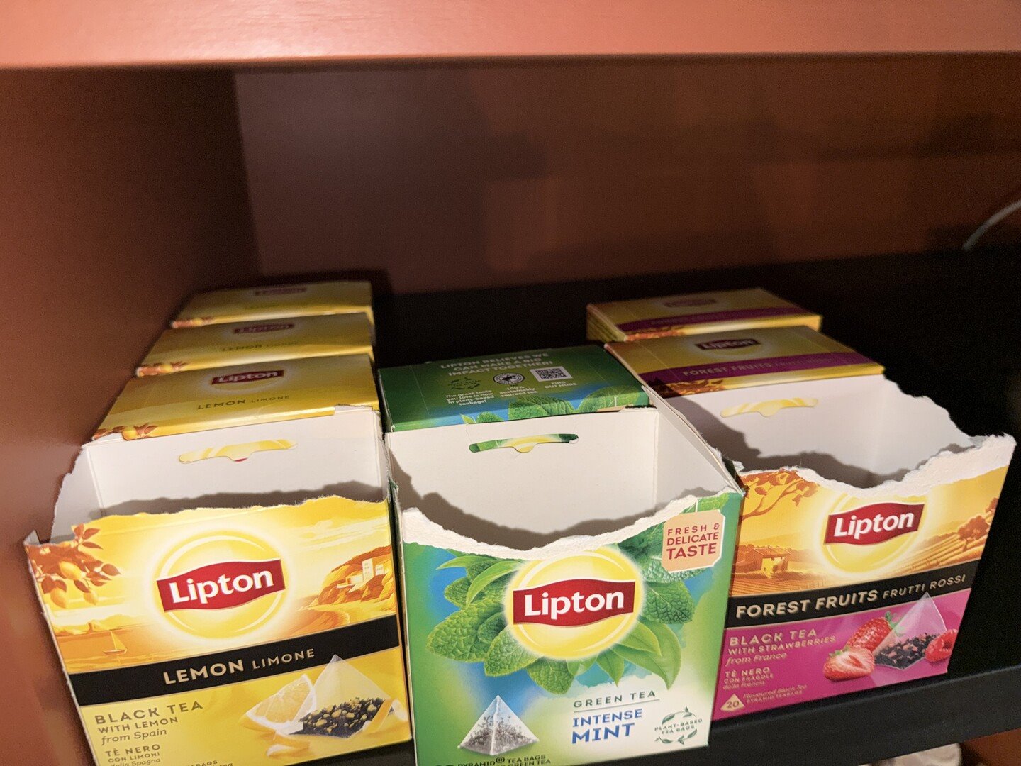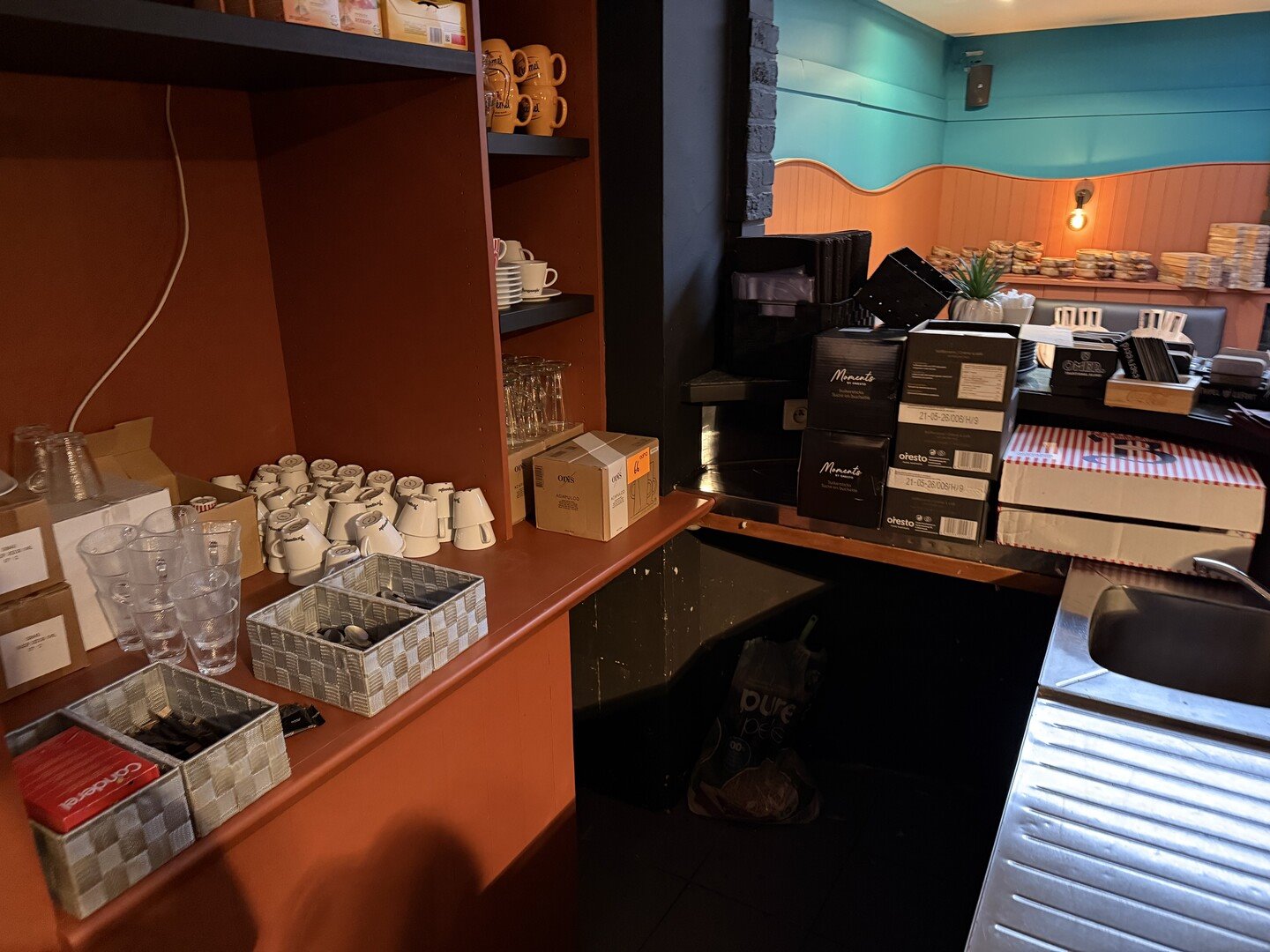 Koffietassen en ondertassen, cécémeltassen, glazen thee-tassen, …<br /> + diverse soorten thee, vnl LIPTON + suiker, melkcups + deca koffiebonen