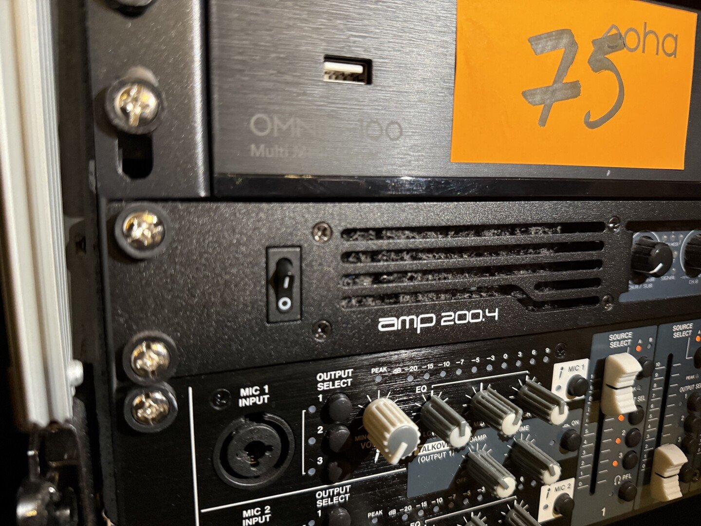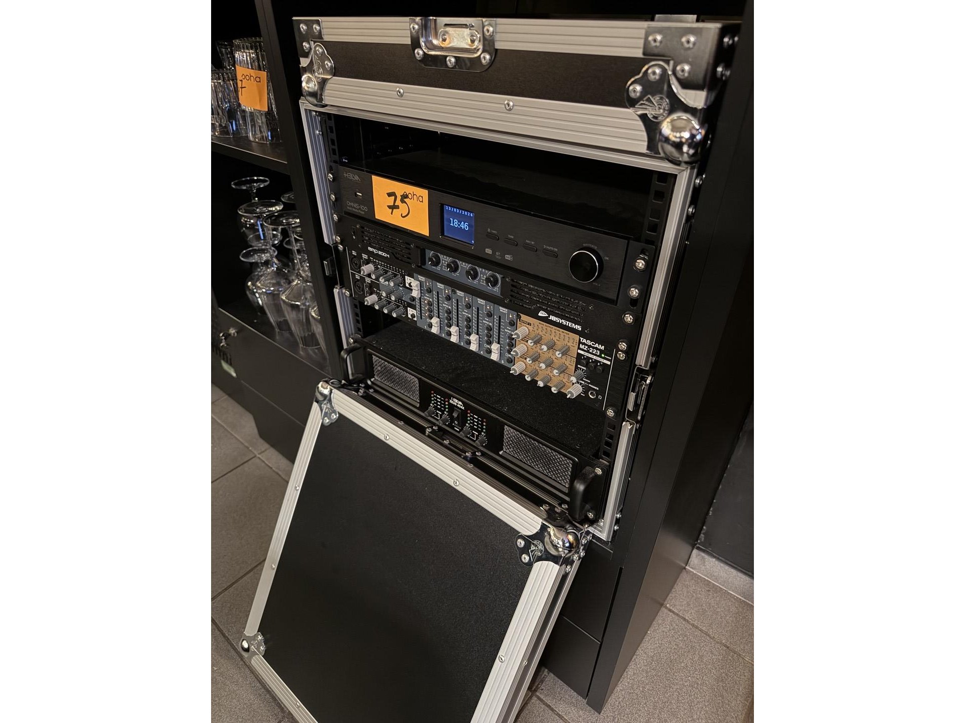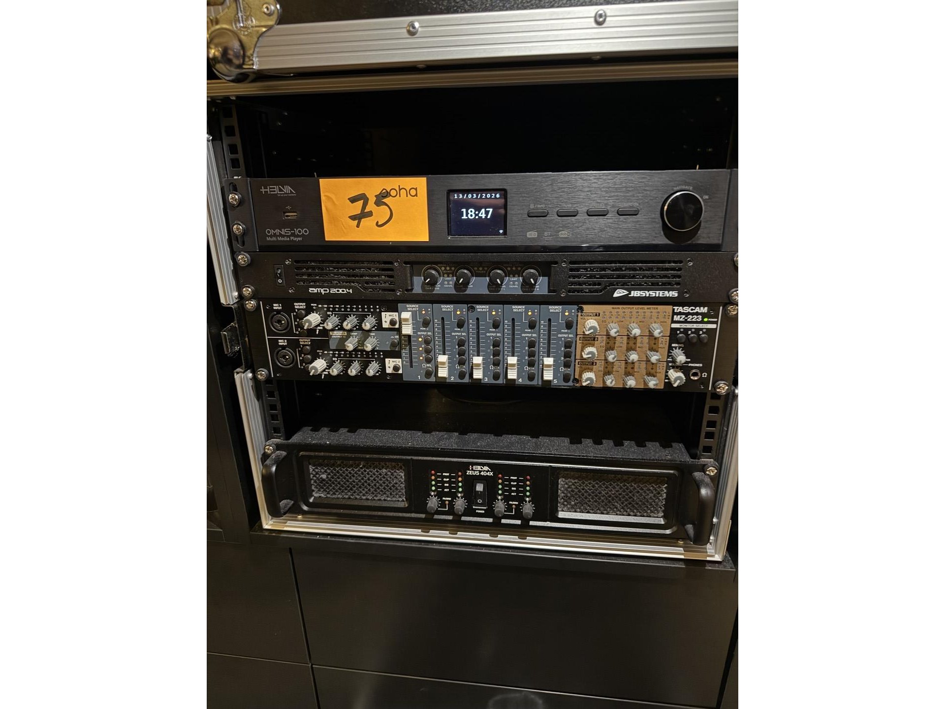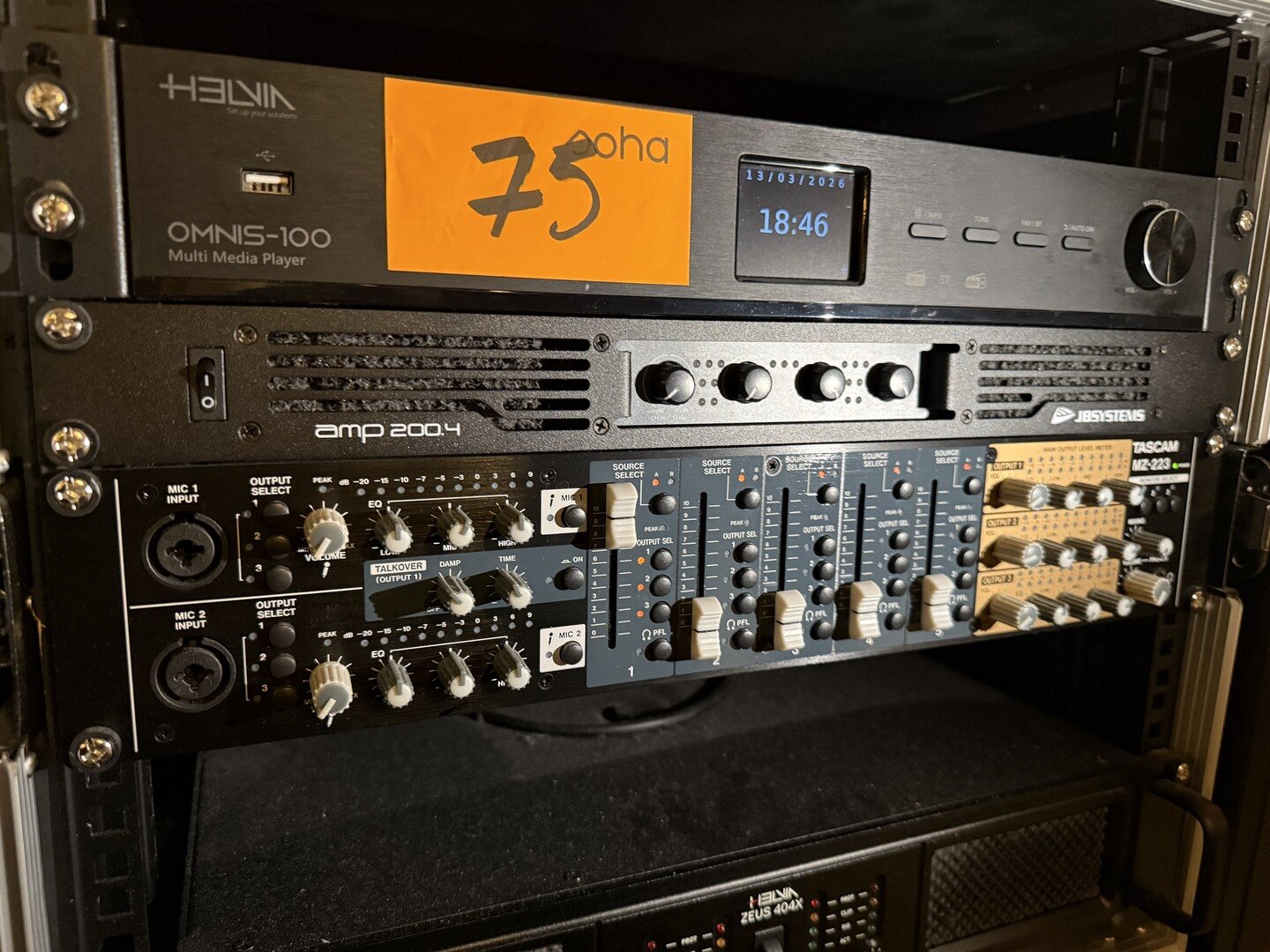 Geluidsinstallatie (flightcase) bestaande uit : <br /> - Professionele 4-kanaals eindversterker in een 19-inch 1U rackmount, merk, JB SYSTEMS, model AMP200.4<br /> - zone installatie mixer, merk Tascam, model mz223<br /> - veelzijdige industriële internetradio, merk HELVIN omnis 100<br /> - versterker HEVIA, model Zeus 404<br /> - 6 luidsprekers - merk, AUDAC + 2 luidsprekers (buiten)<br /> VAKKUNDIG te demonteren ! Breng gepast materiaal mee !