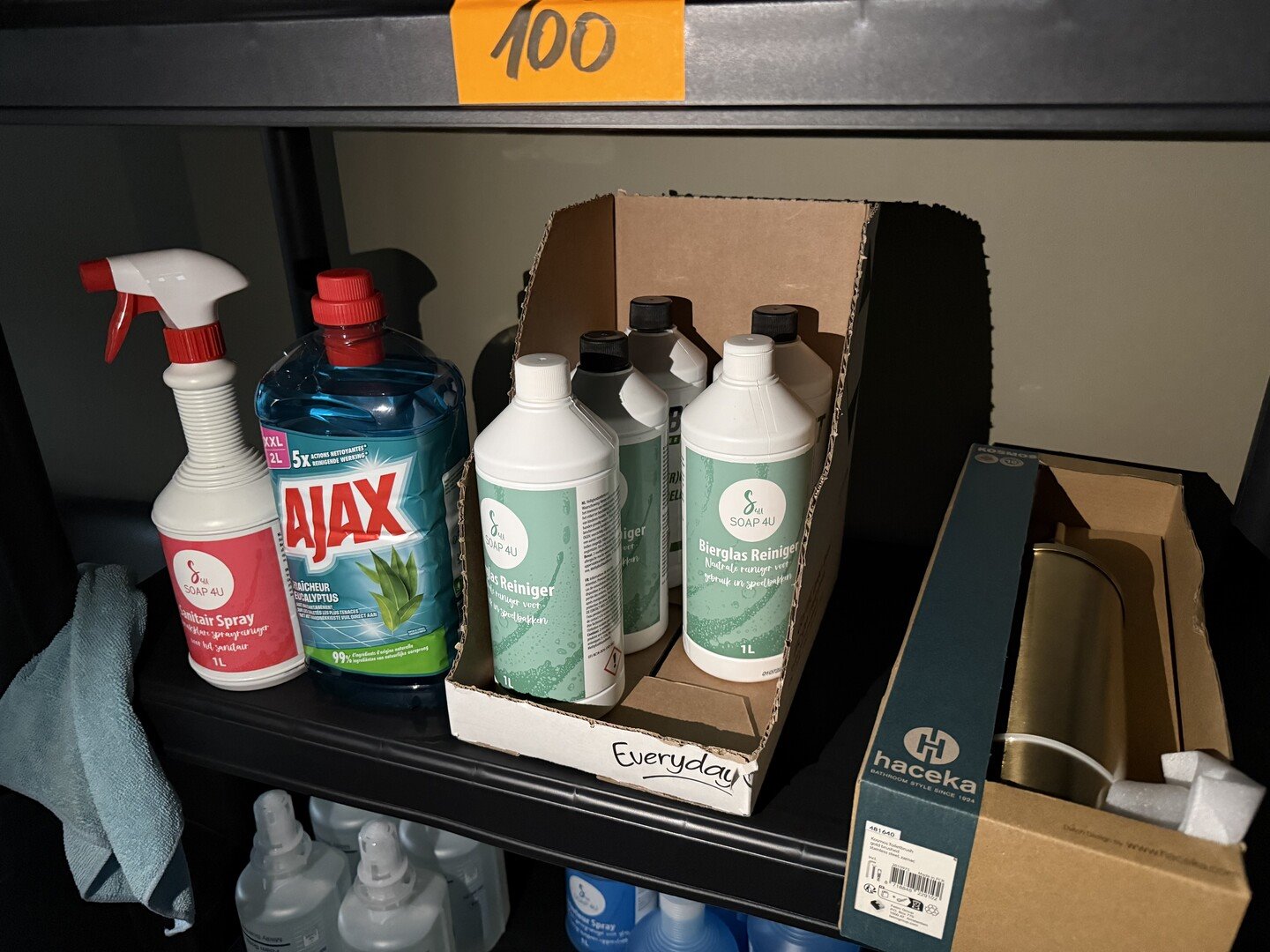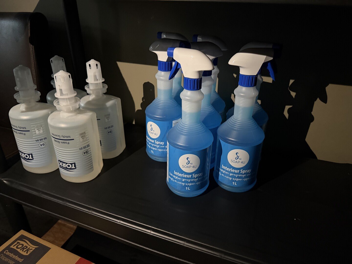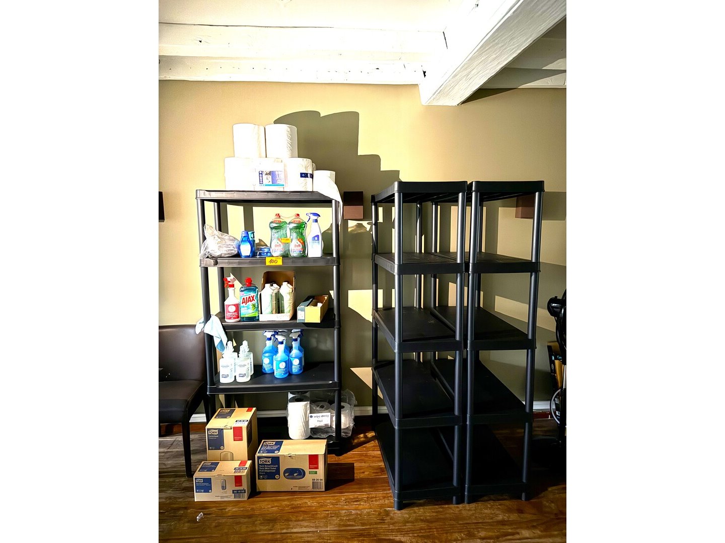 3 modulaire rekken in PVC + uitgebreide hoeveelheid schoonmaakproducten en + toiletpapier, handoekkrollen, houders TORK<br /> (staat op 1e verdieping)