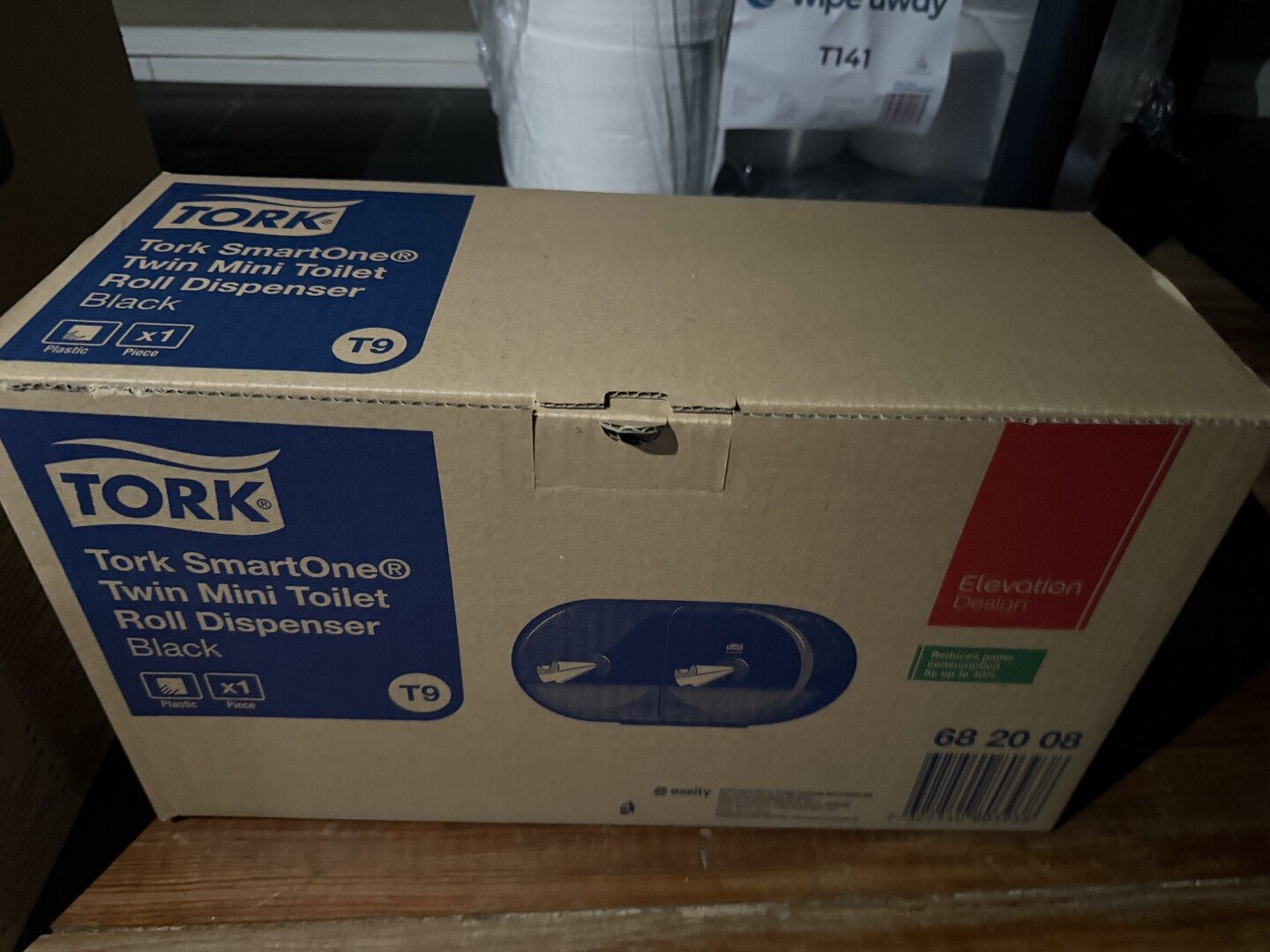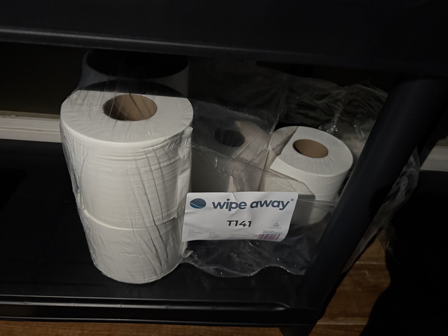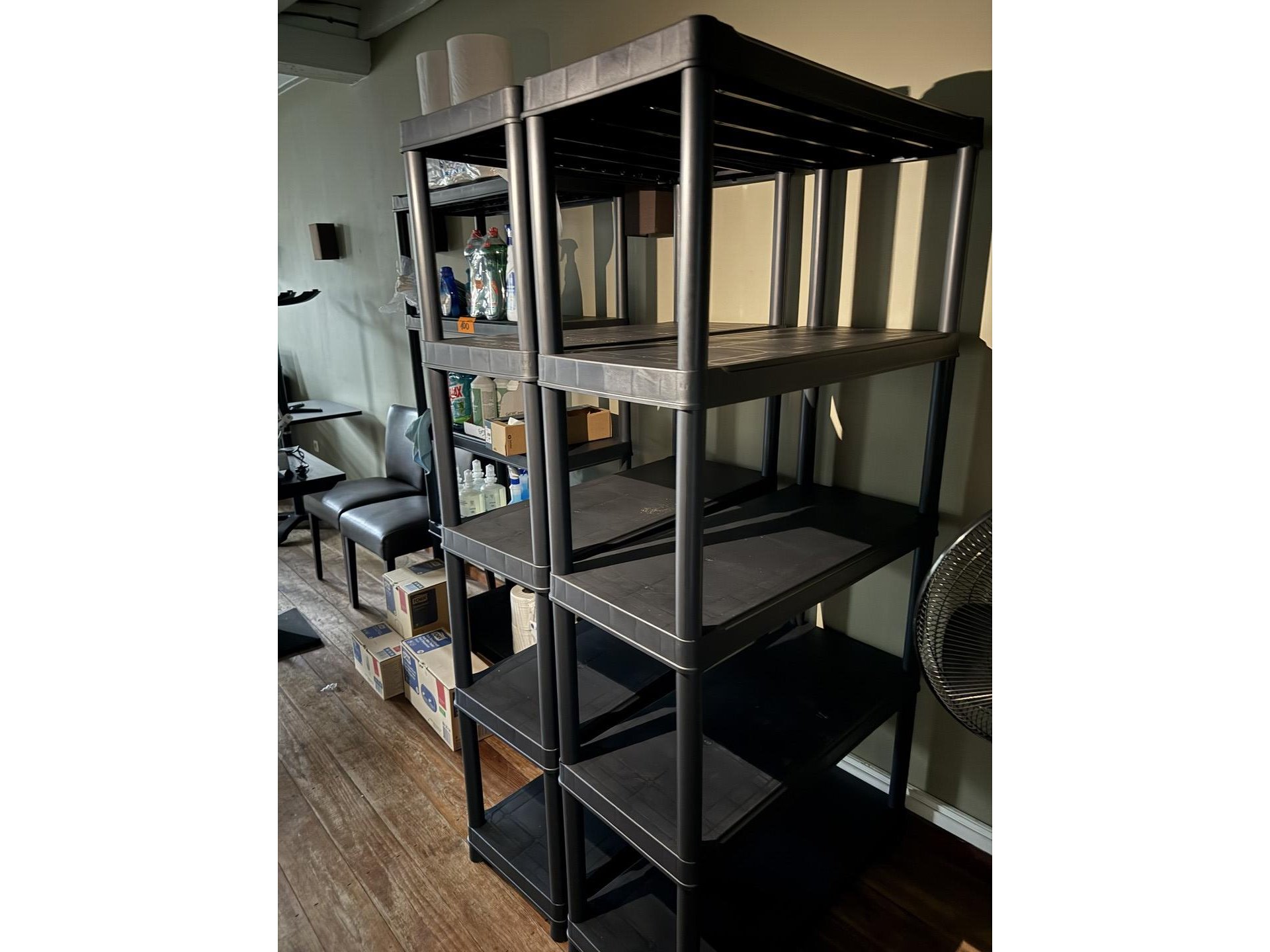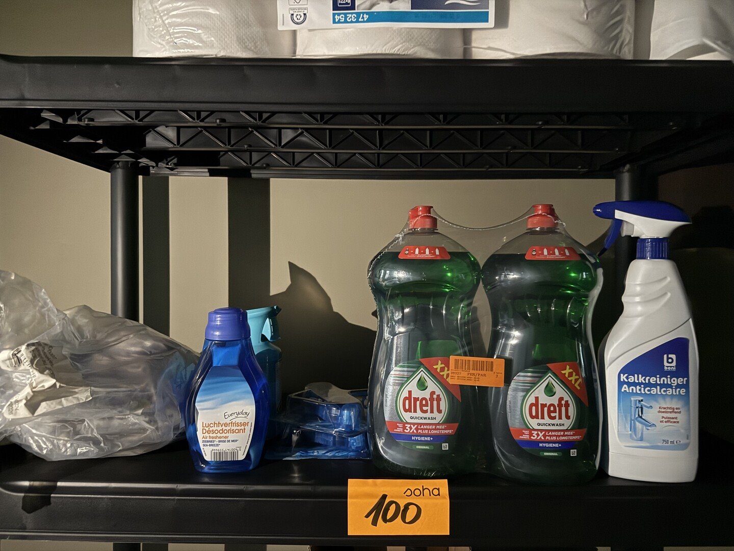 3 modulaire rekken in PVC + uitgebreide hoeveelheid schoonmaakproducten en + toiletpapier, handoekkrollen, houders TORK<br /> (staat op 1e verdieping)
