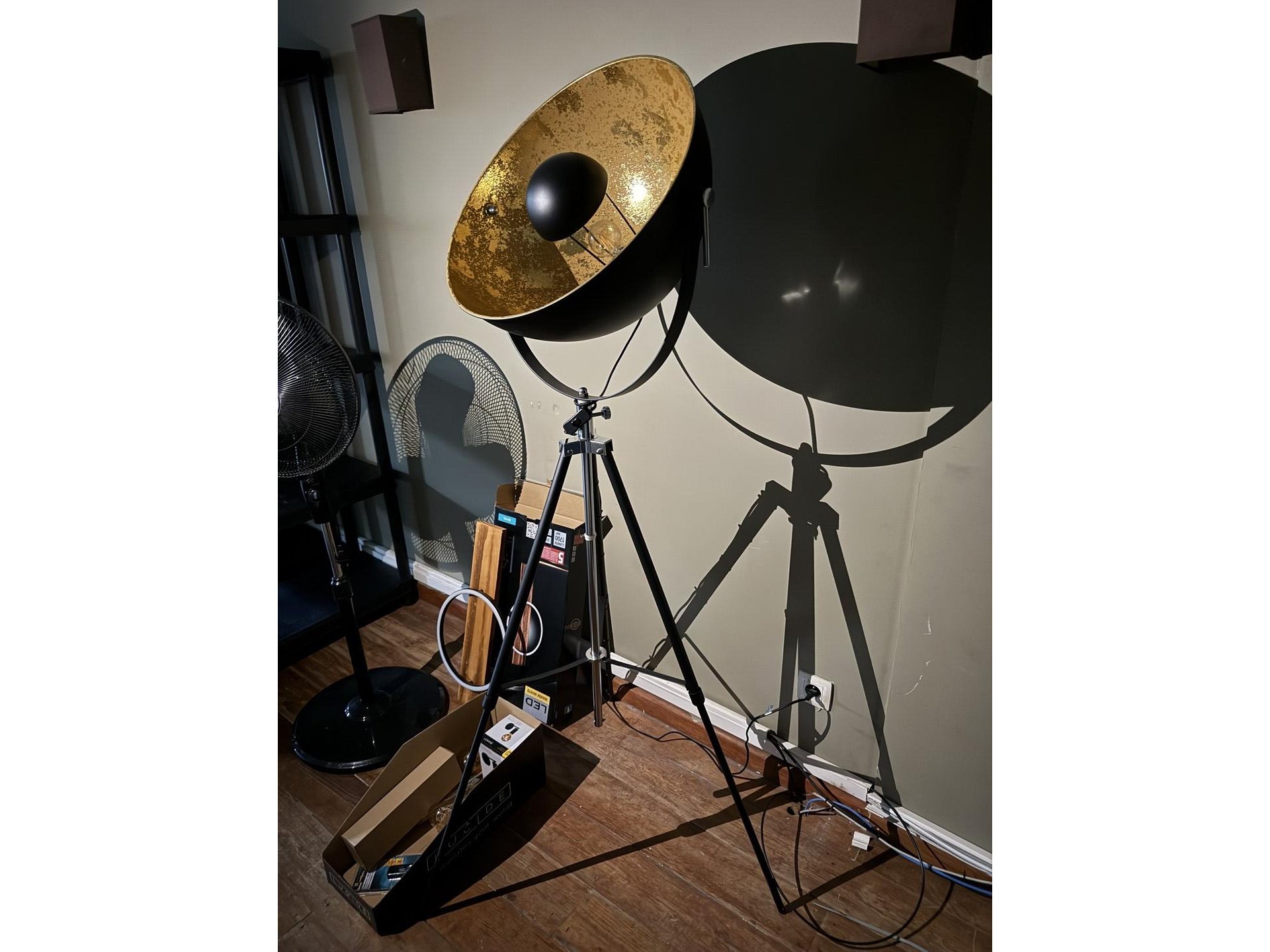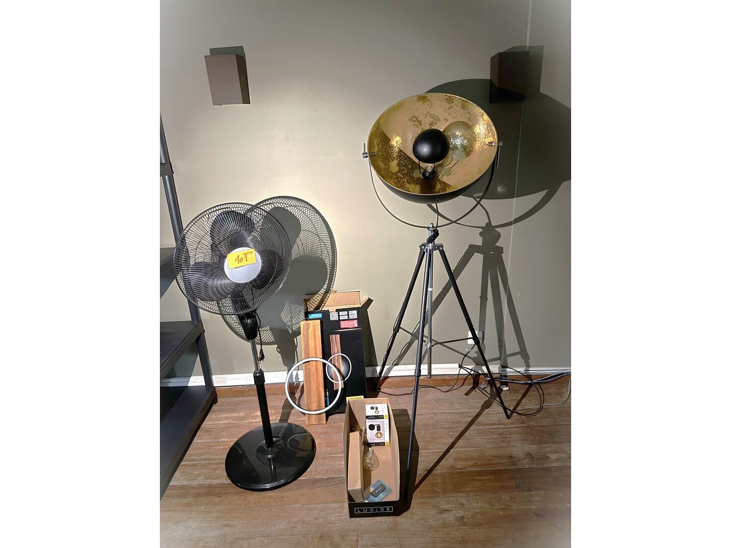 Industriële vloerlamp op driepoot + ventilator op voet + LED - lamp + enkele losse lampen<br /> (op 1e verdieping)