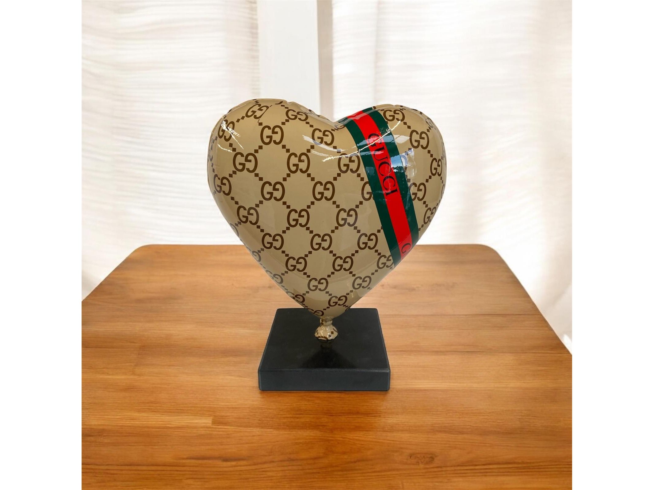 Waardering expert : € 800 - Een high-end interieurobject van het gerenommeerde Nederlandse kunsthuis Cobra Art - Komt met COA - Dit sculptuur combineert de speelse vorm van een ballon-hart met de allure van haute couture - De strakke, hoogglans afwerking en het iconische patroon (een artistieke knipoog naar het Gucci-design) maken dit tot een luxe statement piece dat direct sfeer brengt in een modern interieur - Het kunstwerk "The Balloon Heart Gucci tribute" van Naor is in een speciale editie uitgegeven door Cobra Art Amsterdam, gevestigd vlakbij het Rijksmuseum en het Van Gogh Museum - Afmetingen 27 x 33 x 15 cm.