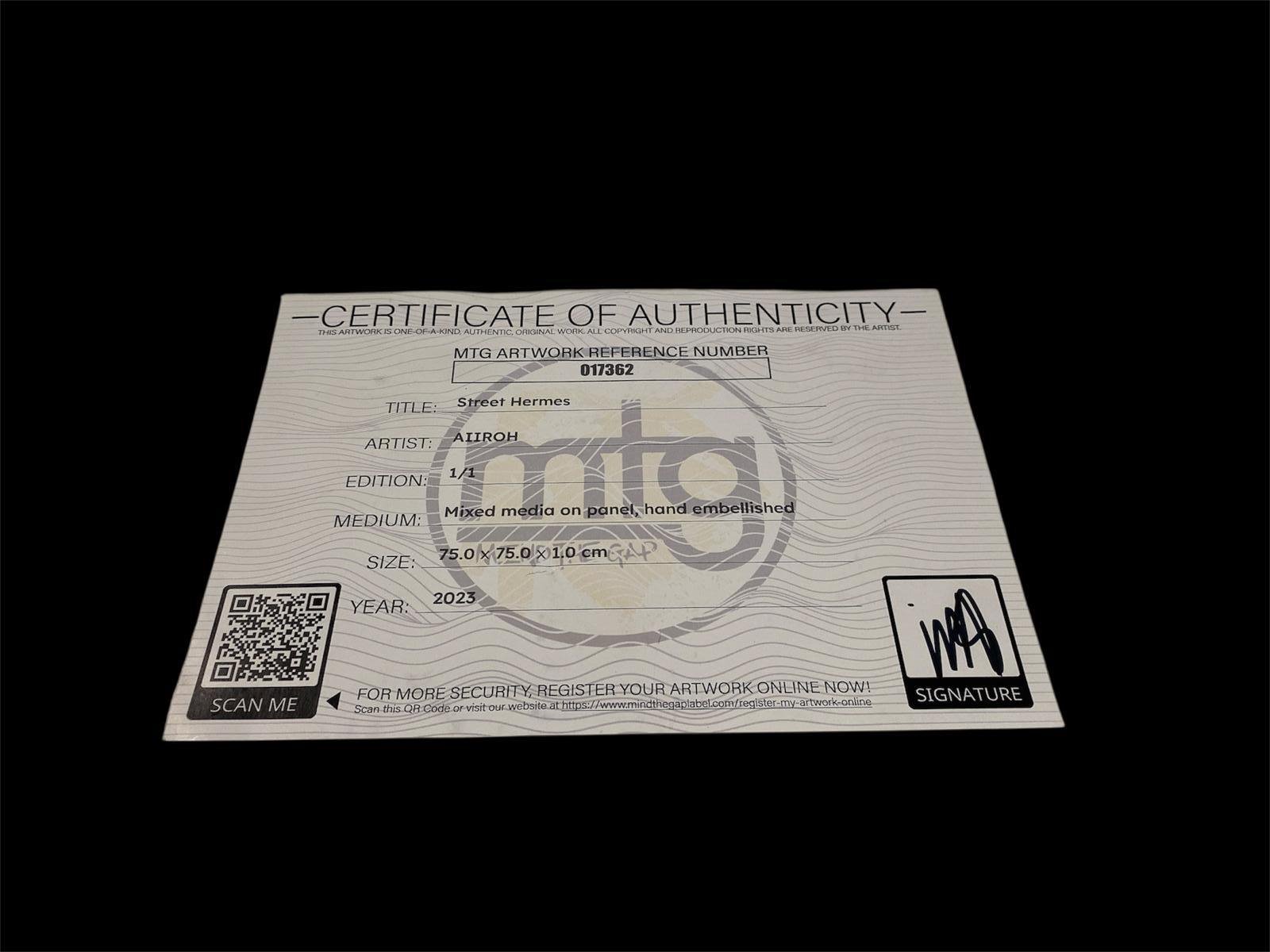 Waardering expert : € 7500 - "AIIROH street hermes" van de Franse pop-/straatkunstenaar Aiiroh combineert haute couture met urban art , waarin het luxemerk Hermès centraal staat, en gebruikt vaak mixed media zoals graffiti, stencils en Swarovski-kristallen om kritiek te leveren op consumentisme en popcultuur.Hij creëert levendige, gestructureerde werken die straatkunsttechnieken combineren met symbolen uit de high-end mode, waardoor luxe toegankelijk en tegelijkertijd betekenisvol wordt - Het werk van Aiiroh wordt wereldwijd tentoongesteld en verkocht in galerieën (zoals Artsper , Belle Arte Galleria en Lemon Frame) en via online kunstplatformen, waarbij specifieke series zoals "Street Hermes" op veilingen verschijnen - Afm. paneel : 75 x 75 cm. - Komt met certificaat van AIIROH en COA.