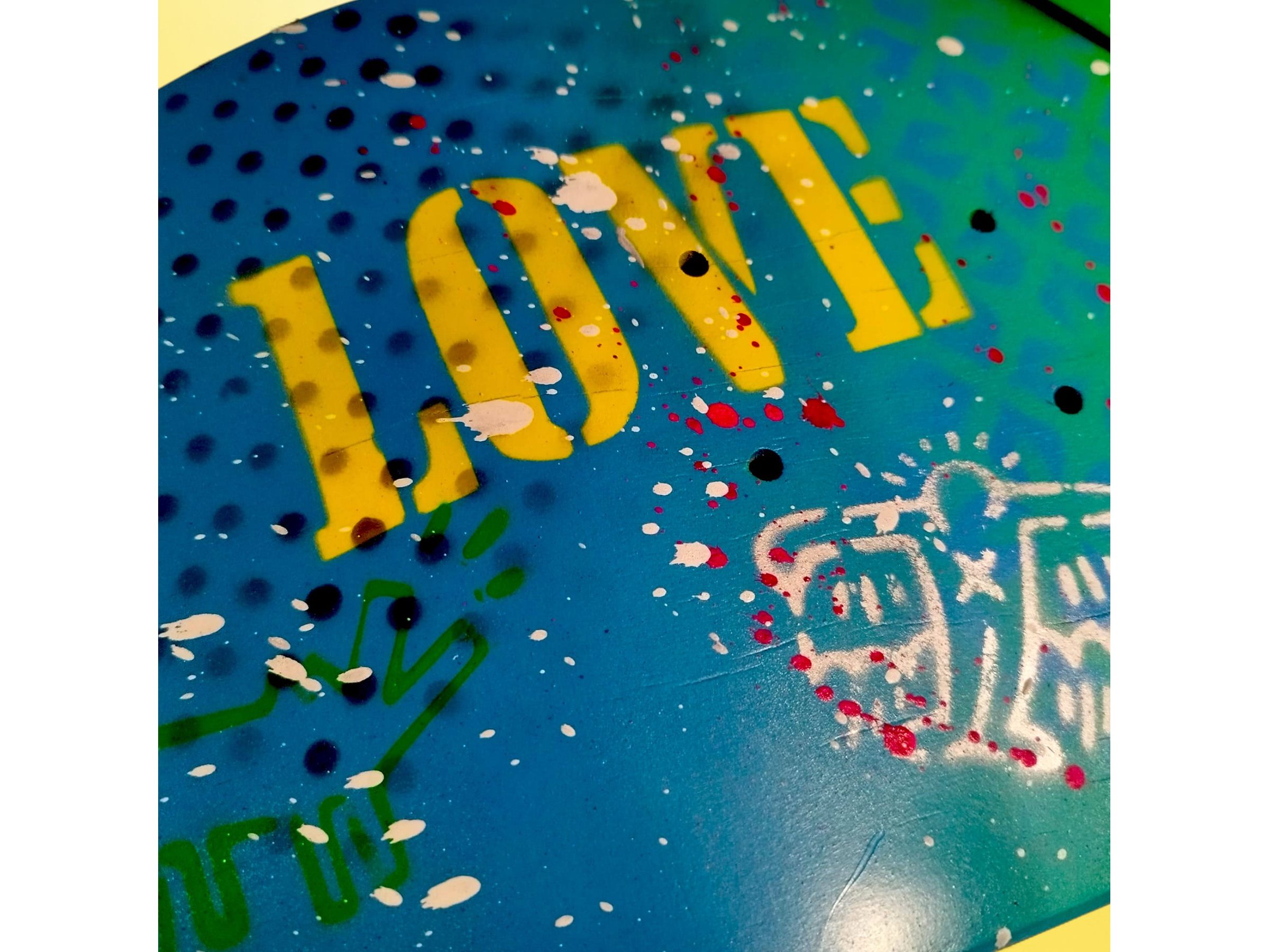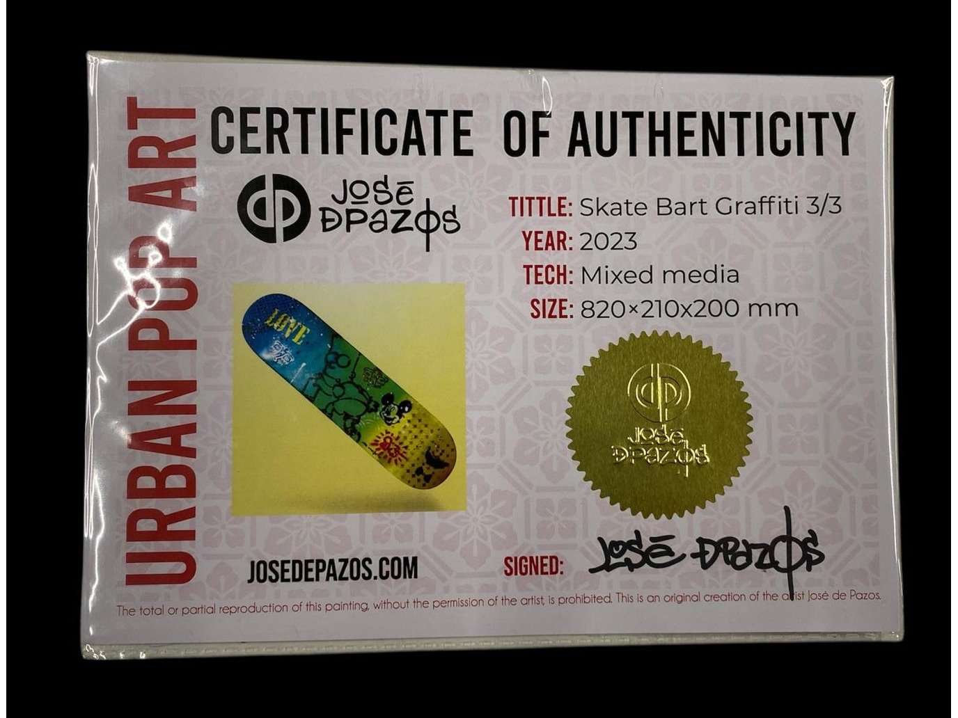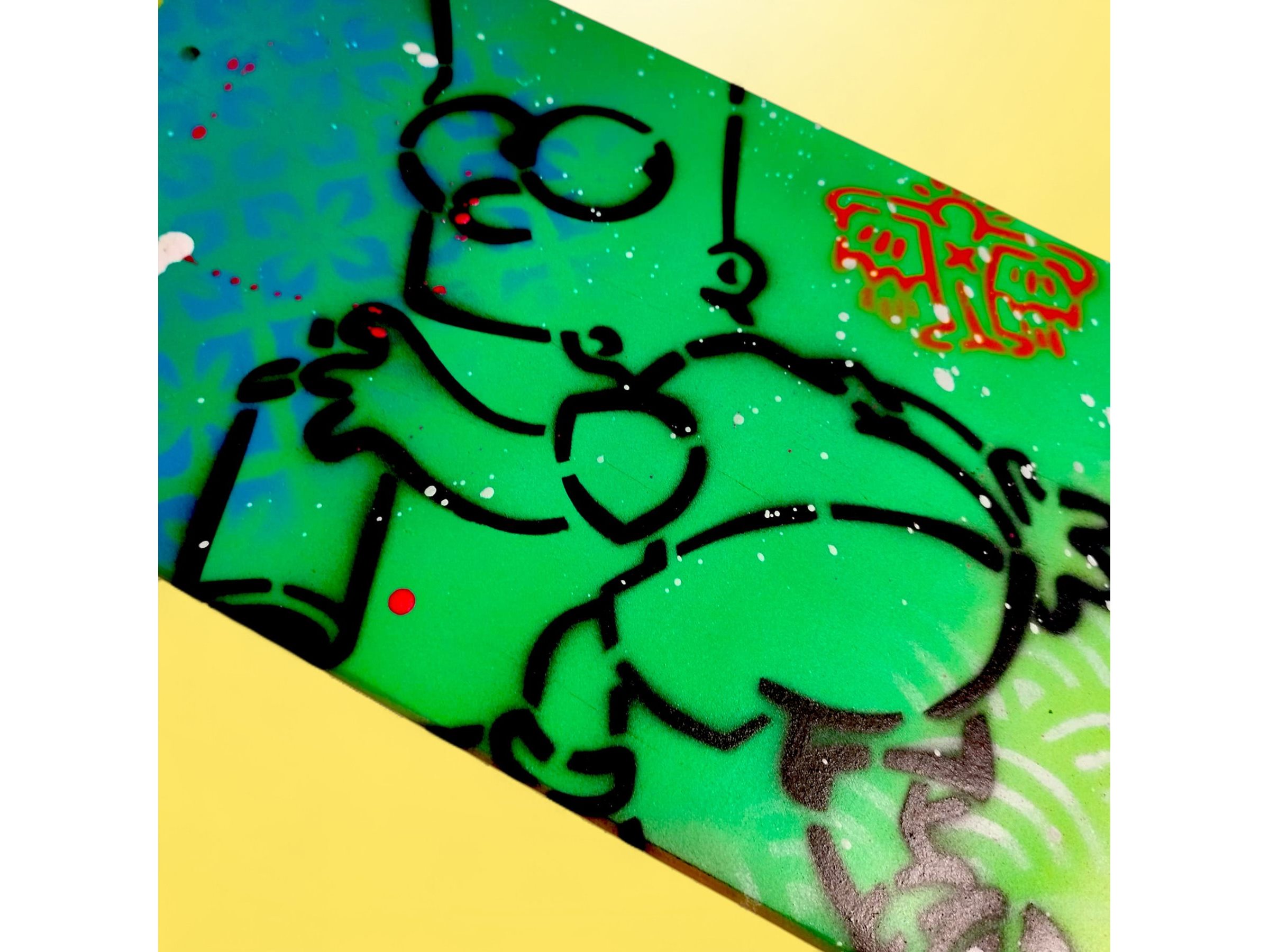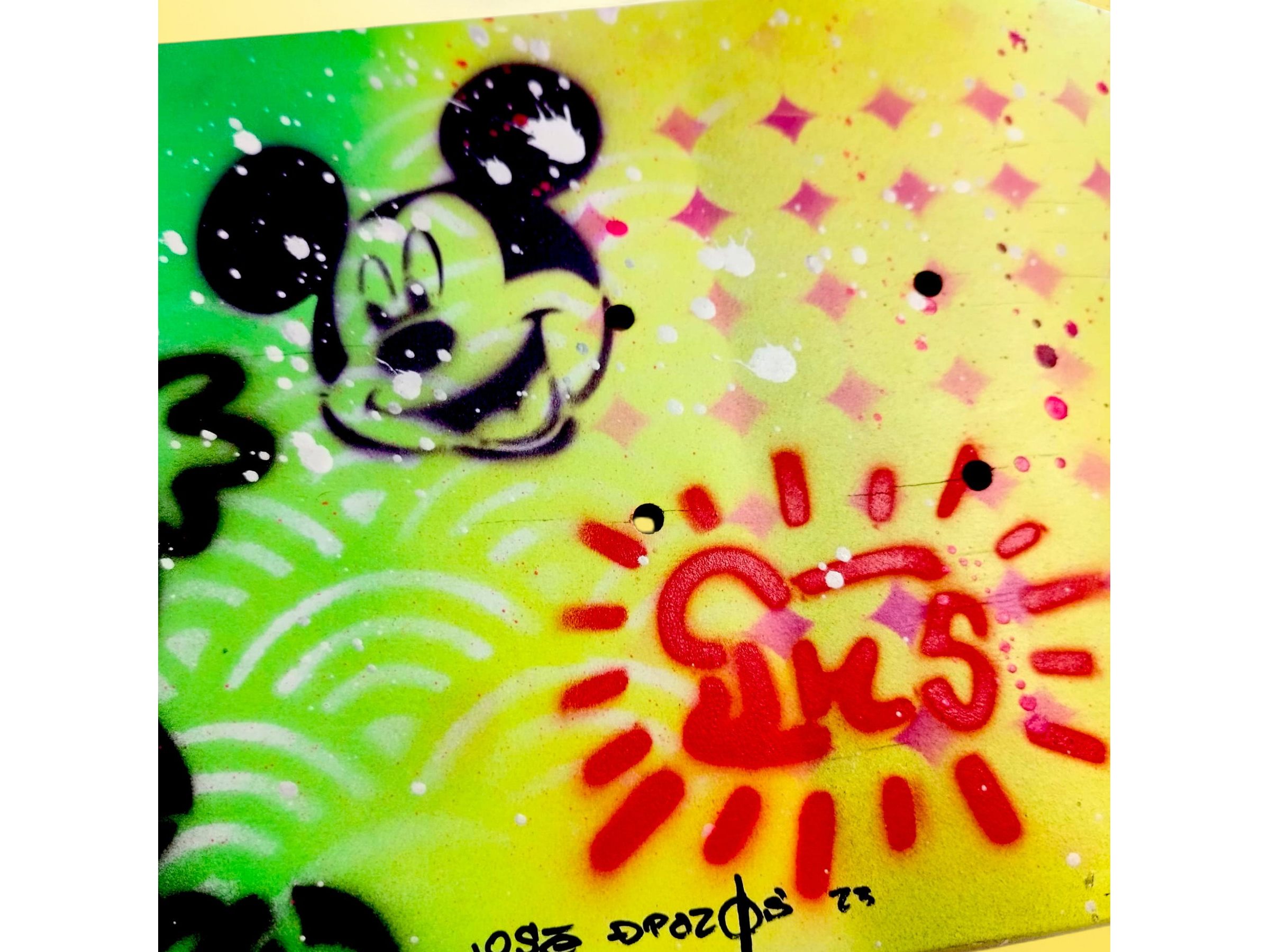 Waardering expert : € 400 - Handgesigneerd met certificaat en COA - Editie 3/3 - Gemaakt op gerecyclede skateboards uit Barcelona met spuitverf en inkt, met iconische afbeeldingen uit de popart, van Keith Haring, Banksy en Disney… - José de Pazos, geboren in Cádiz in 1976, debuteerde op slechts 17-jarige leeftijd in de kunstwereld met zijn eerste solotentoonstelling. - Zijn kunststudie, met een specialisatie in fotografie, leidde ertoe dat hij als fotojournalist werkte voor toonaangevende nationale en internationale bureaus. - Momenteel wijdt hij zich volledig aan grafisch ontwerp als CEO van een drukkerij en grafisch ontwerpbedrijf en aan het produceren van kunstwerken die wereldwijd aan muren hangen.- Gefascineerd door zowel popart als streetart, weerspiegelt hij dit in zijn werk door zijn personages, reclameontwerpen of popiconen met ironie te integreren, waarbij hij zich richt op de excessen en afwijkingen van de consumptiemaatschappij door middel van bekende merken en een gevoel voor humor om zijn boodschap over te brengen.- Door gebruik te maken van textuuroverlays met sjablonen, collages en diverse mixed media-technieken met acrylverf en spuitverf op verschillende ondergronden, is hun werk zeer herkenbaar en heeft het een kenmerkende stijl. Ze tonen hierin hun passie voor texturen en lagen als een observerende kunstenaar en verwerken dat gevoel in hun kunstwerken.
