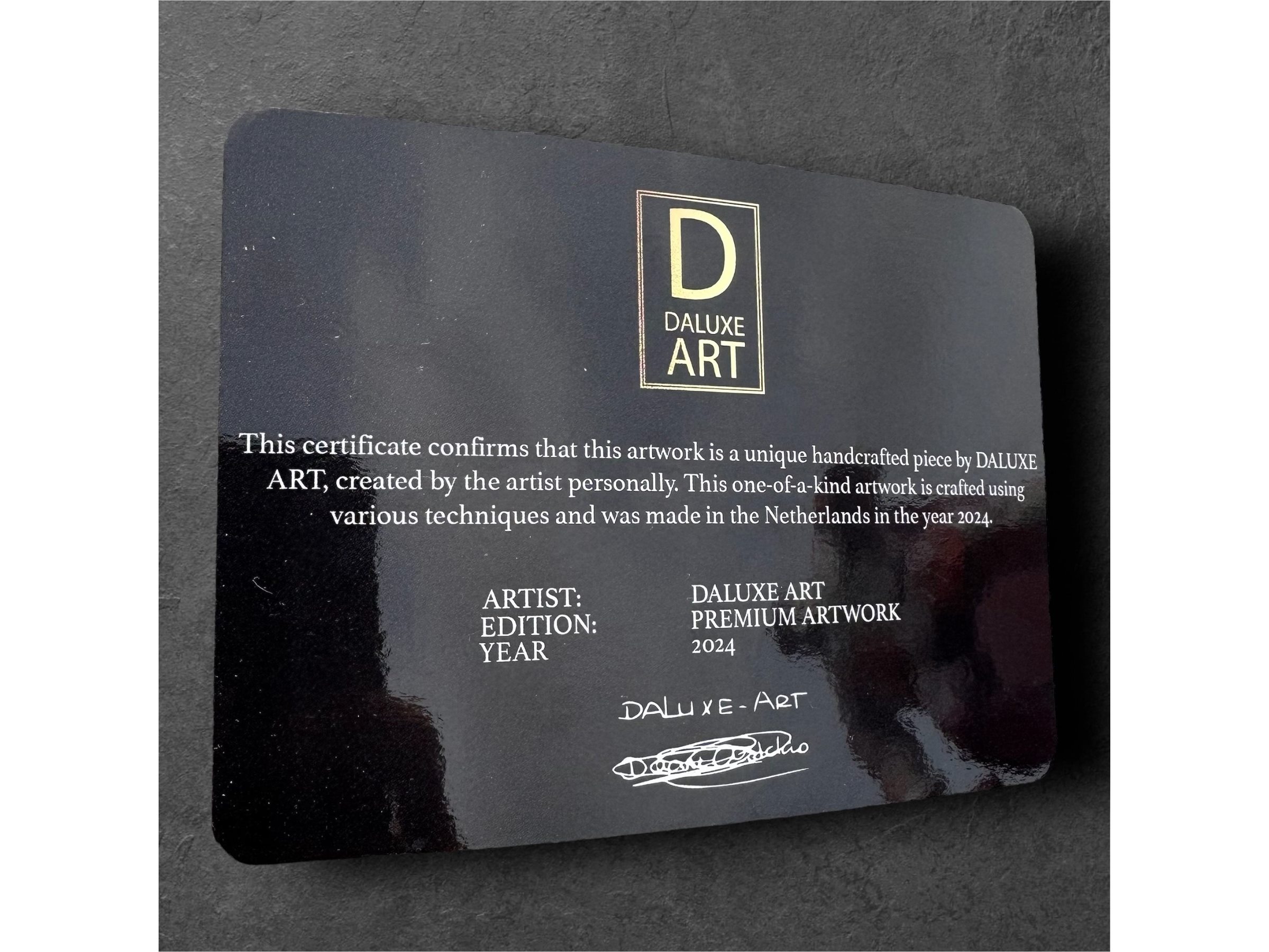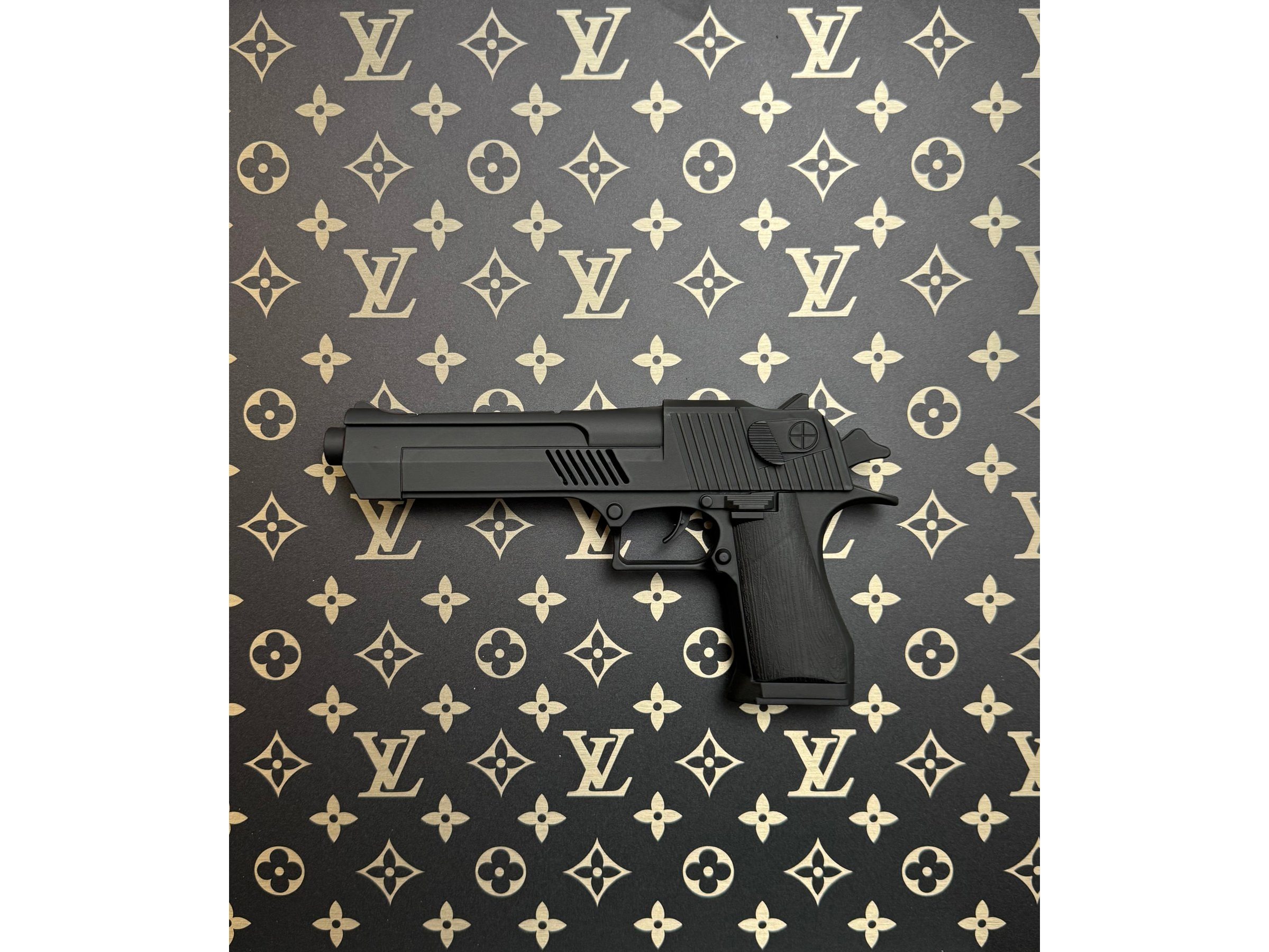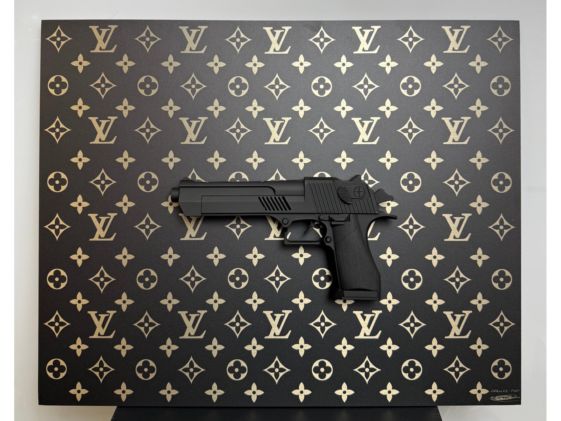 Waardering expert : € 1.200 - Inclusief handtekening en authenticiteitsbewijs en COA - Dit exclusieve popart-kunstwerk van Daluxe Art combineert luxe met rauwe kracht. Tegen een diepzwarte achtergrond verschijnt het iconische Louis Vuitton-monogram, strak en symmetrisch, afgewerkt met een goudkleurige metallic coating. In het midden van het werk staat een matzwarte 3D-sculptuur van een pistool, die direct de aandacht trekt met zijn strakke lijnen en minimalistische afwerking. - Het contrast tussen het herkenbare luxepatroon en het wapen creëert een krachtige dialoog: mode, status en macht komen hier samen in een iconische en provocerende compositie. Dit maakt het werk niet alleen een visueel statement, maar ook een gespreksonderwerp dat luxe en straatcultuur naadloos combineert. - Elk exemplaar is volledig handgemaakt, gesigneerd en genummerd door de kunstenaar. Bovendien is het kunstwerk voorzien van een luxe metalen Daluxe Art-plaat aan de achterkant als authenticiteitsbewijs. - Specificaties: Afmetingen: 50 x 40 cm. - Techniek: popart mixed media op paneel met een 3D-sculptuur - Kleuren: matzwart & metallic goud - Editie: Beperkt tot 25 exemplaren (dit werk is nummer 6/25) - Materiaal : Metaal