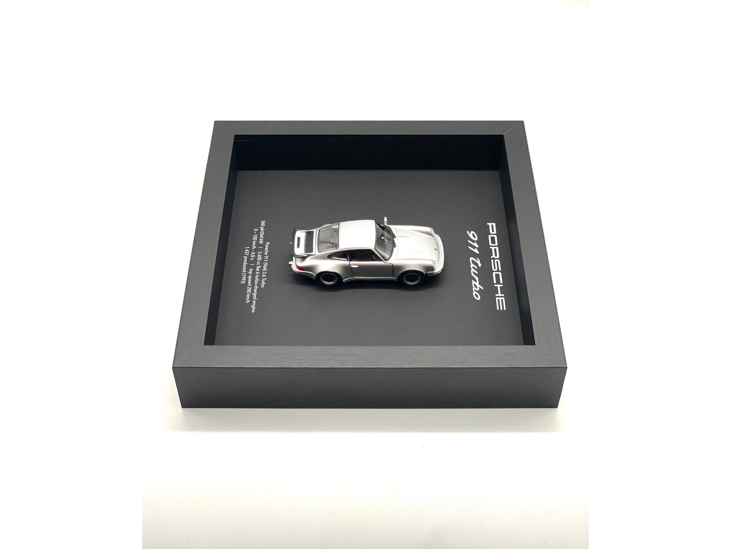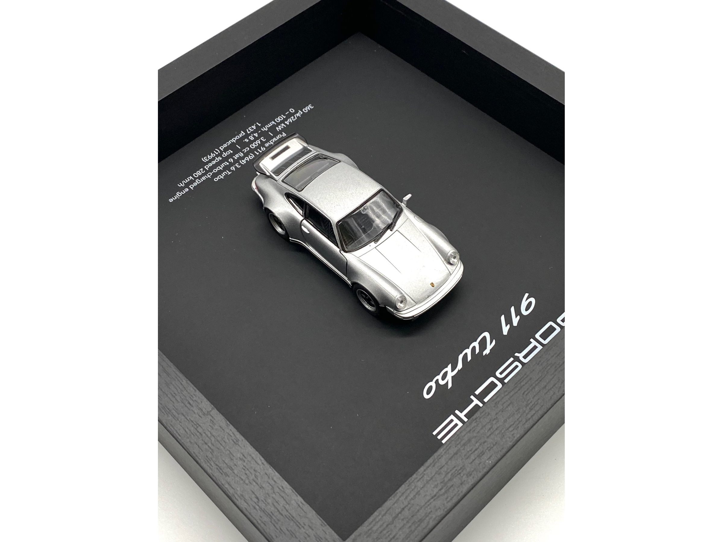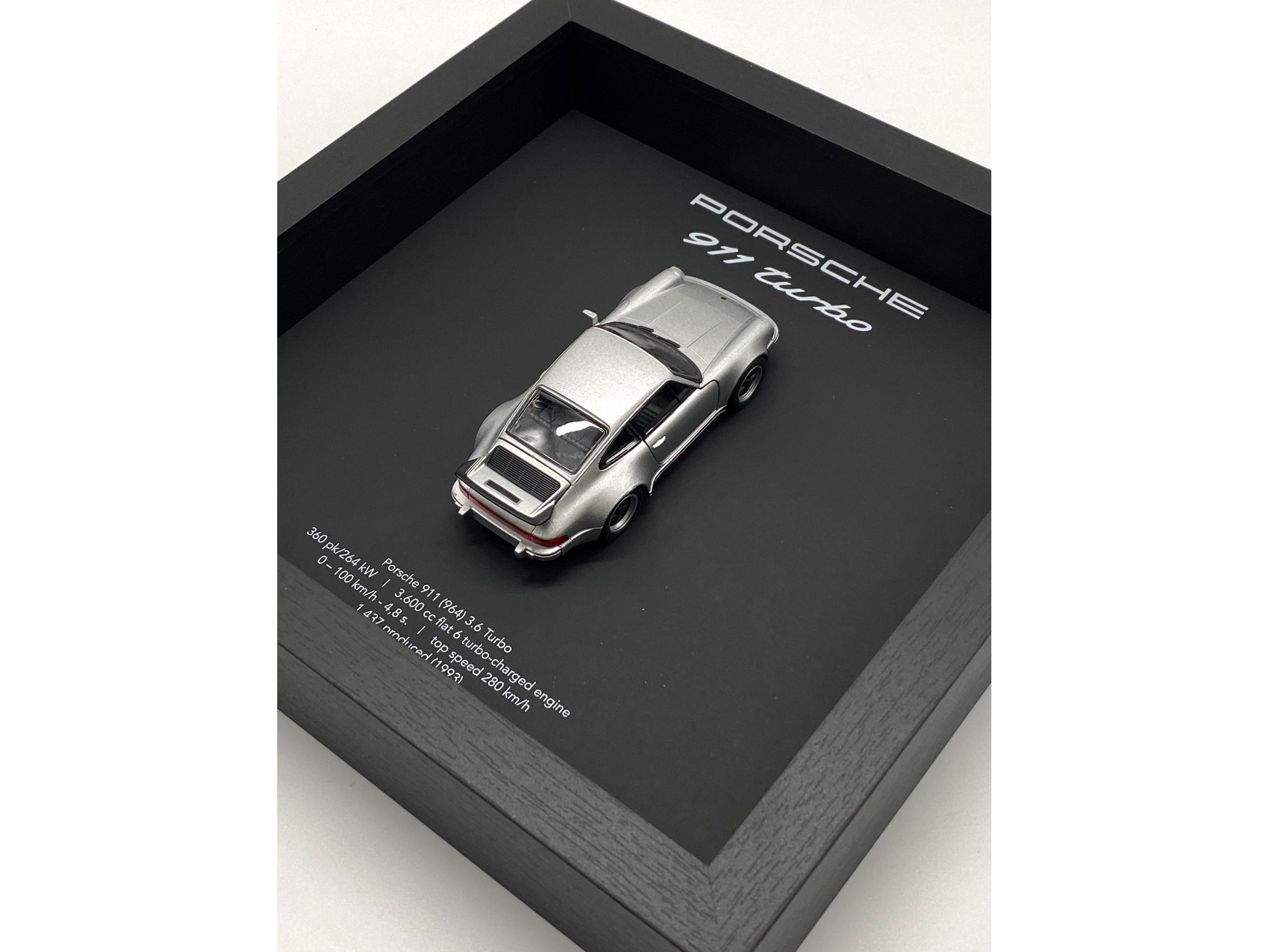 Waardering expert : € 200 - 3D-fotolijst met een Porsche 911 (930) Turbo uit 1975 - zilver - gelimiteerde oplage 28/50 stuks. - Een designstuk voor elke autoliefhebber en designfanaat. - Een prachtige en stijlvolle toevoeging aan elk interieur. - Lijst: zwart op zwart, 25x25x5 cm, hout/geen plexiglas. - De auto is nieuw, schaal 1/36. - Met COA