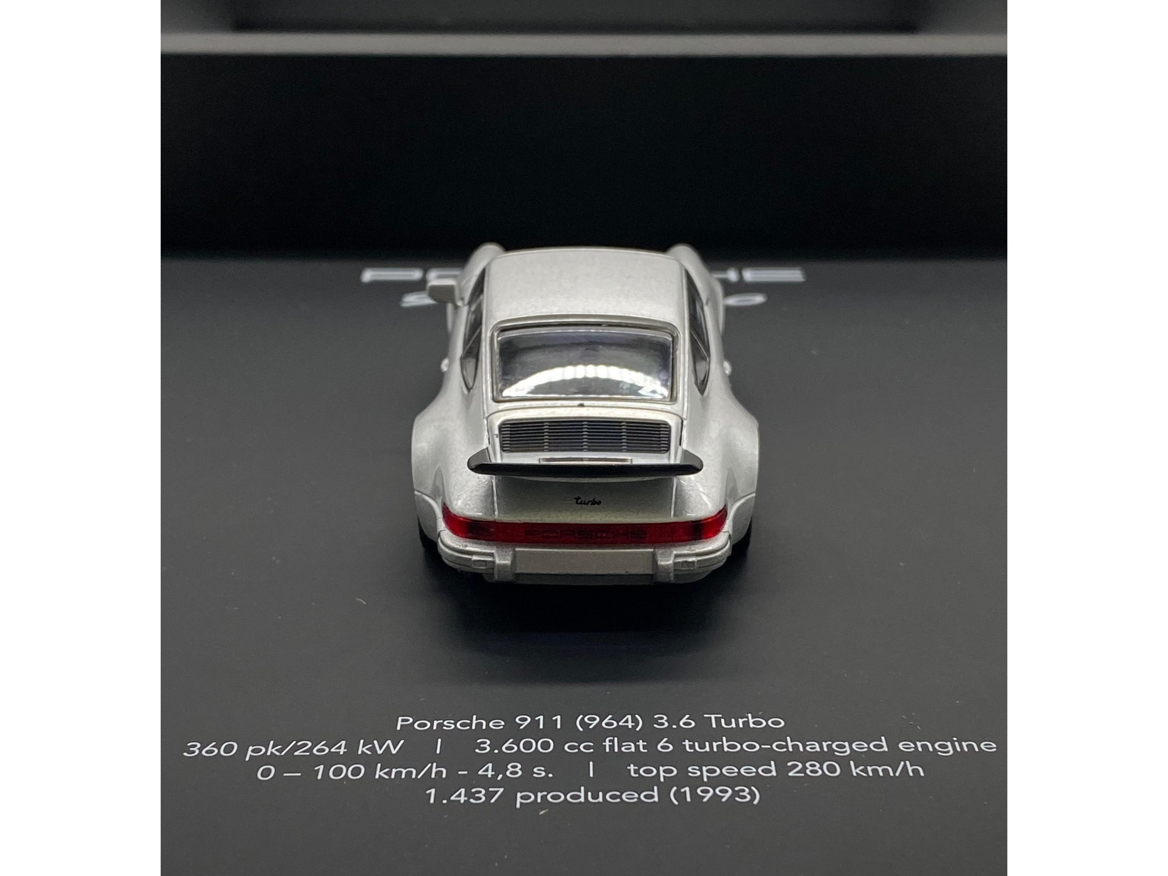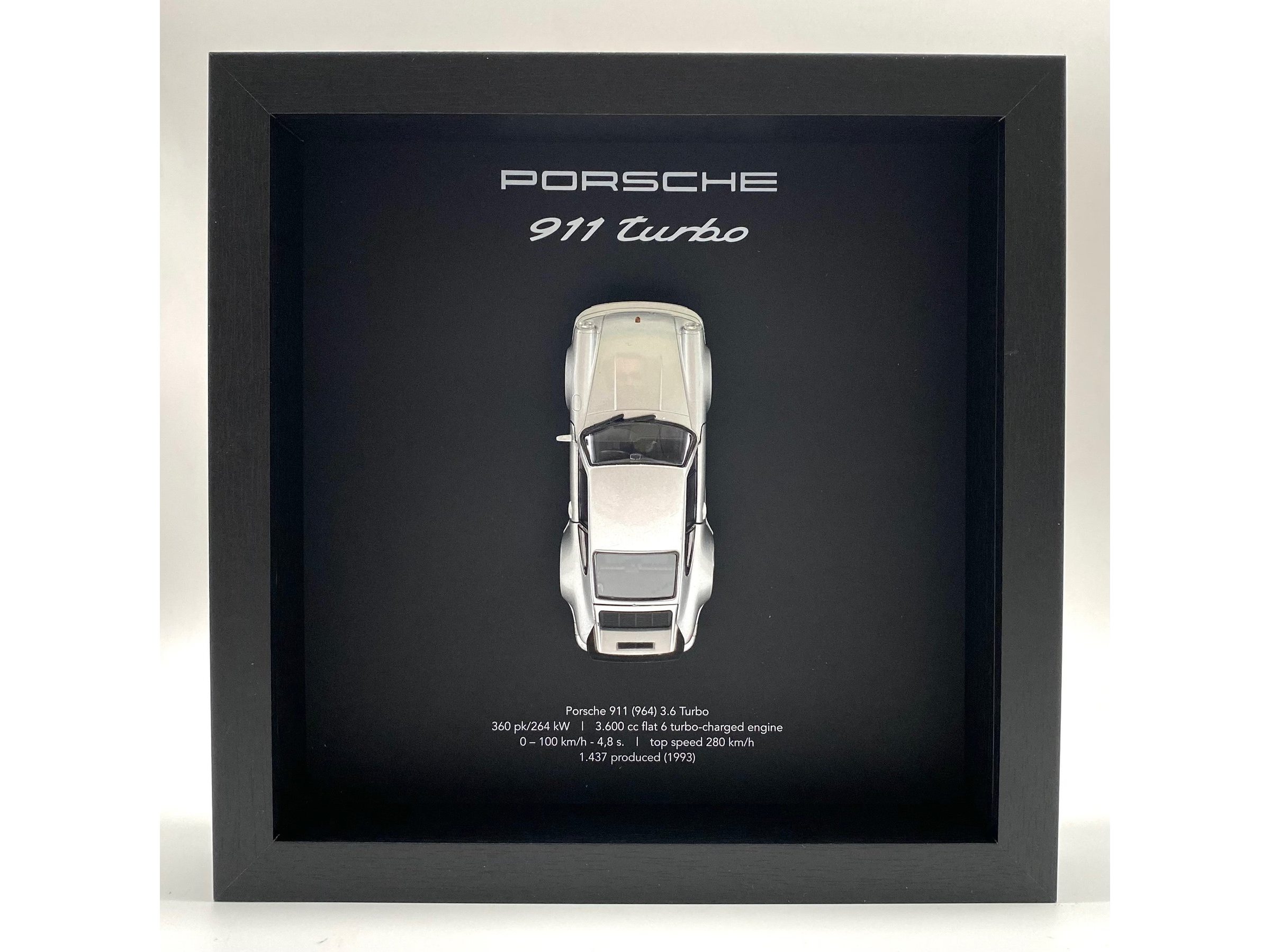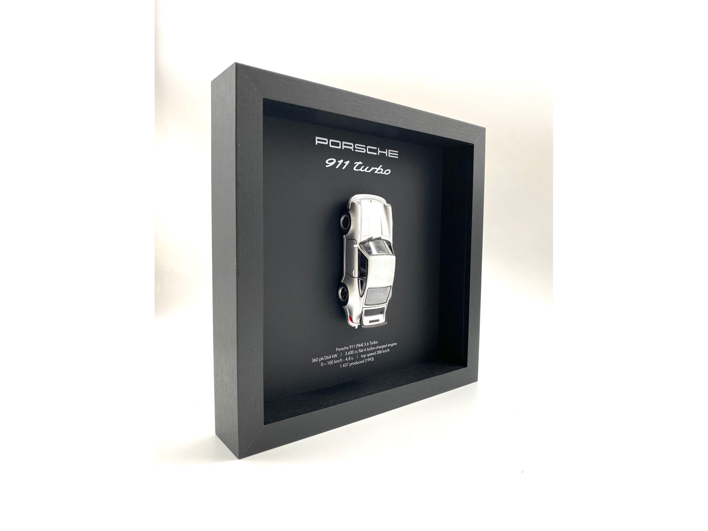 Waardering expert : € 200 - 3D-fotolijst met een Porsche 911 (930) Turbo uit 1975 - zilver - gelimiteerde oplage 28/50 stuks. - Een designstuk voor elke autoliefhebber en designfanaat. - Een prachtige en stijlvolle toevoeging aan elk interieur. - Lijst: zwart op zwart, 25x25x5 cm, hout/geen plexiglas. - De auto is nieuw, schaal 1/36. - Met COA