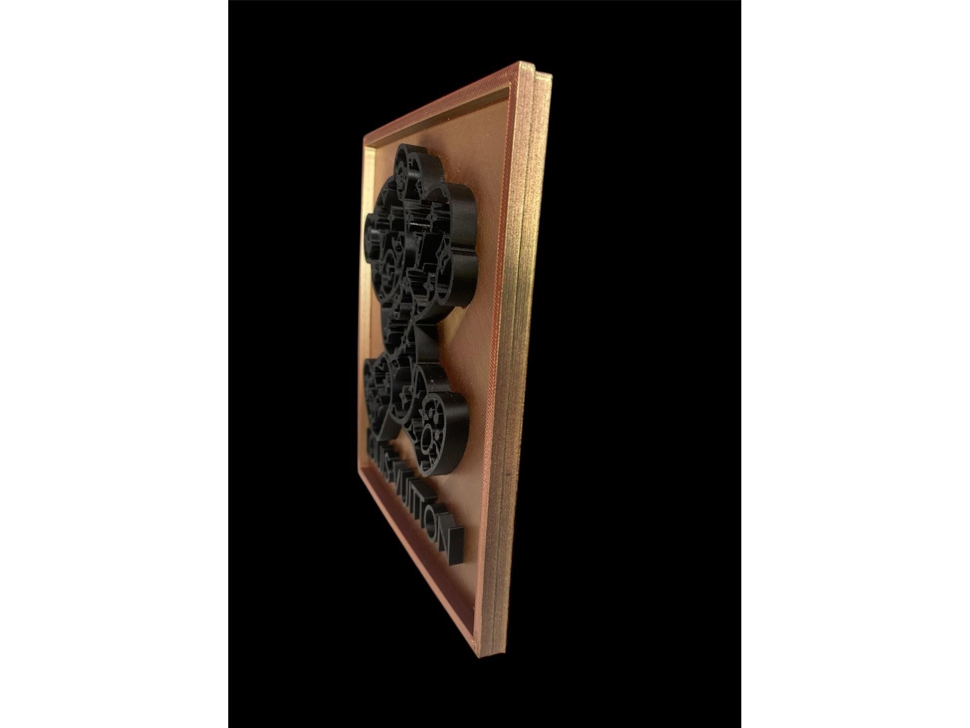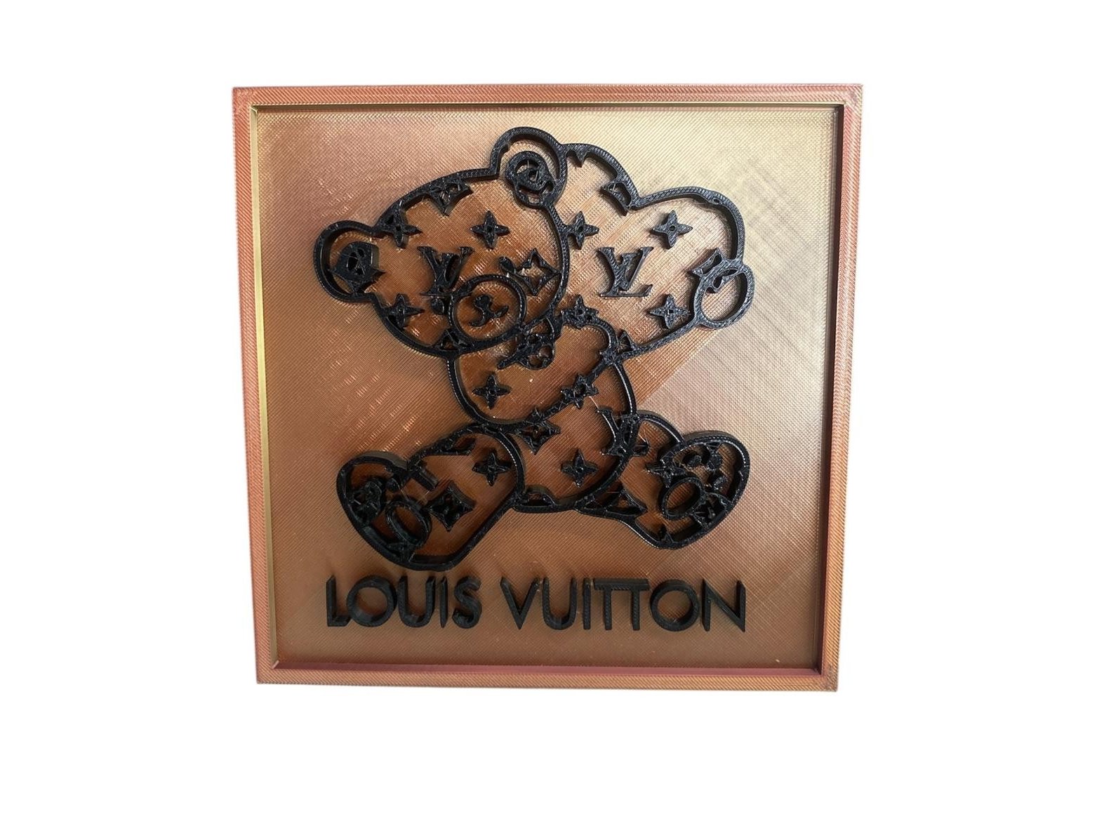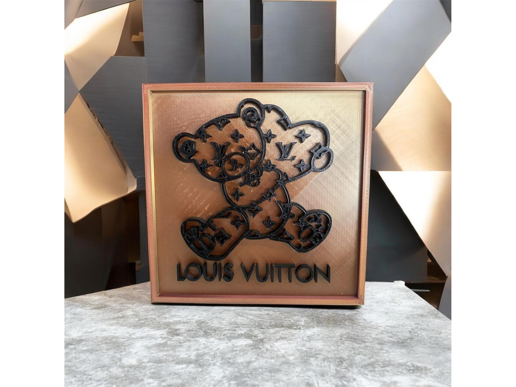 Artiest : Pi-XL - Louis Vuiton - 'Bear' - Handgesigneerd - Waardebepaling expert : € 495 - genummerde oplage 12/20 - Afm. : 17 x 17 cm. Exclusief 3D-Wandpaneel: 'Louis Vuitton' Pop-Art Bear. Voeg een vleugje high-fashion toe aan uw interieur met dit unieke wandobject. Dit kunstwerk combineert de wereld van luxe mode met een moderne pop-art esthetiek, uitgevoerd in een opvallende bronzen/gouden en zwarte kleurstelling. Geleverd met Coa.