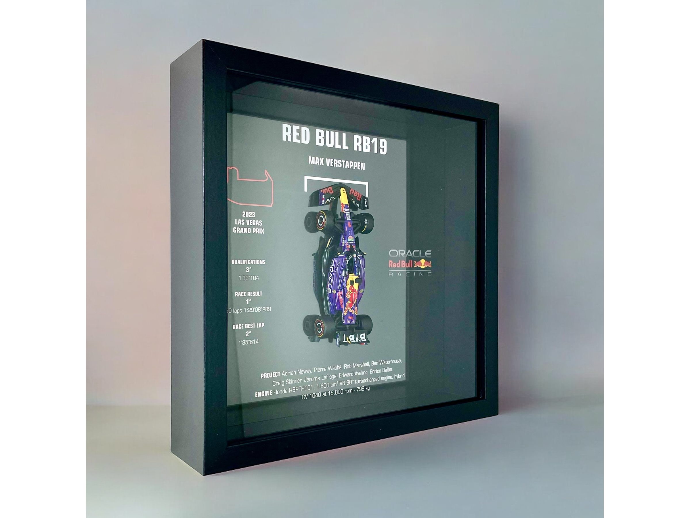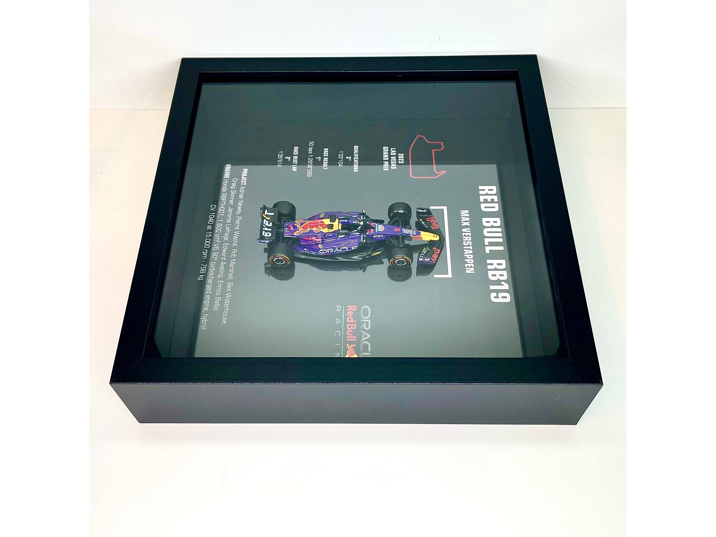 Een waardevol stuk voor echte kenners en motorsportfanaten. Uitstekend als cadeau of voor verzamelaars, kan aan de muur worden gehangen of op een plank worden geplaatst. Gedetailleerde miniatuur op schaal 1/43 van de RED BULL RB19. Gelamineerd in plexiglas en omsloten door elegant gehard glas voor een unieke uitstraling. Een lust voor het oog. Dankzij deze unieke editie haalt u een stukje Formule 1-geschiedenis in huis. Exclusieve uitvoering ter ere van de magnifieke overwinning van de LAS VEGAS GRAND PRIX door MAX VERSTAPPEN. Gesigneerd en uitgevoerd in beperkte oplage door XRACE en handgesigneerd.