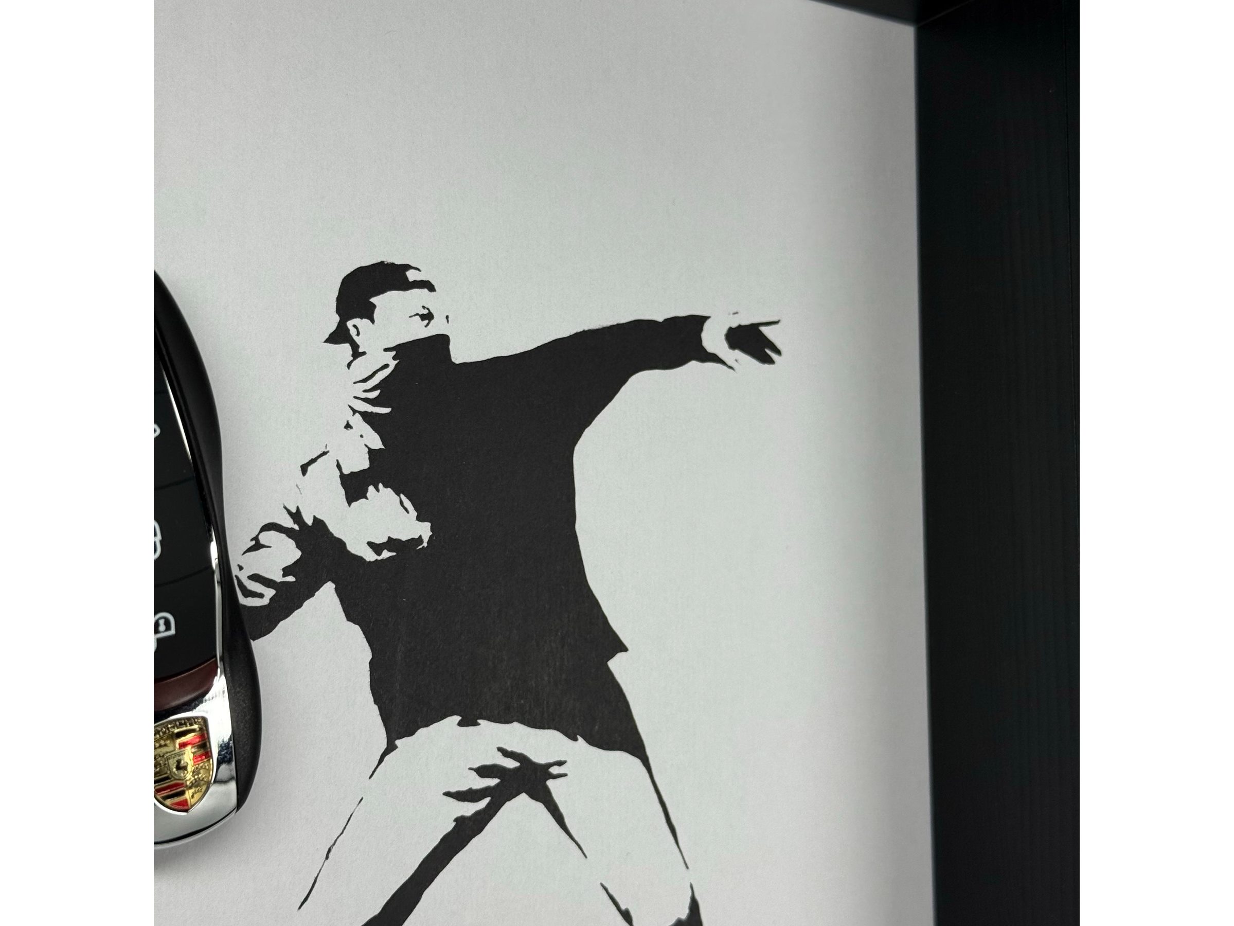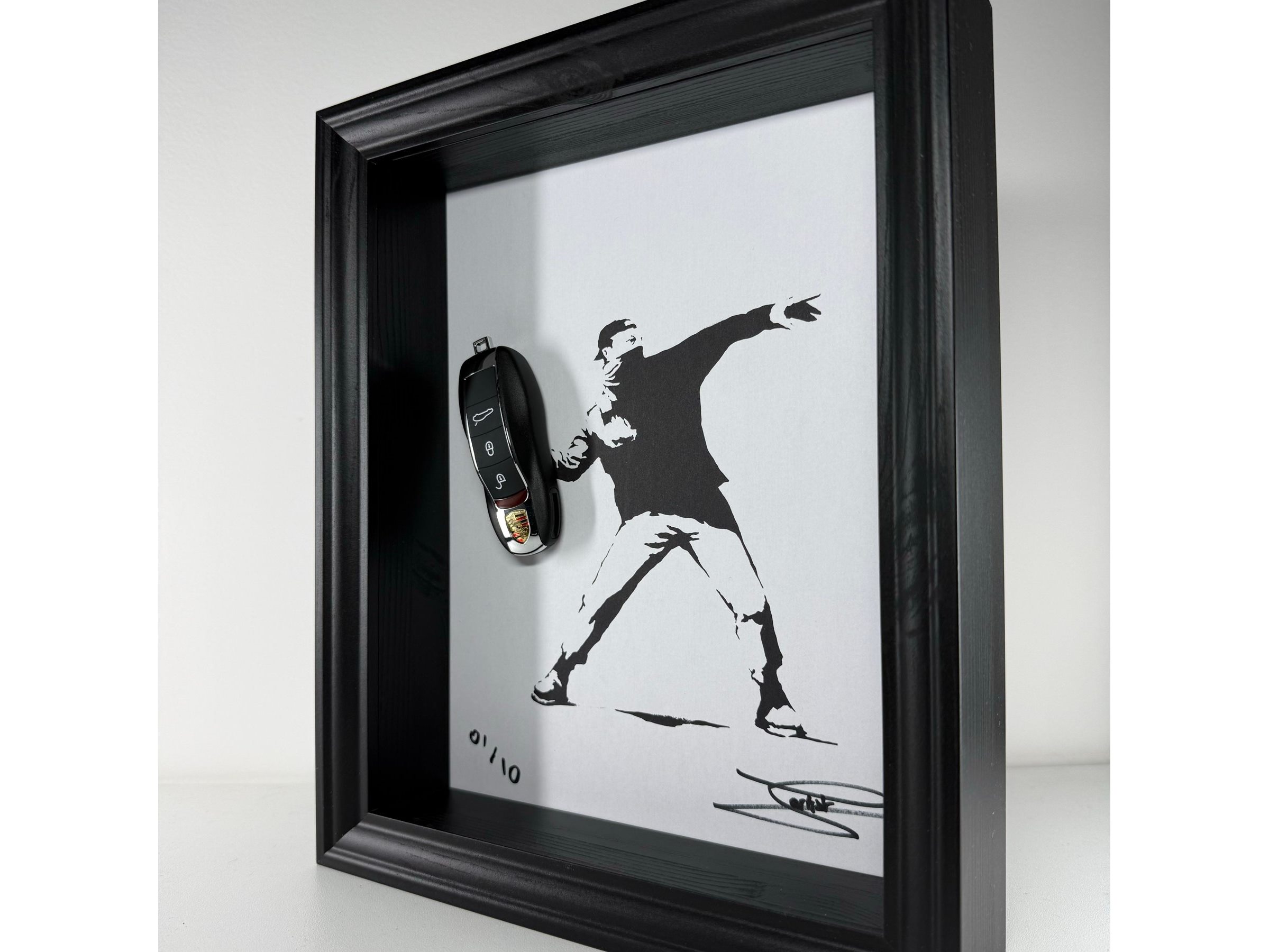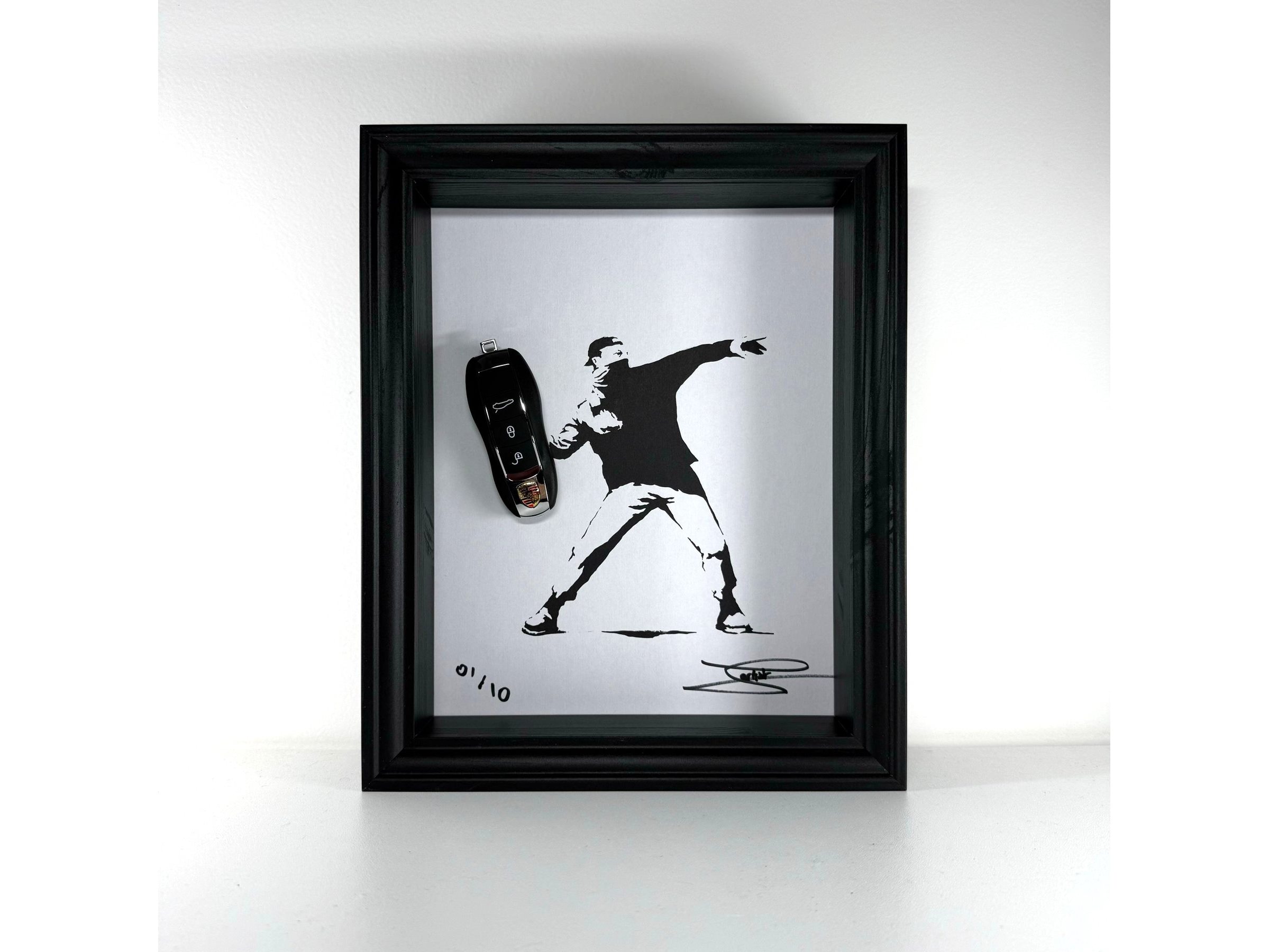 Waardering expert : € 300 - Met dit werk herinterpreteert Cartist het icoon van Banksy door er een Porsche-sleutel in te verwerken. De revolutionaire daad wordt hier een symbool van prestatie en exclusiviteit, waarmee de stedelijke verbeelding wordt verbonden met de automobiele mythologie van Duitsland. - Volledig met de hand vervaardigd in Frankrijk door Cartist, speelt het werk met het contrast tussen subversie en auto. - Jean Tourangin (Cartist) vernieuwt de hedendaagse kunst door erfgoed uit de schilderkunst te combineren met mythes uit de automobielwereld. Zijn exclusieve werken belichamen een zeldzame en gewilde esthetiek. - Werk geleverd met lijst en hoogwaardig synthetisch glas - afm. 28 x 23 x 6 cm. - Beperkte en genummerde oplage - Met certificaat, COA en handgesigneerd.