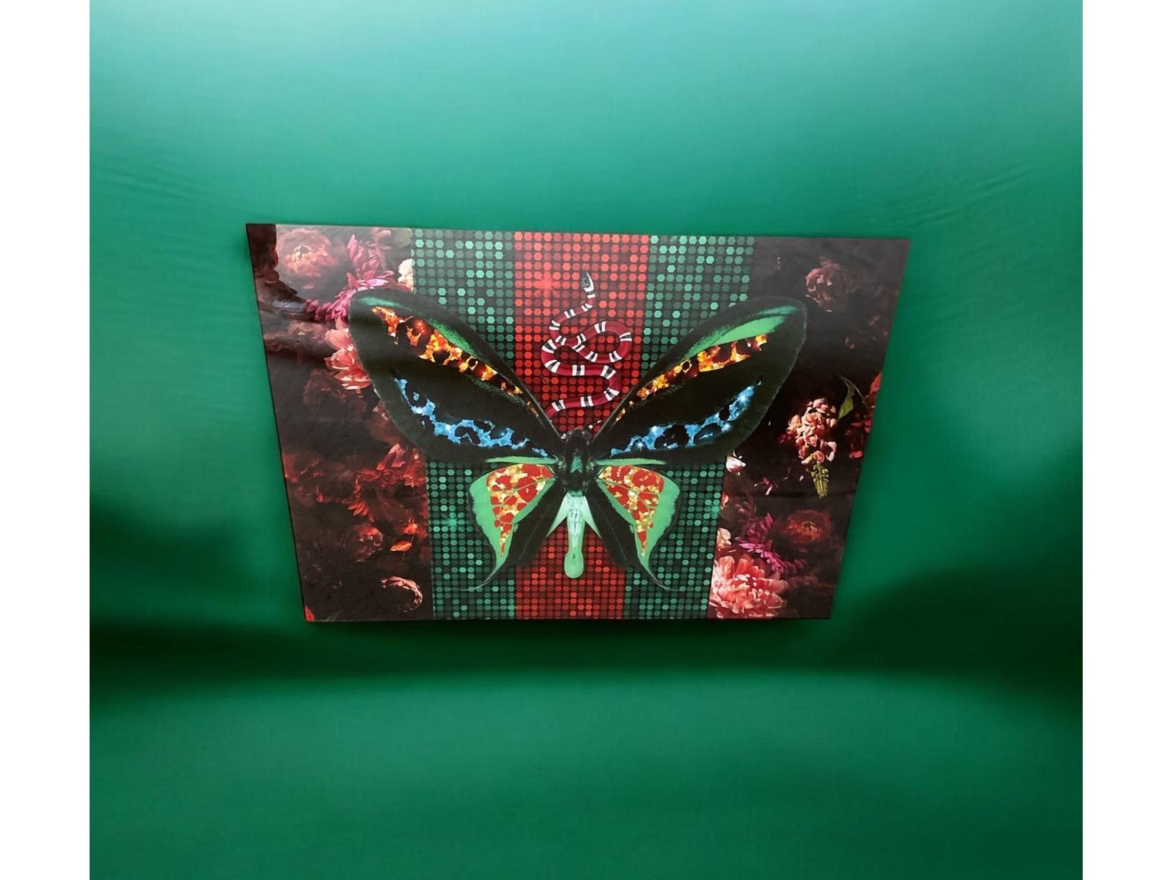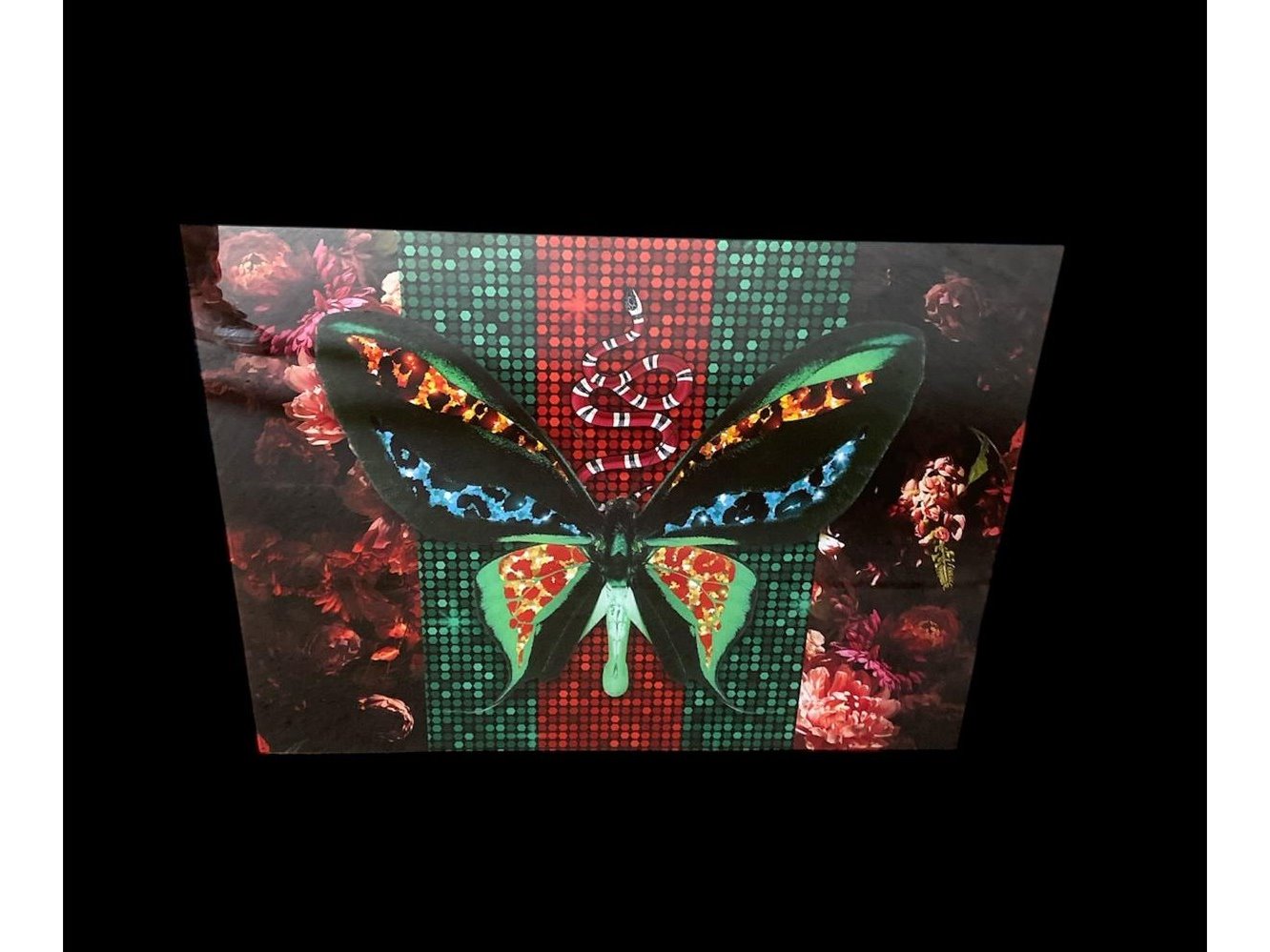 Print op glas - 'GUCCI' - Genummerd 7/10 - Handgesigneerd met COA - Artiest Pi-XL - Afm. 80 x 60 cm. x 4 mm. - Waardebepaling expert : € 995 - Laat je interieur spreken met deze opvallende en artistieke print op glas. Centraal in het ontwerp staat een prachtig gedetailleerde vlinder, rijk aan kleur en contrast, die symbool staat voor transformatie, vrijheid en schoonheid. De combinatie van diepe, warme bloemtonen met een krachtig grafisch patroon op de achtergrond geeft dit kunstwerk een unieke en eigentijdse uitstraling. De levendige kleuren – variërend van intens rood en groen tot subtiele accenten van blauw en goud – zorgen voor een dynamisch geheel dat direct de aandacht trekt. Ophangmogelijkheden voorzien.