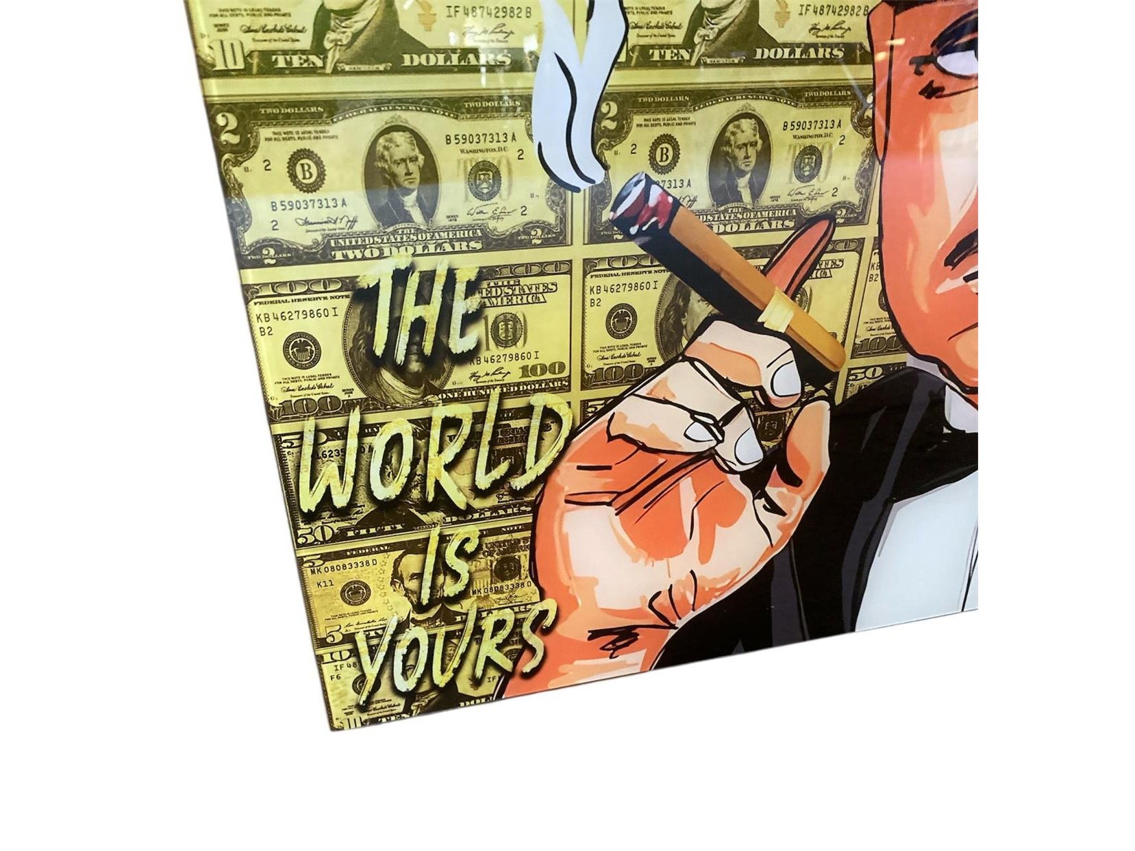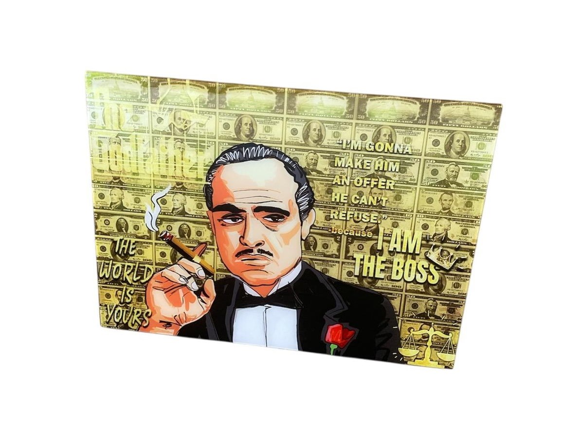 Print op glas - 'The Godfather' - Genummerd 6/10 - Handgesigneerd met COA - Artiest Pi-XL - Waardebepaling expert : € 995 - Afm. 80 x 60 cm. x 4 mm. Zet een icoon uit de filmgeschiedenis aan je muur met deze unieke en opvallende glass print van The Godfather. Het is het perfecte statement piece voor fans en verzamelaars van cultklassiekers. Met de iconische quotes "The World is Yours" en "I'm gonna make him an offer he can't refuse" en een achtergrond van dollarbiljetten, straalt deze print pure macht en ambitie uit. Het strakke glazen design geeft het bovendien een moderne twist. Met deze The Godfather glass print heb je niet alleen een tijdloos kunstwerk aan je muur, maar ook een stukje filmgeschiedenis waar je elke dag van kan genieten. En vergeet niet: "A man who doesn't spend time with his family can never be a real man." Maar zeg nou zelf, tijd doorbrengen met je familie wordt toch veel leuker met deze stoere print aan de muur? Ophangmogelijkheden voorzien.
