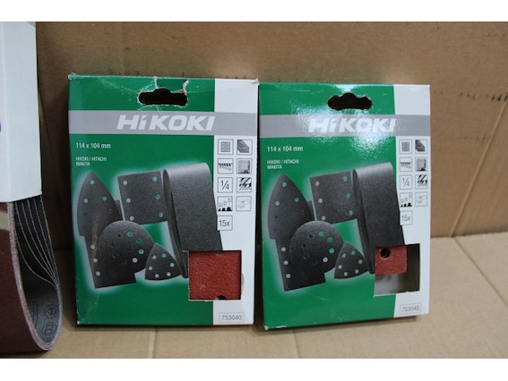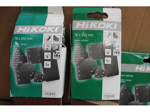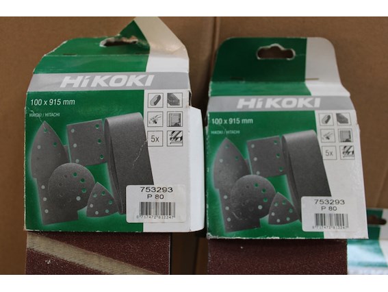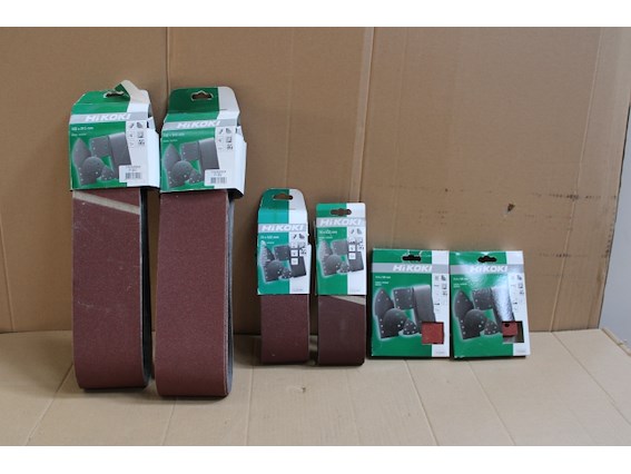 Plm 6 stuks, Partij Hikoki schuurpapier, 2 x SCHUURPAPIER SET 114X104MM K60,80,120 (15 ST), SCHUURBAND SET 76X533MM K60,80,120 (6 ST), SCHUURBAND 76X533 K100 (5 ST)(OUD 750857), 2 x SCHUURBAND 100X915 K80 (5 ST)