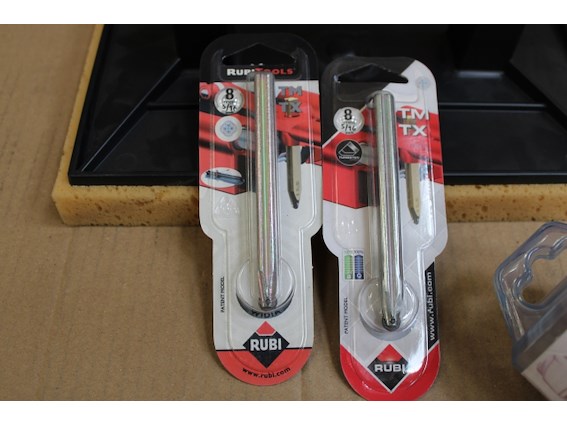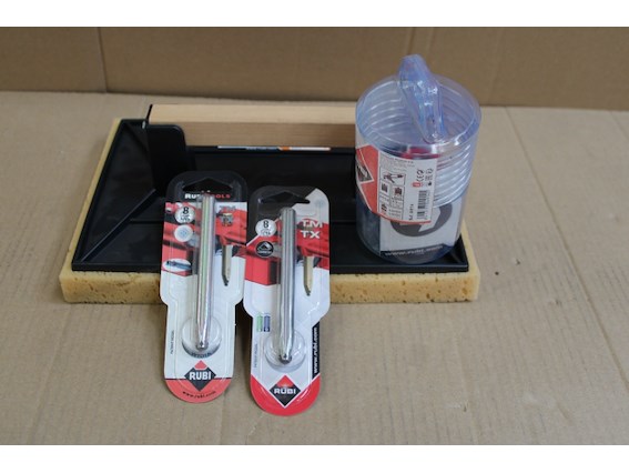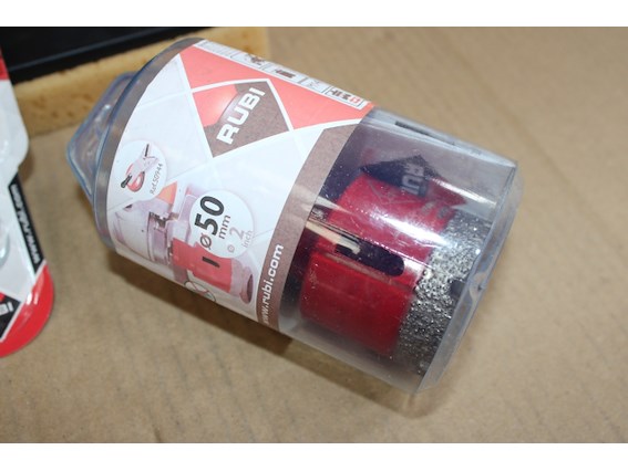 Plm 4 stuks, Partij Rubi Tools, 1 x Rubi DRYGRES-BOOR Ø 50 mm + 2 x Rubi WIDIA SNIJWIELTJE IN HOUDER Ø 8 mm. PLUS + 1 x Rubi kunststof sponsspaan plus