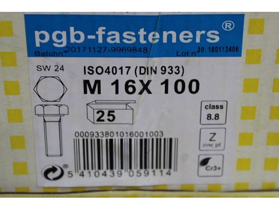 Ongebruikt, 2 x PGBfast Zeskanttapbout 8.8 DIN 933 M16x100 Zn/25