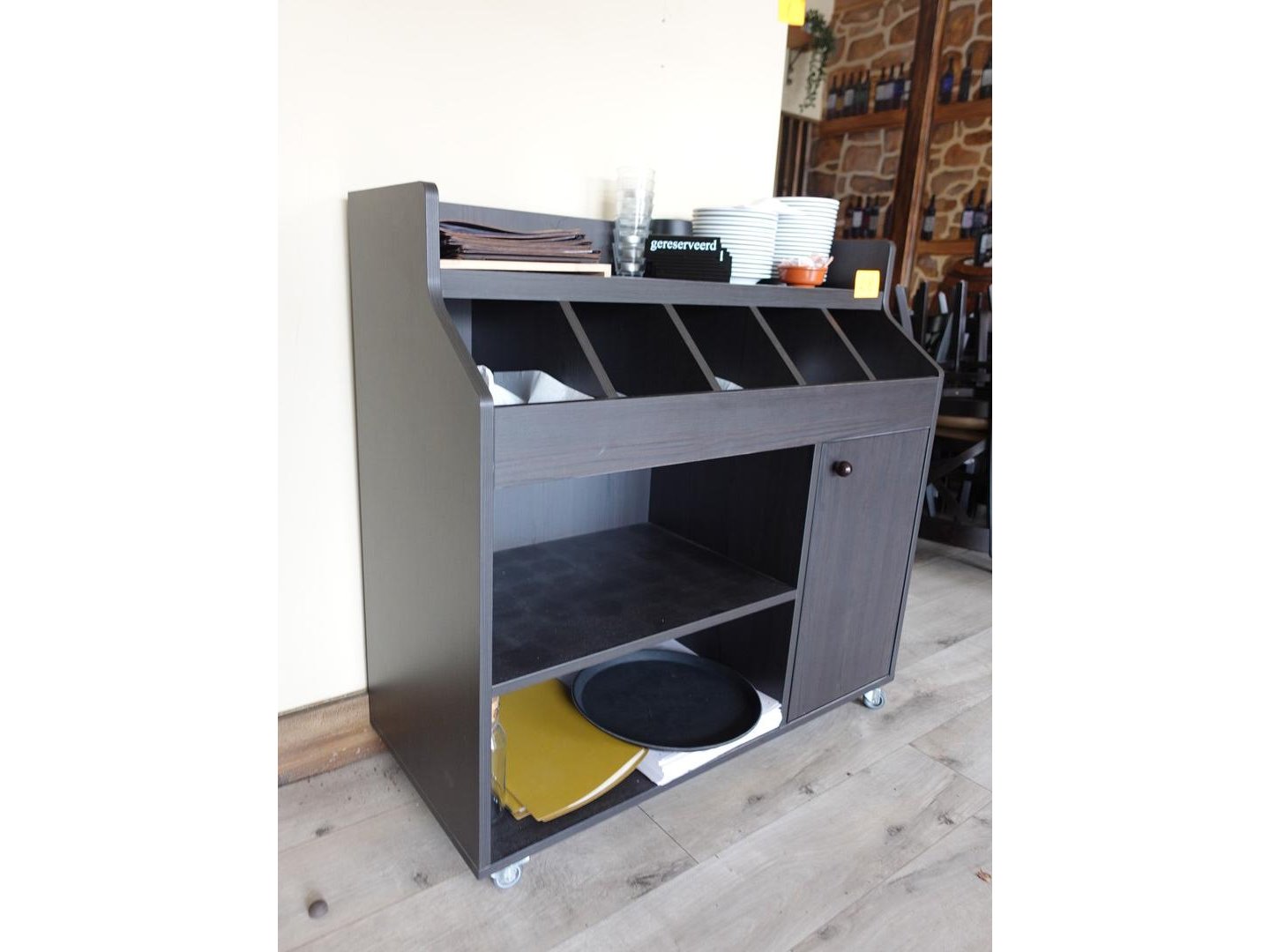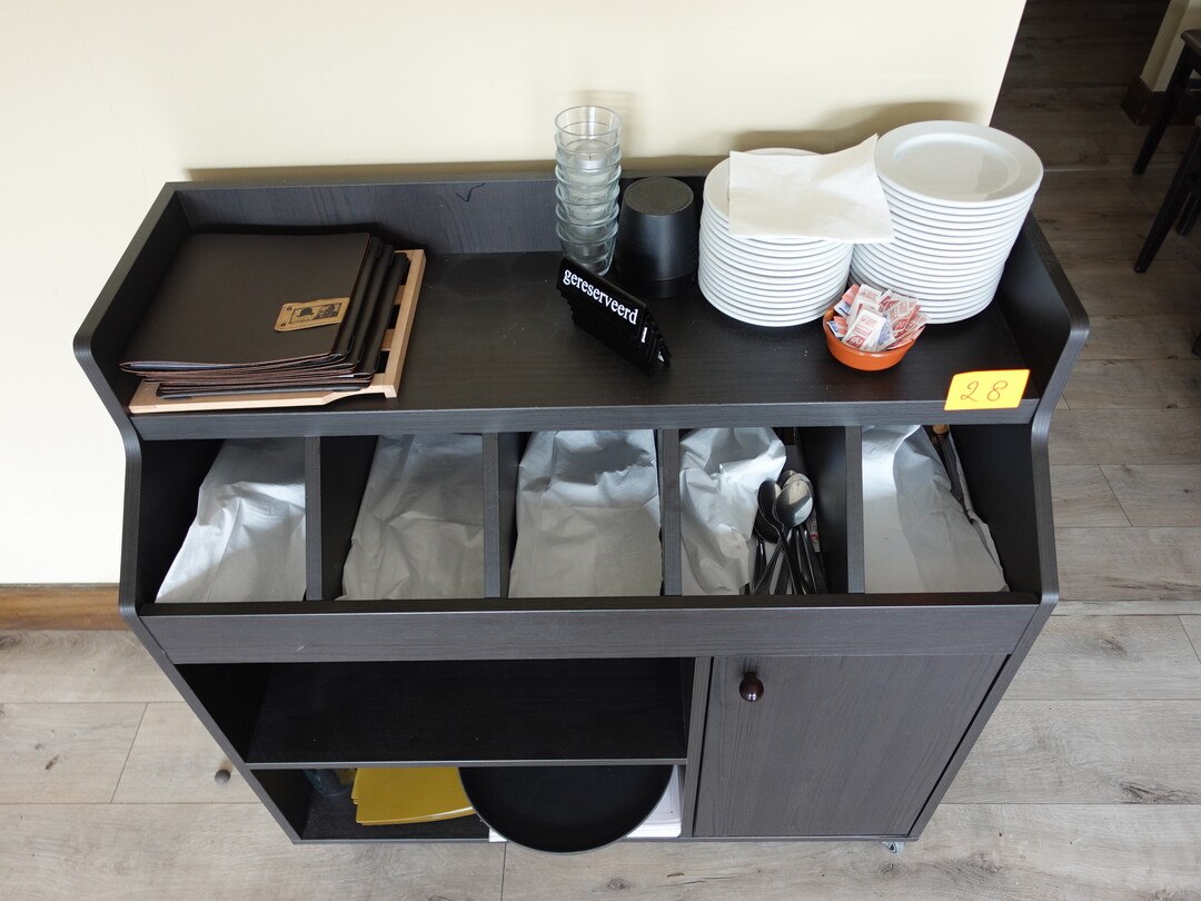 Verrijdbare houten buffetkast + inhoud