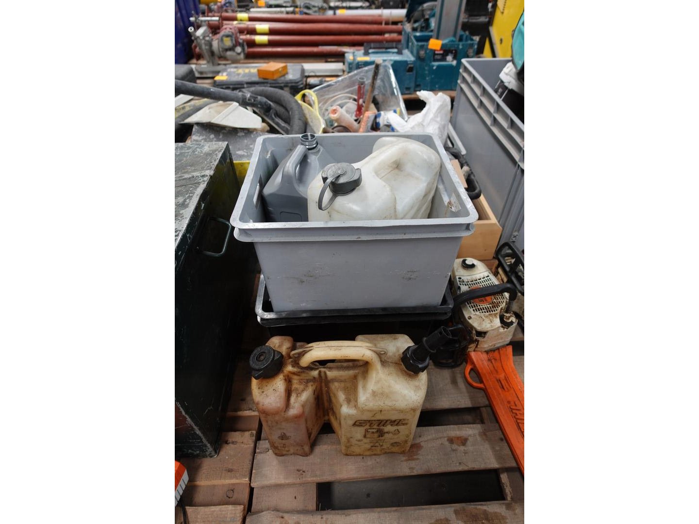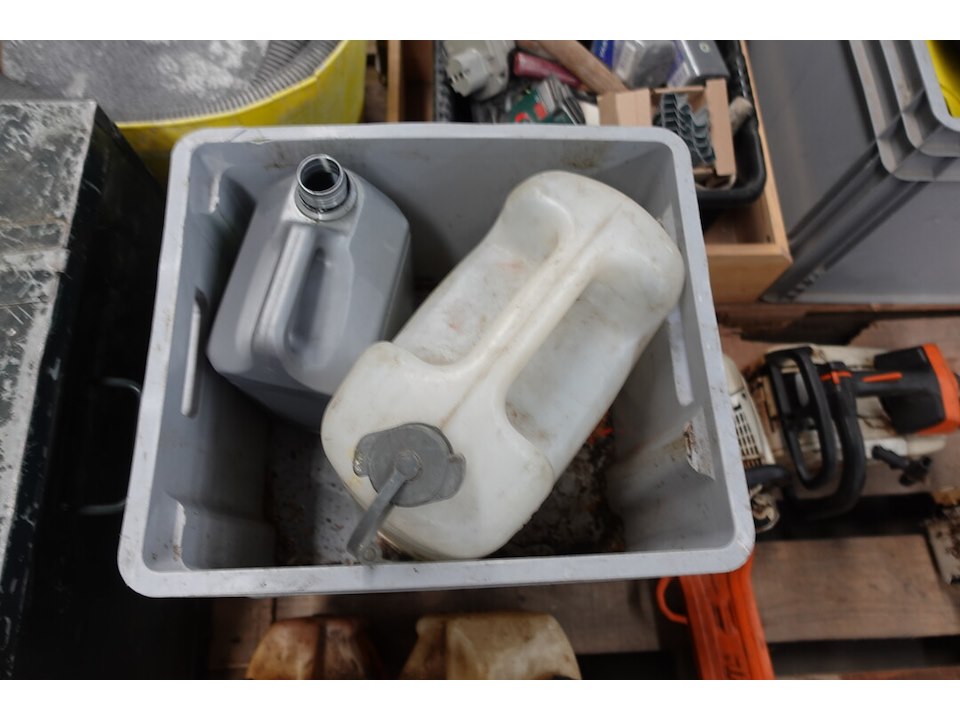 OA: bidons: benzinekettingzaag + onderdelen<br /> locatie: A13