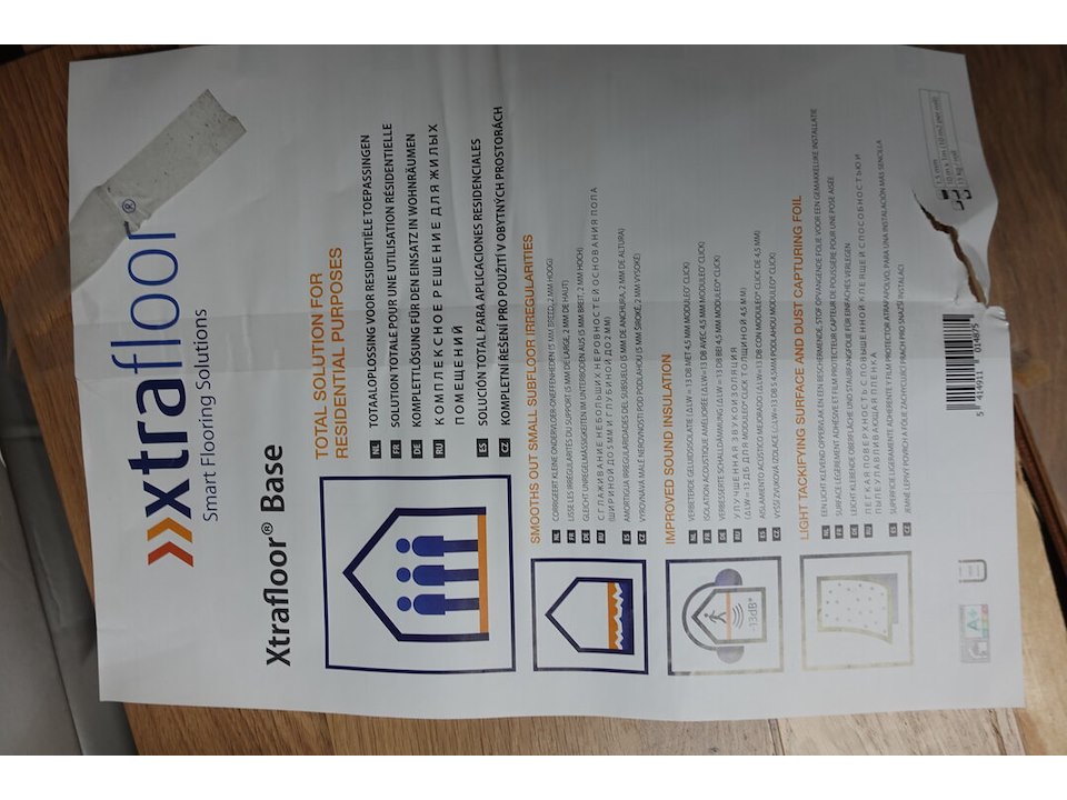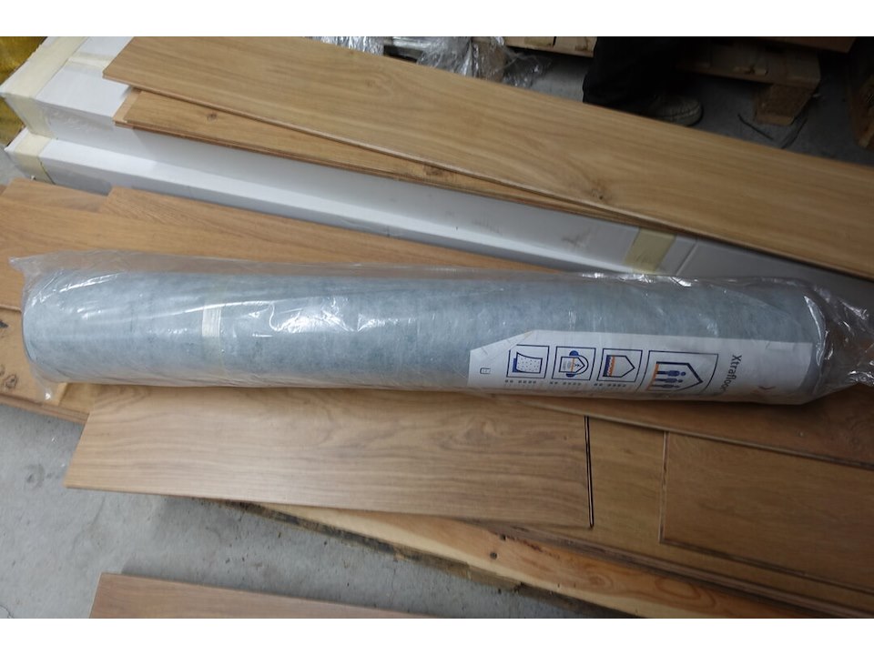 Type: Xtrafoor Base, 40 rollen, plm 400 m2<br /> locatie: ruimte achter magazijn