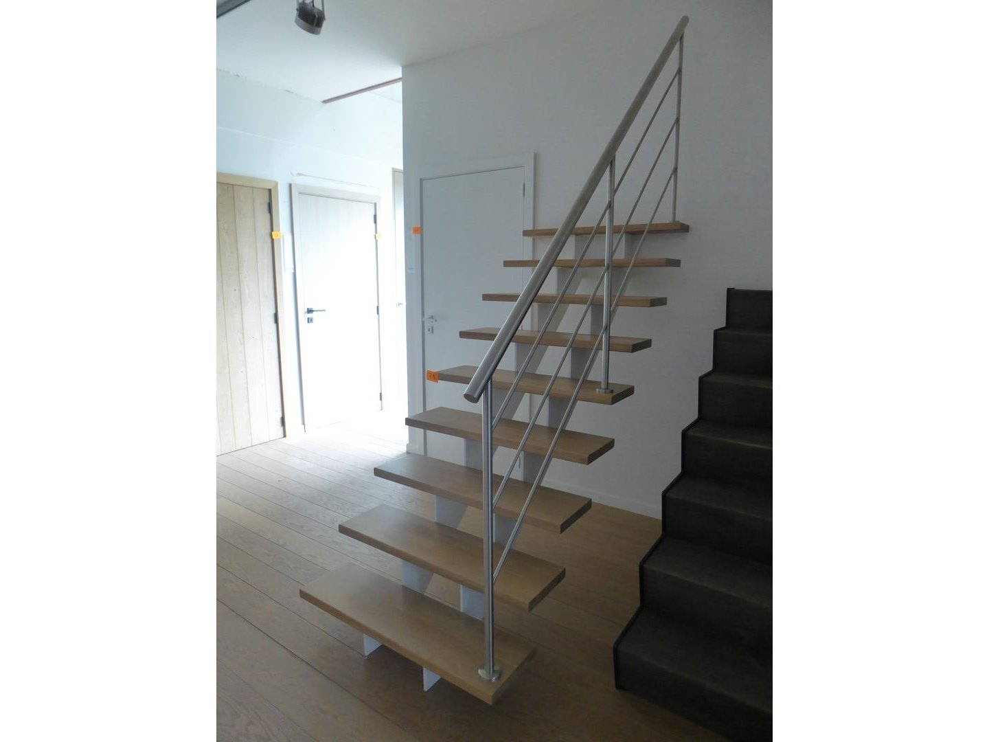 Metalen trap met houten treden en metalen leunig