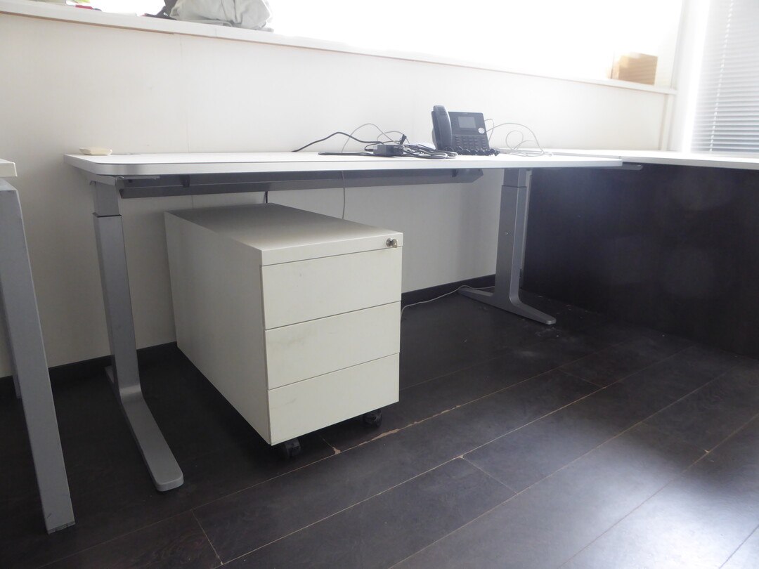 3 x bureautafel waarvan 1 in hoogteverstelbaar, 1600x800 1800x800 1600x800, dossierkast + inhoud