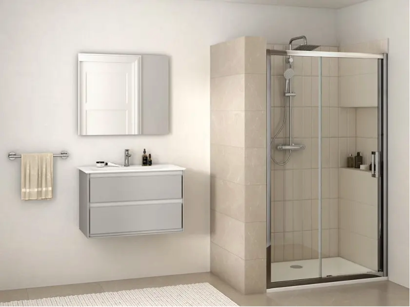Schuifdeur voor nis of voor combinatie met vaste wand<br /> <br /> aantal : 1 stuks<br /> Conditie: nieuw<br /> Nieuwprijs 710 euro/ stuk<br /> <br /> tweedelig<br /> reversibele ontwerp<br /> afmeting: 1200 x 1950 mm<br /> instelling: 1170 - 1220 mm<br /> veiligheidsglas, dikte 6 mm<br /> vulling: helder glas<br /> geleverd met Ideal Clean<br /> glanzend zilveren profielen<br /> massief verchroomd handvat 225 mm<br /> horizontale afstelling: 25 mm per profiel<br /> syseem Click and Clean, soepel lopende wielen<br /> kan worden gecombineerd met douchebakken of rechtstreeks op tegels worden geïnstalleerd<br /> Kan afzonderlijk in een nis worden geïnstalleerd of in combinatie met een vaste zijwand.
