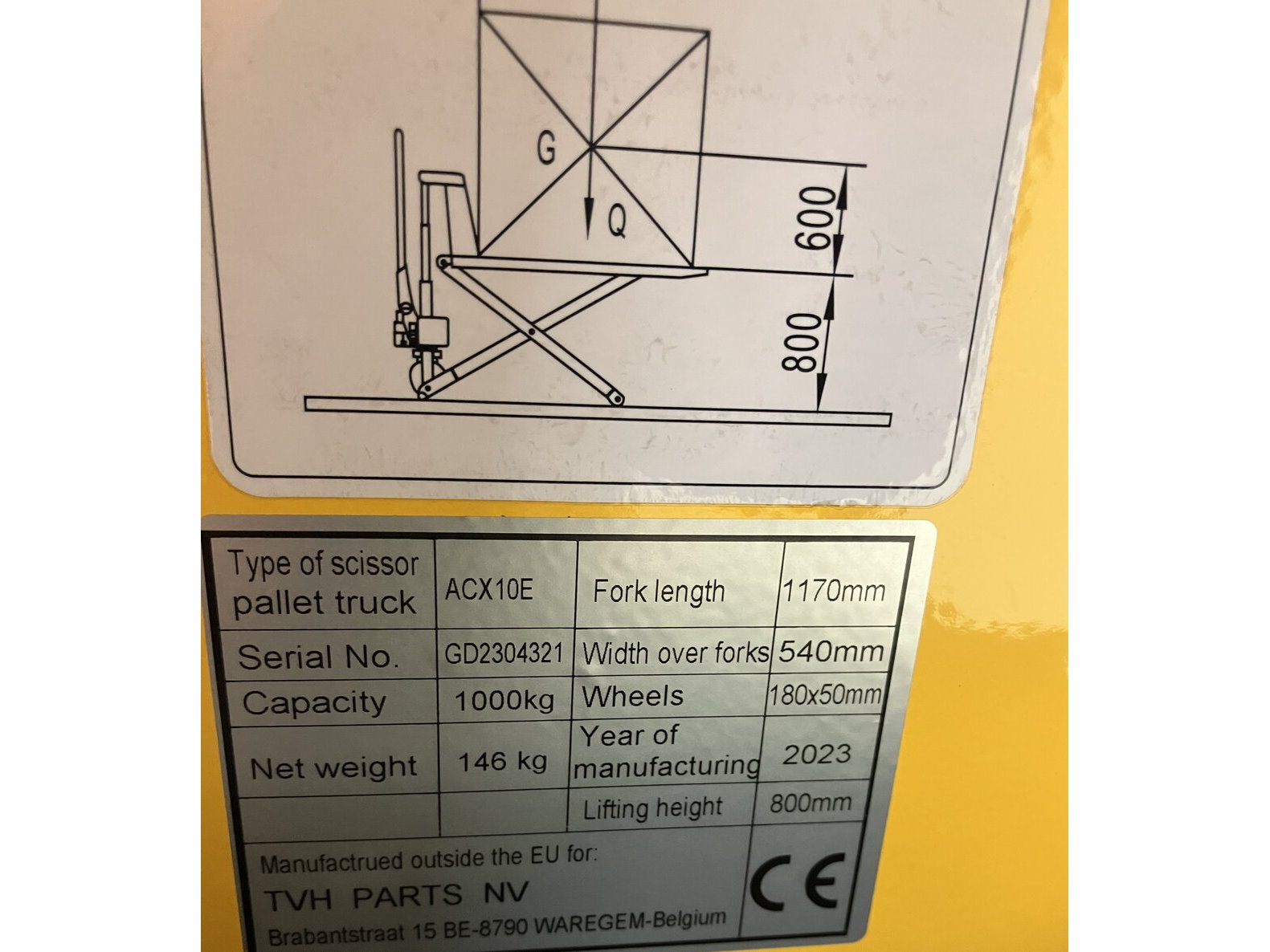 Lift hoogte: 800mm - Vork lengte: 1170mm - Breedte over de vorken: 540mm - Wielen: 180x 50mm - Bouwjaar: 2023 - Netto gewicht: 146kg - Conditie: Nieuw<br /> Nieuw