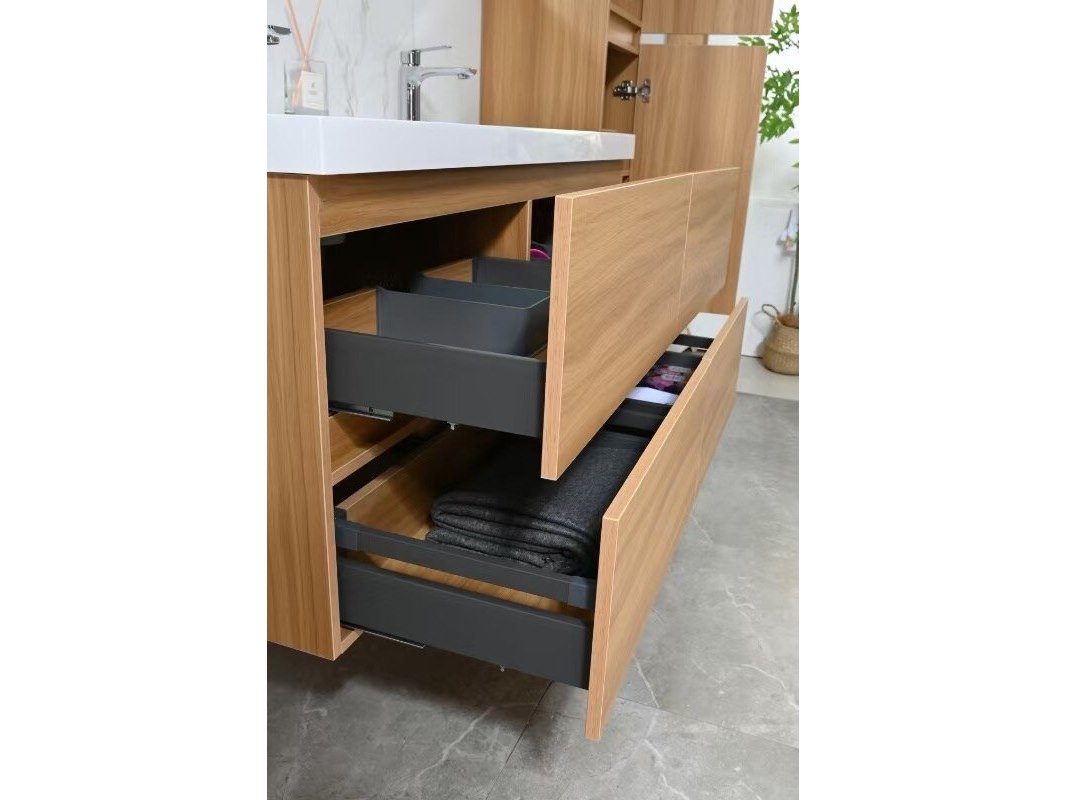120 cm - Licht hout decor + witte dubbele wasbak - Incl. kranen