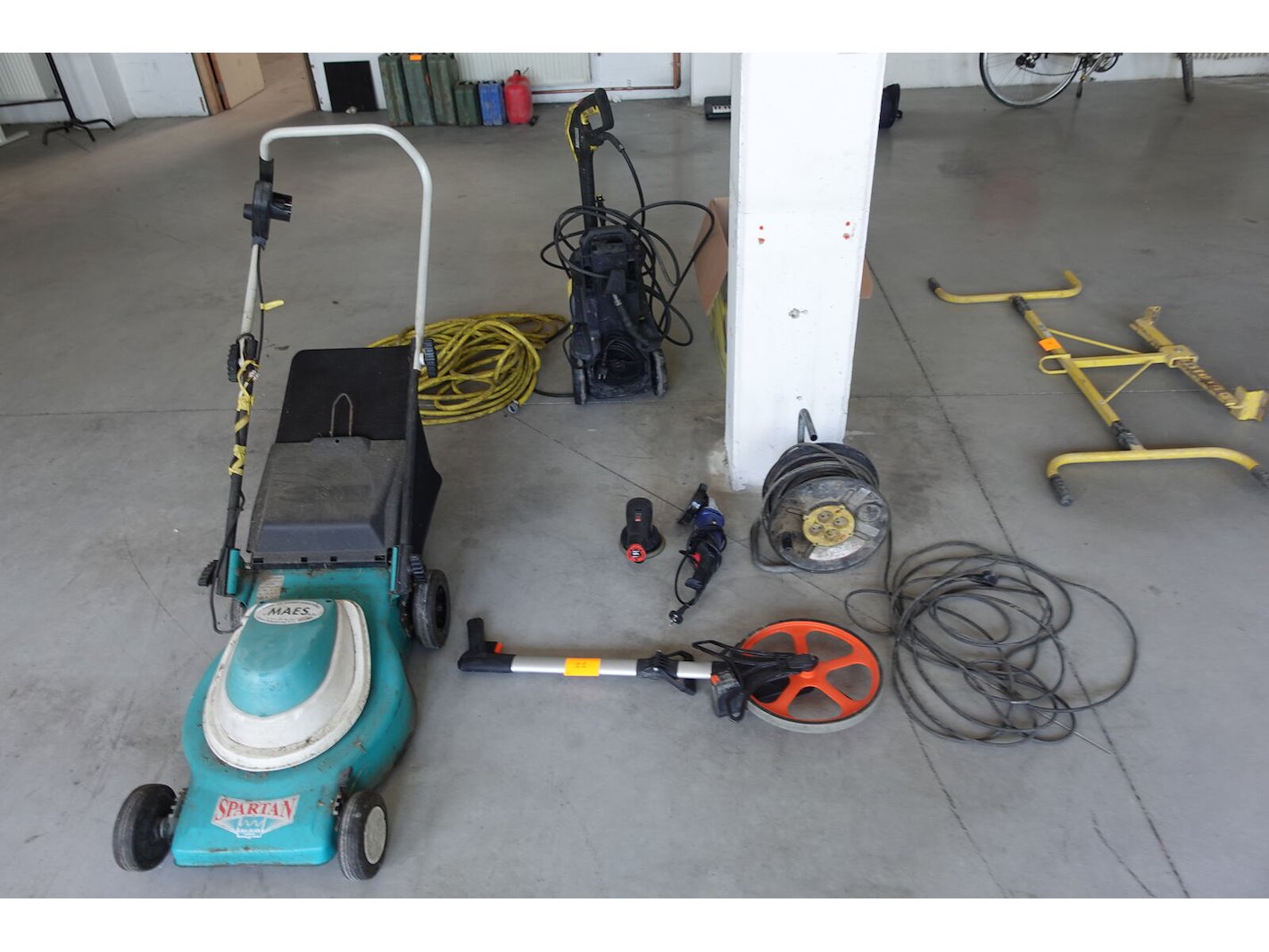 Kabel op rol, meetwiel, haakse slijper, schuurmachine, grasmachine<br /> locatie: 2de ruimte