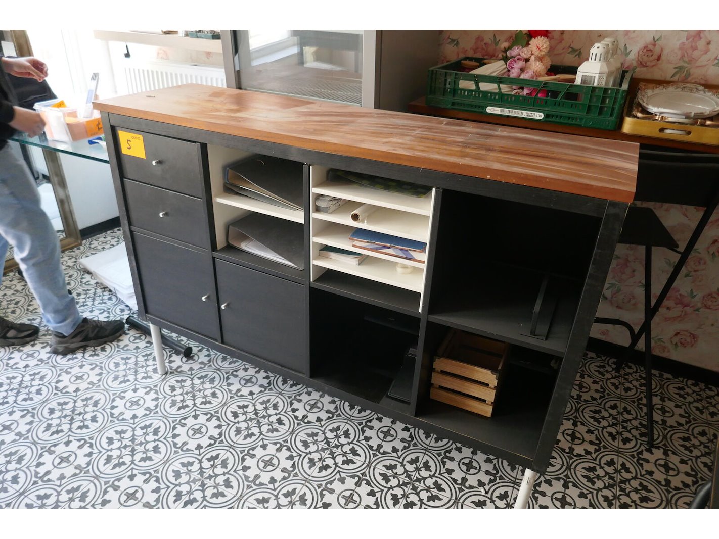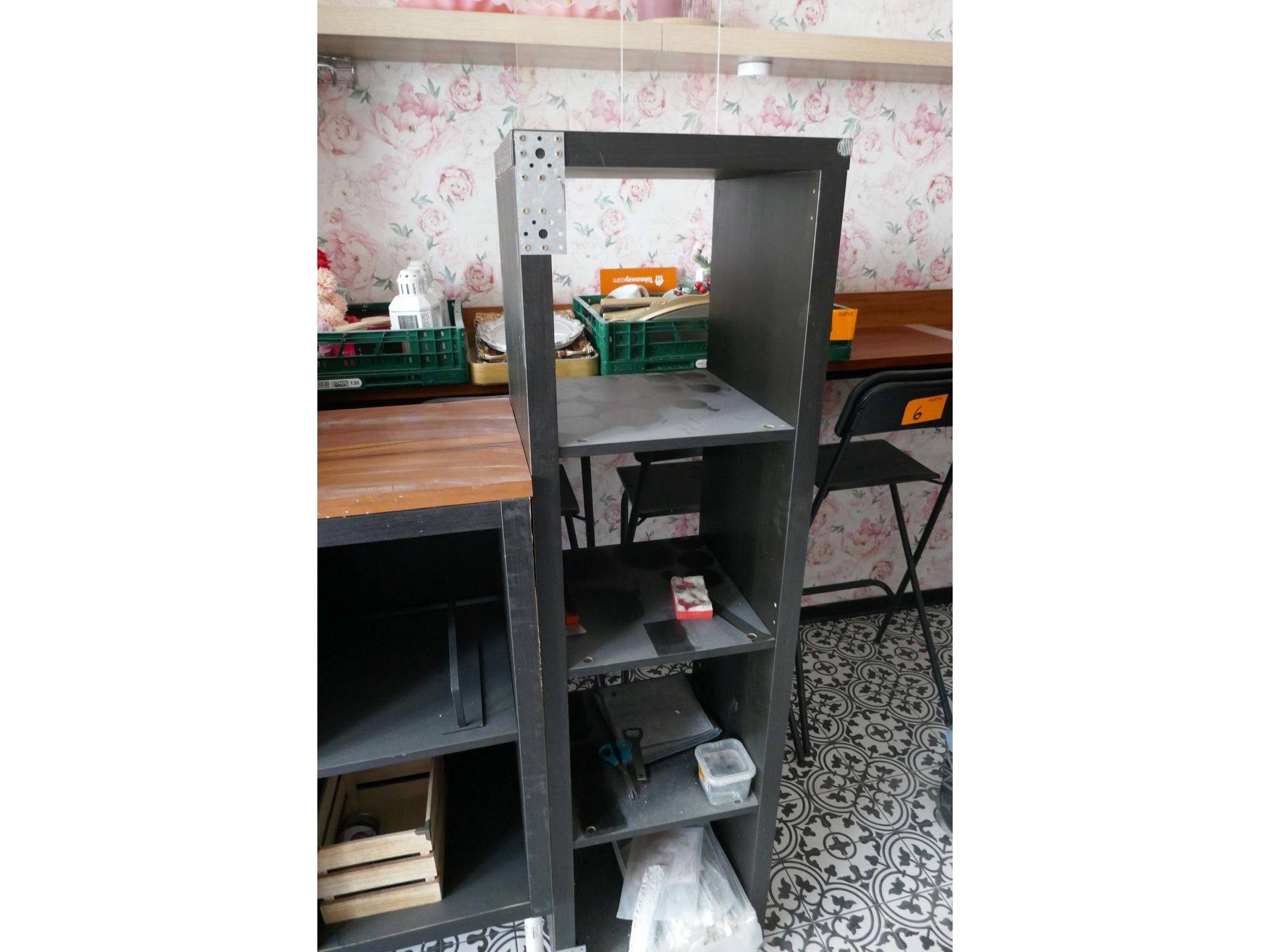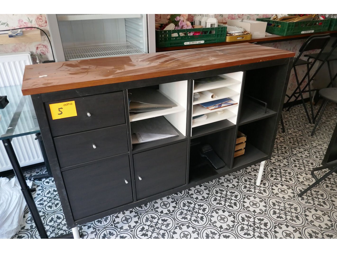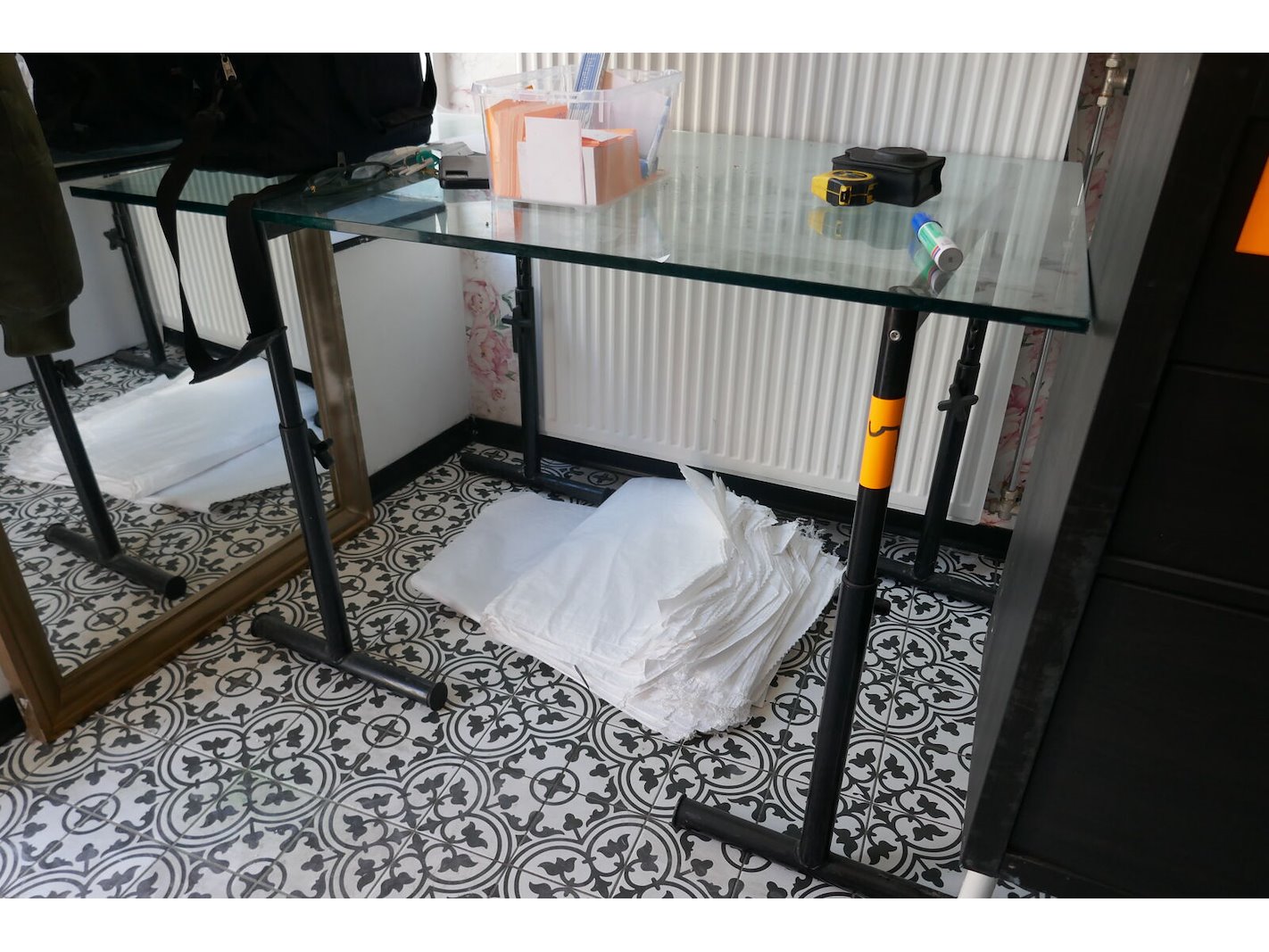 Diverse wandkasten en vakkenkasten met inhoud<br /> Tafel met verstelbare poten en glazen bovenblad