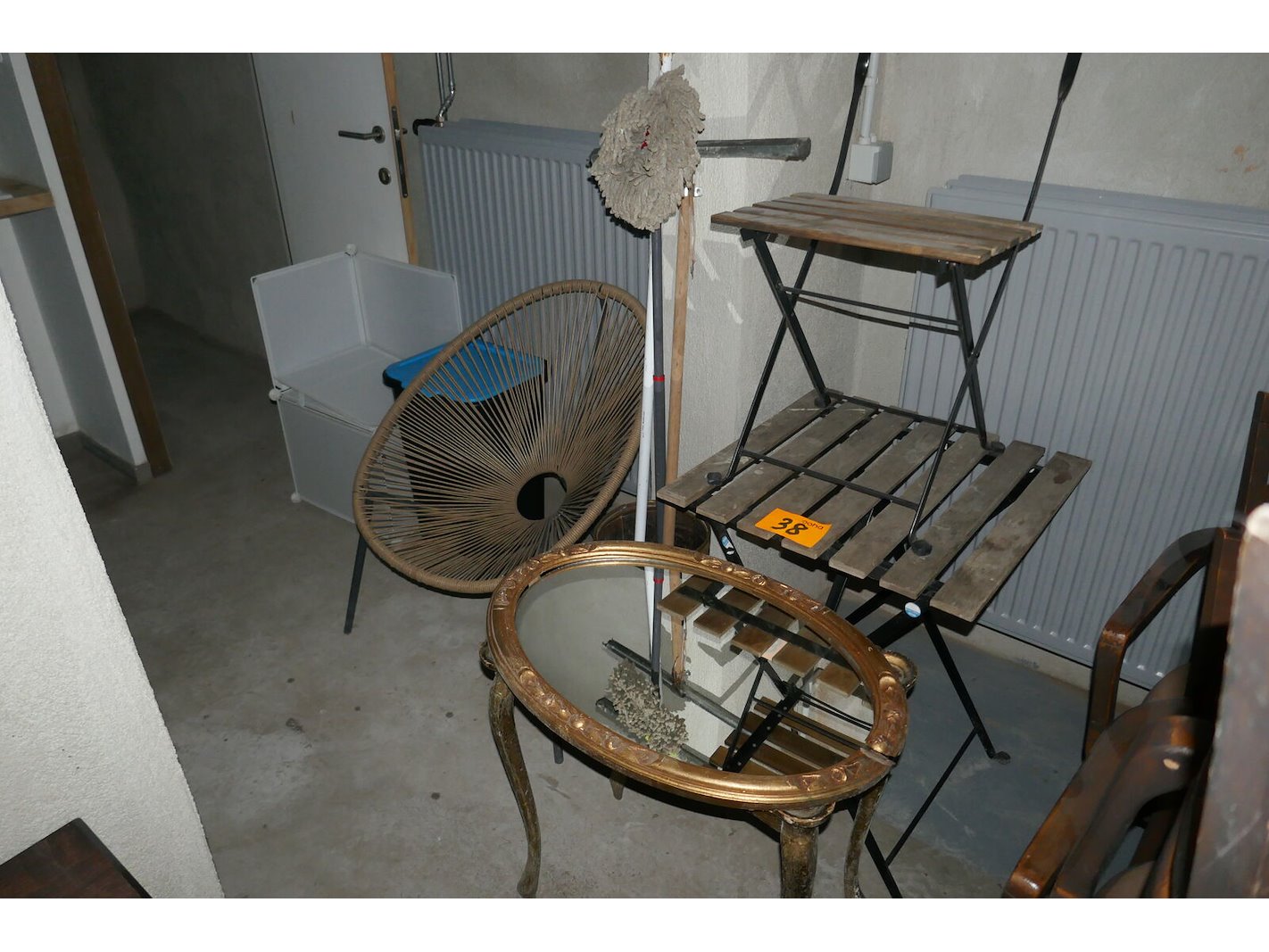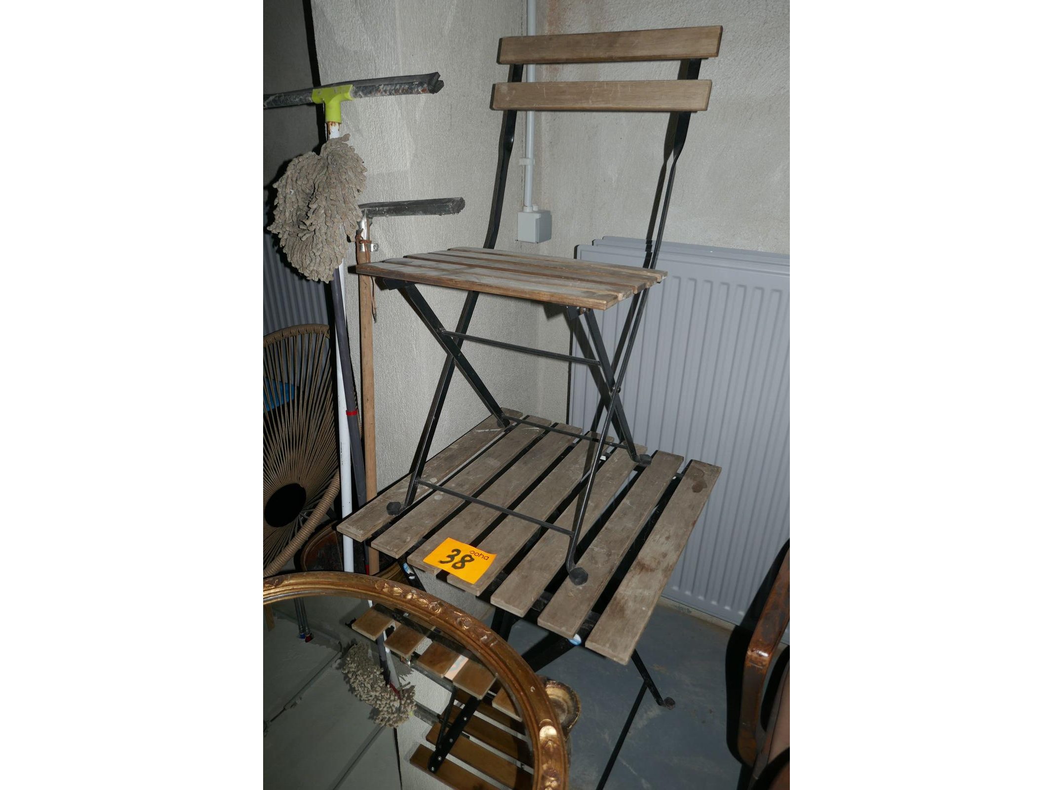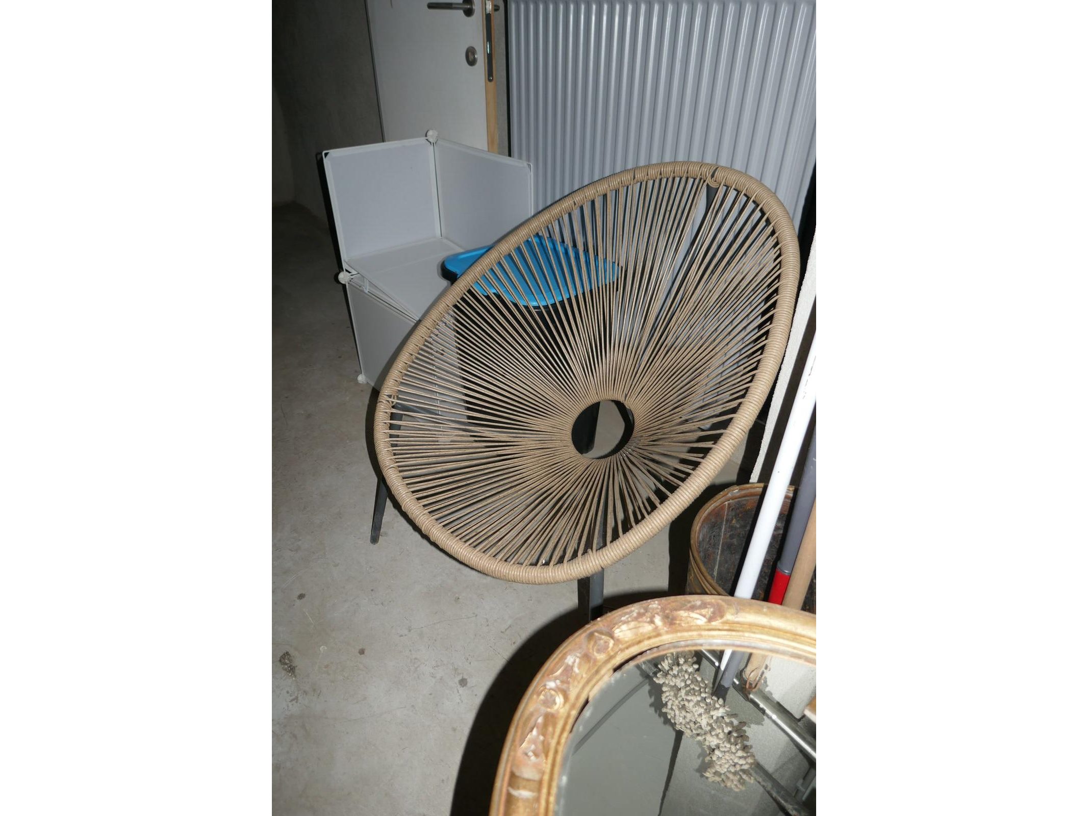 Tuintafel met bijhorende klapstoeltje<br /> Vintage bijzetafel met ovalen spiegel<br /> Rieten loungestoel + vuilbakje
