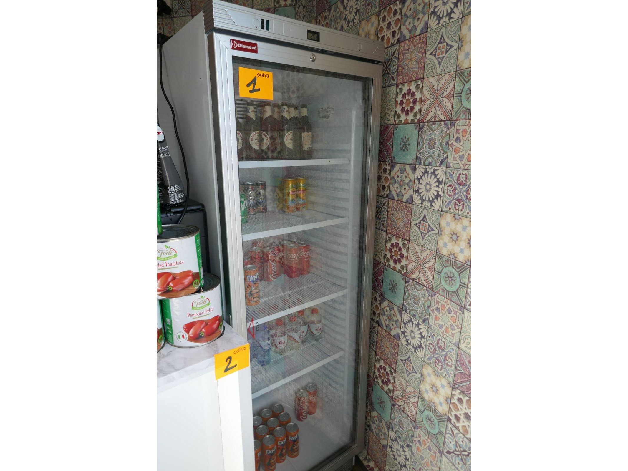 Vitrinefrigo<br /> *merk : DIAMOND<br /> *model : drink-38ss/r6<br /> Met inhoud : diverse frisdranken en bieren