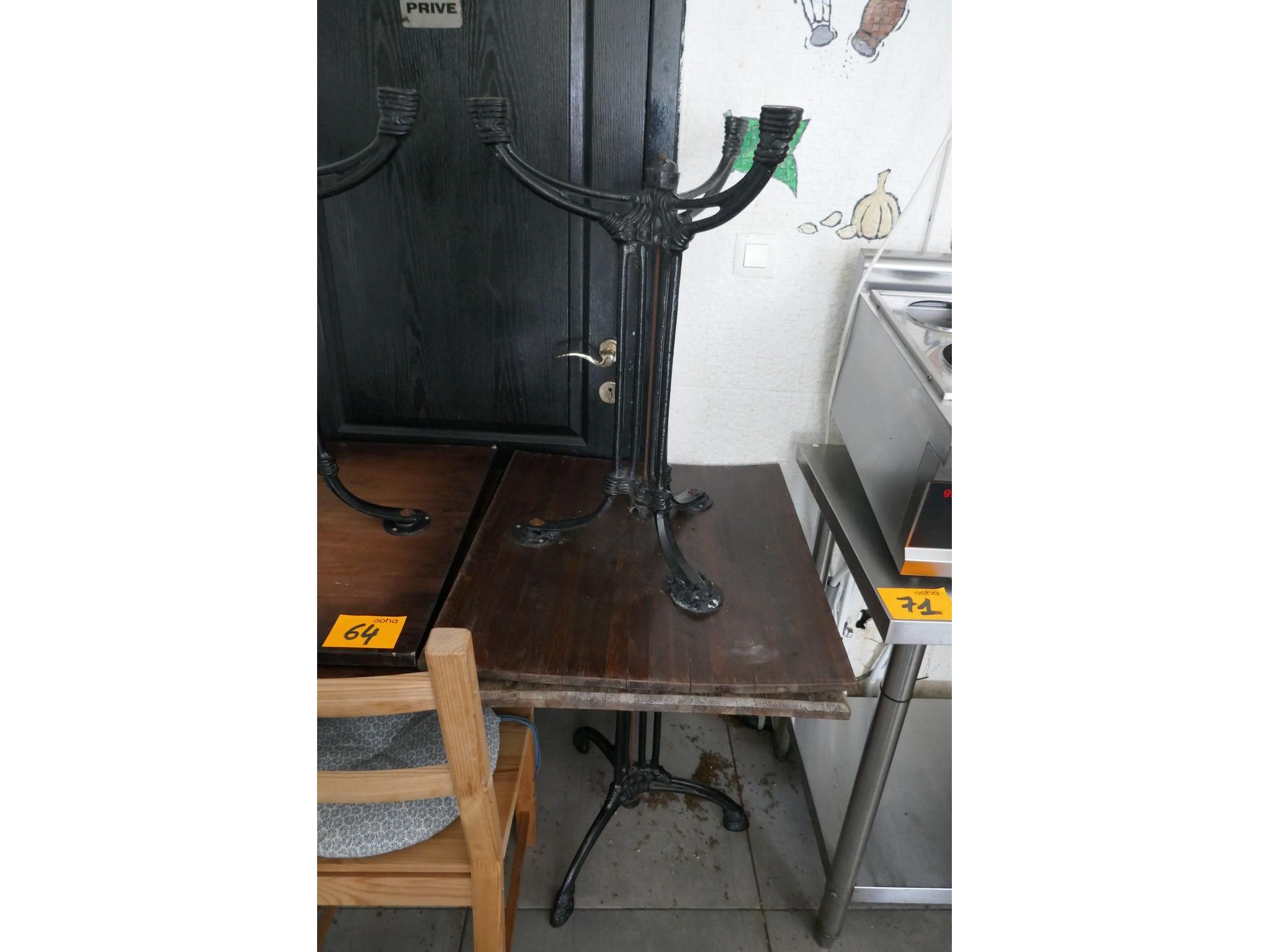 12 houten horecastoelen met armleuning en stoffen zitting + 4 gietijzeren tafels met houten bovenblad + houten stoel