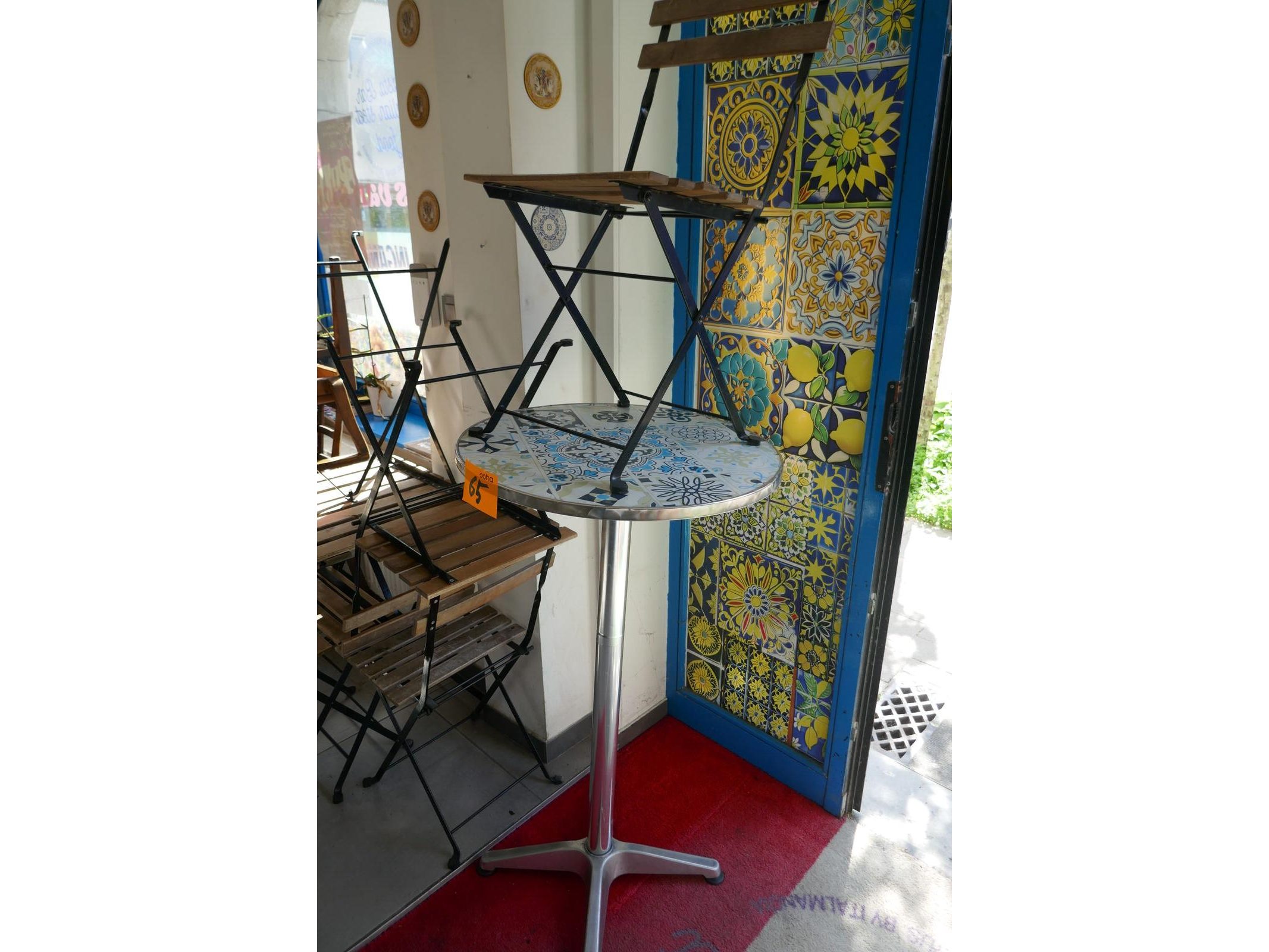 2 bistrotafels en 4 bistrostoelen + hoge metalen ronde tafel (vast te zetten ) + 2 vouwbare barkrukken