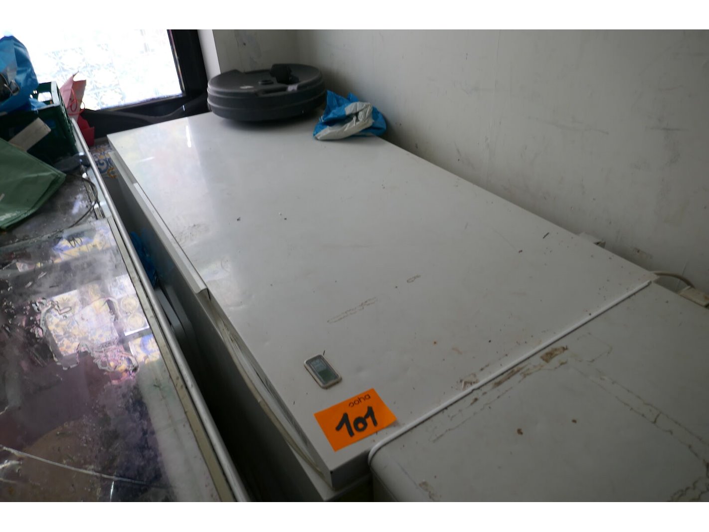 Vrieskist met deksel witte kleur + inhoud : bevroren voedingswaren (graag te bezichtigen )