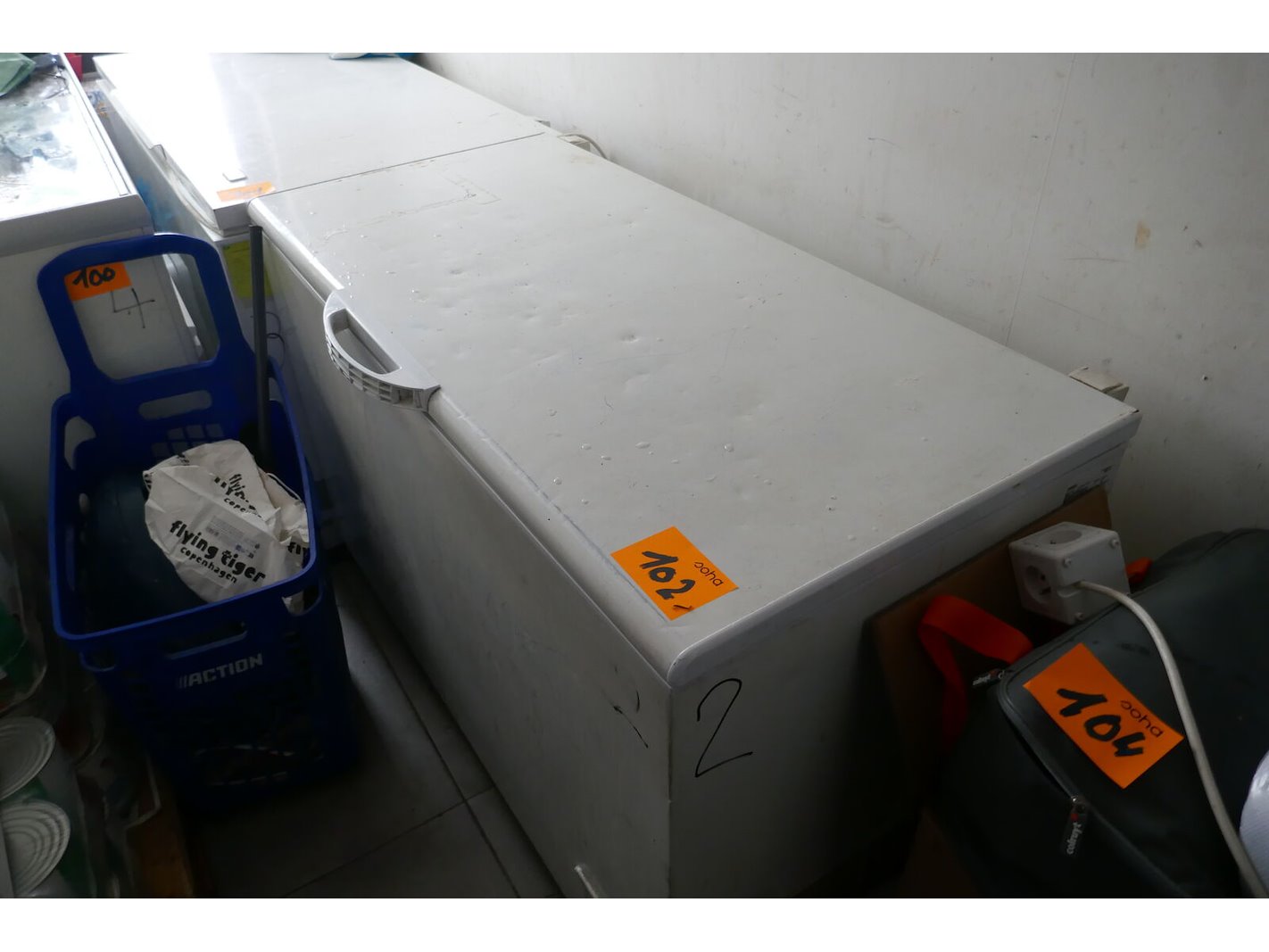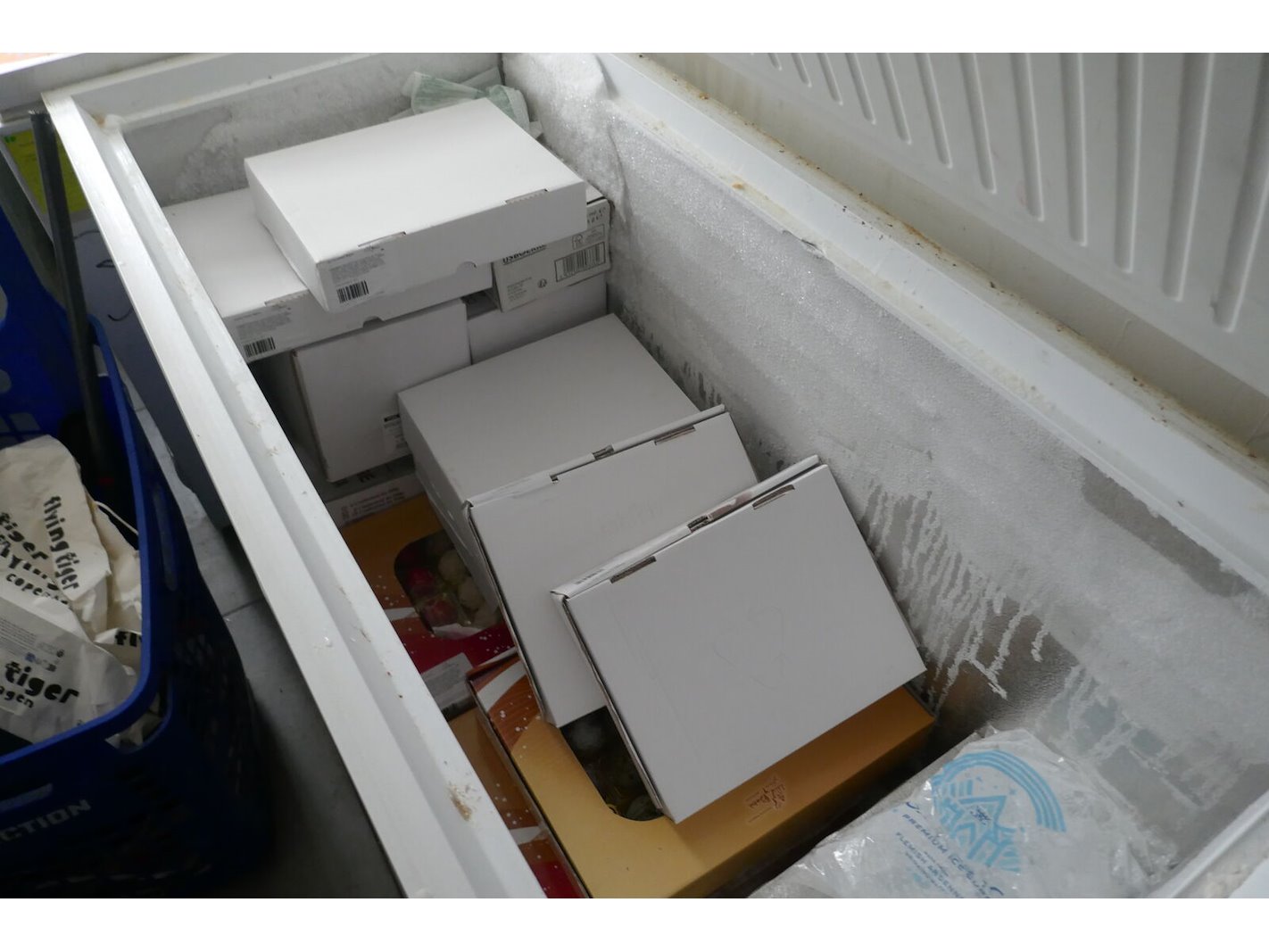 Vrieskist met deksel witte kleur + inhoud : bevroren voedingswaren (graag te bezichtigen )