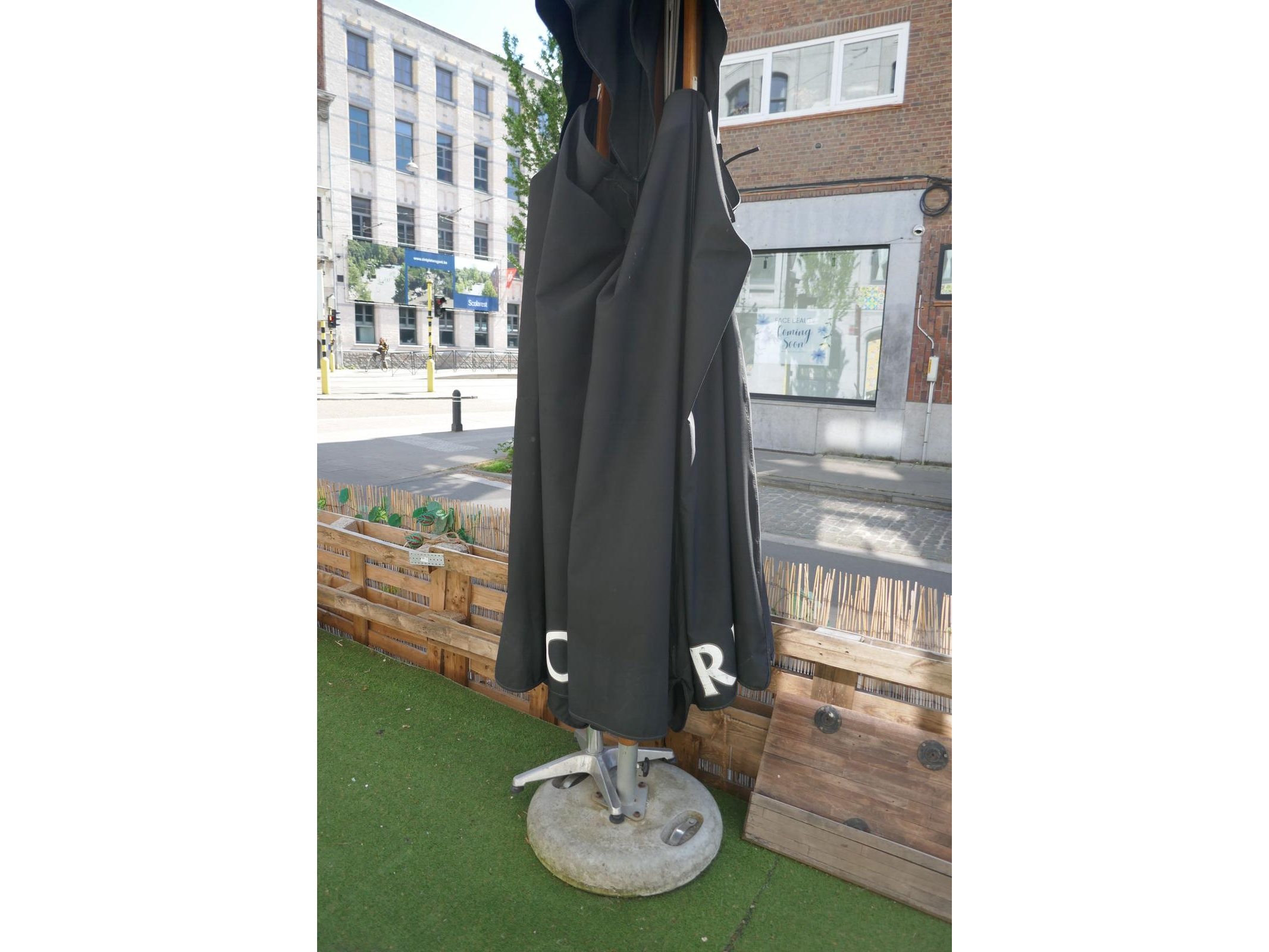 Grote zwarte parasol met betonnen voet <br /> Grote beige parasol met betonnen voet