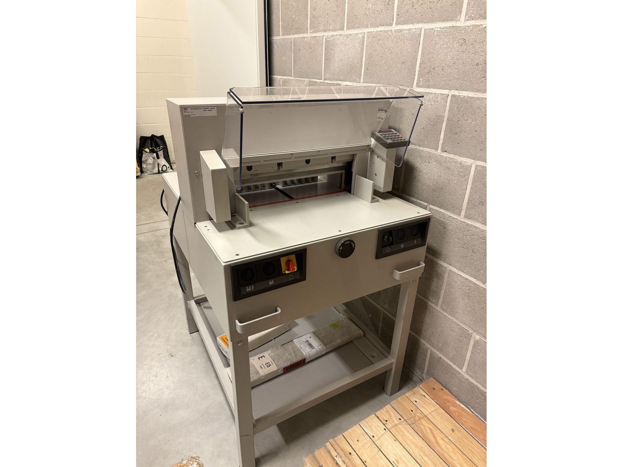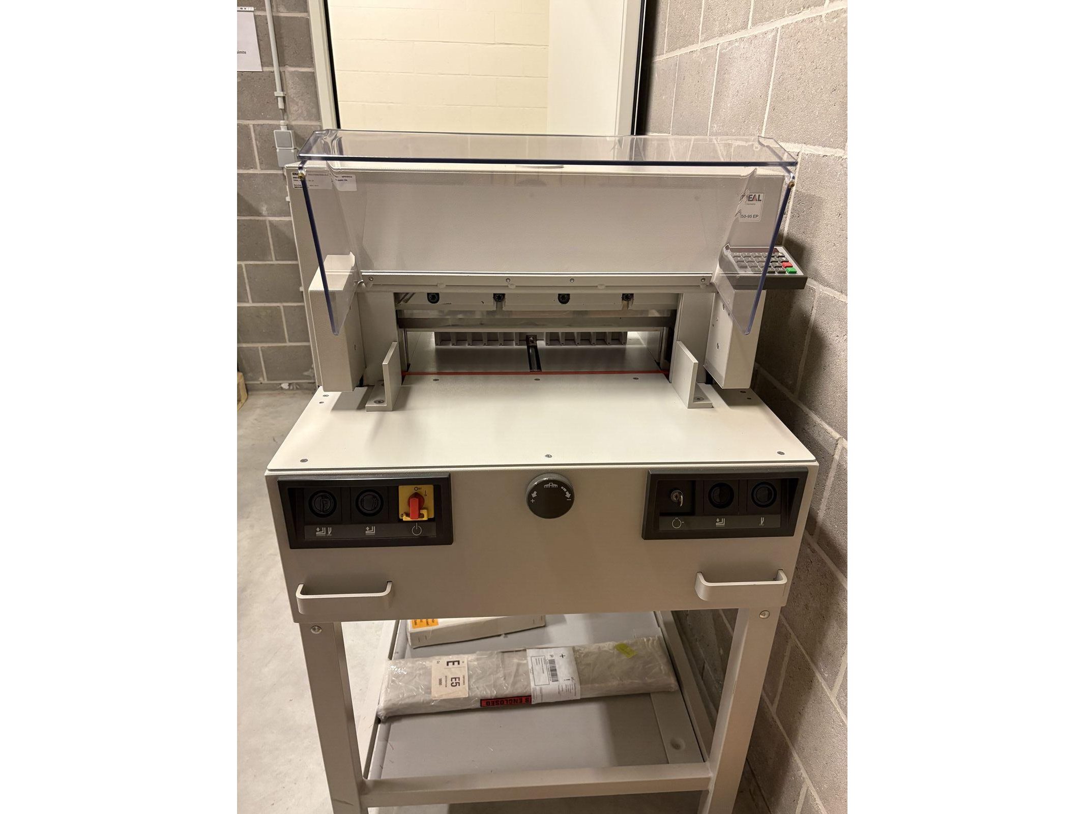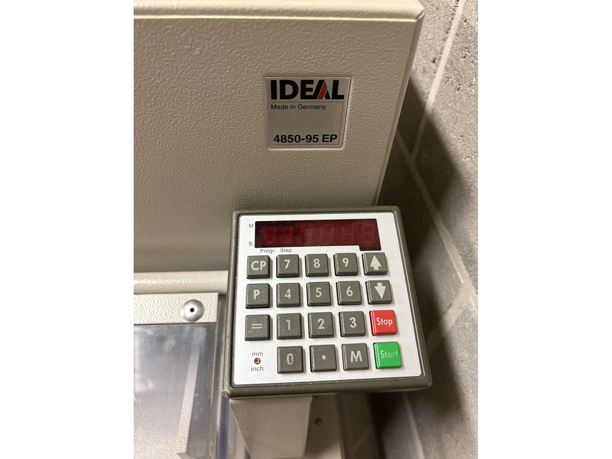 IDEAL 4850-98 EP<br /> Bouwjaar 2002<br /> Elektronica na te kijken<br /> Met Nederlandstalige handleiding<br /> Met twee messen (kunnen worden geslepen) <br /> Met mesvervangingsgereedschap<br /> <br /> Uitrusting:<br /> - Snijlengte: 475 mm<br /> - Snijhoogte: 80 mm<br /> - smalste snijmaat: 35 mm<br /> - Snijdiepte: max. 450 mm<br /> - Elektromechanische messen aandrijving<br /> - Automatische persing<br /> - Elektrische sledevoor- en terugloop<br /> - Digitale maataanduiding<br /> <br /> Tweehandige snijbediening<br /> Hoogwaardig snijmessen in Solingenstaal<br /> Mesdiepteverstelling vanaf de buitenkant van de machine<br /> Eenvoudige meswissel vanaf de voorkant van de machine zonder afdekkingen te verwijderen<br /> <br /> Transparante, scharnierende veiligheidskap voor en achter<br /> De elektronisch beveiligde veiligheidsbeschermkap aan de voorzijde zwenkt gemakkelijk weg en maakt veilig en gemakkelijk snijden mogelijk.<br /> Directe maatinvoer via numeriek toetsenbord.<br /> Digitale maataanduiding, weergave in cm/inch (nauwkeurigheid van 0,1 mm)<br /> Digitaal display voor het aflezen van de meting in cm of inches (weergave nauwkeurig tot 1/10 mm of 1/100 inch)<br /> Programeerbaar: 9 programma's met 9 stappen per programma (tot 9 herhaalde sneden kunnen in één programmastap worden geïntegreerd). Geheugentoets voor herhaalde sneden<br /> Zelfdiagnosesysteem met foutmelding op het display<br /> <br /> Elektronisch handwiel met traploze snelheidsregeling (van zeer langzaam tot zeer snel) voor fijne handmatige afstelling<br /> Automatische terugkeer van mes en klem vanuit elke positie<br /> Aandrukbalk onafhankelijk van het mes te bedienen, geleid aan de zijkanten van de tafel voor gelijkmatig verdeelde klemkracht<br /> Hoofdschakelaar en veiligheidsslot met sleutel<br /> Elektromechanische aandrijving voor snijbalk en aandrukbalk. <br /> Solide volledig metalen constructie, compleet met onderstel en opbergplank<br /> Afmetingen [H x B x D]: 1230 x 755 x 970 mm. Gewicht: 215 kg. Kleur: parelgrijs.