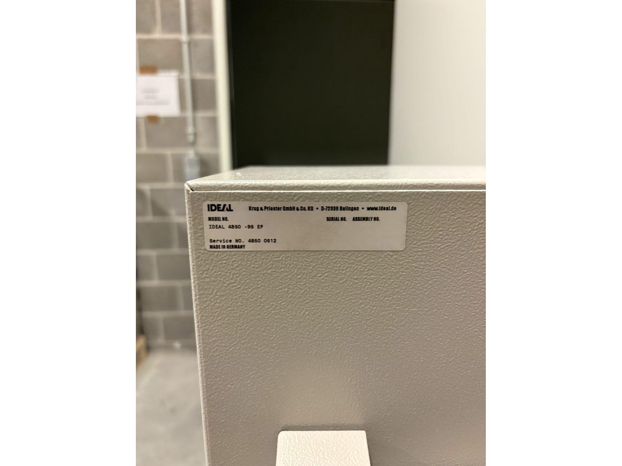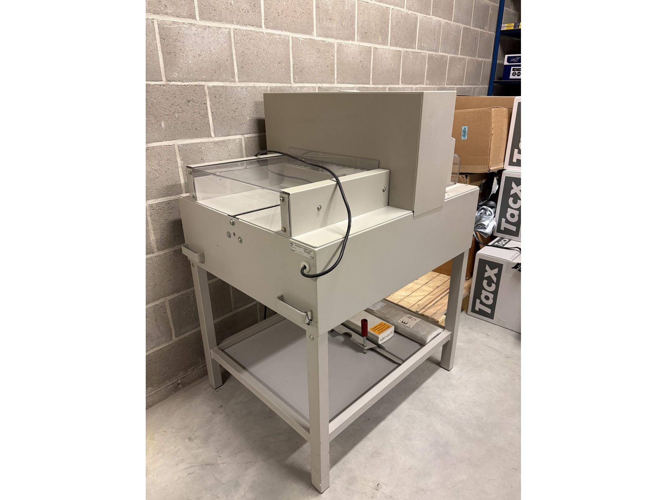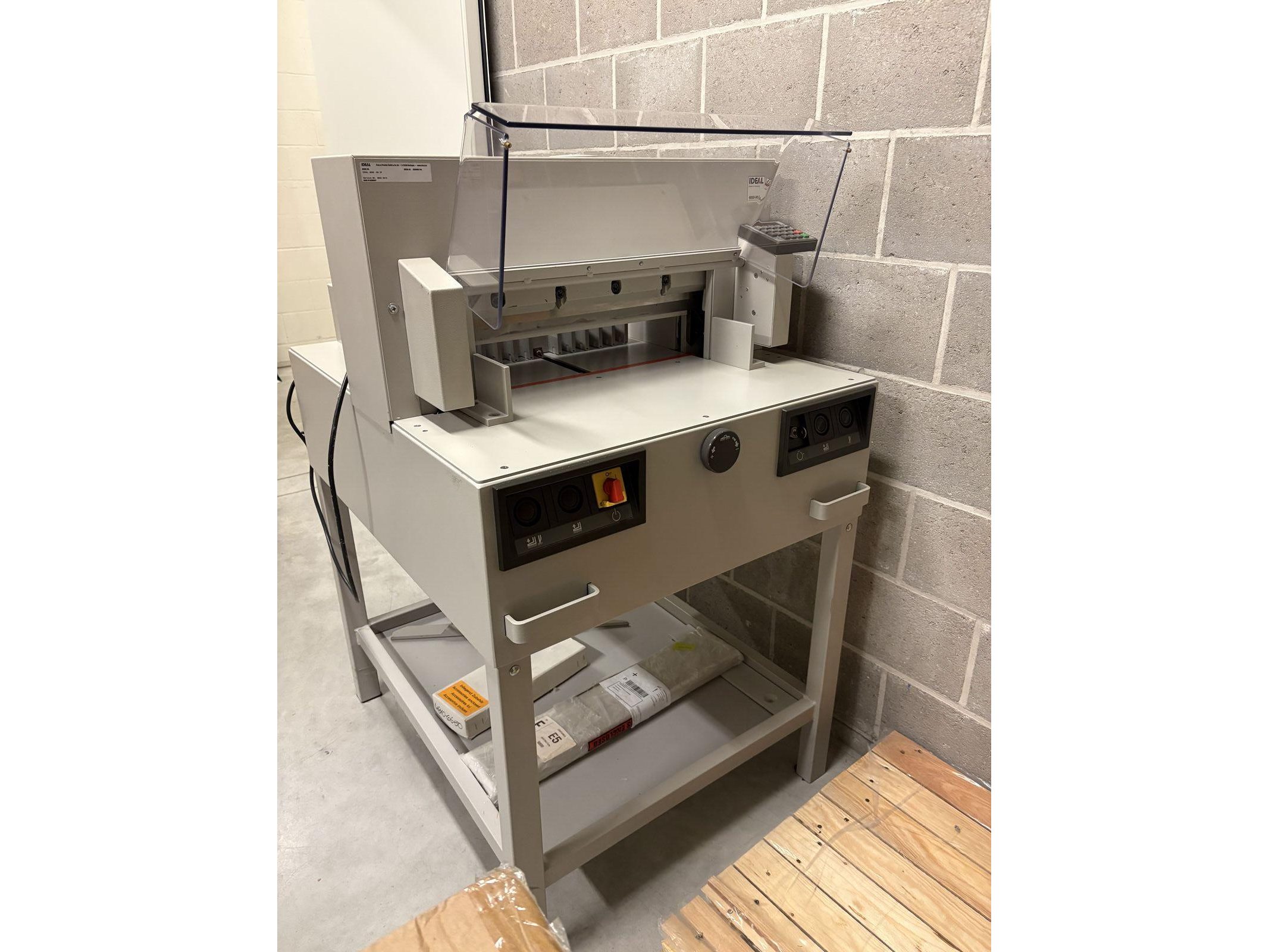 IDEAL 4850-98 EP<br /> Bouwjaar 2002<br /> Elektronica na te kijken<br /> Met Nederlandstalige handleiding<br /> Met twee messen (kunnen worden geslepen) <br /> Met mesvervangingsgereedschap<br /> <br /> Uitrusting:<br /> - Snijlengte: 475 mm<br /> - Snijhoogte: 80 mm<br /> - smalste snijmaat: 35 mm<br /> - Snijdiepte: max. 450 mm<br /> - Elektromechanische messen aandrijving<br /> - Automatische persing<br /> - Elektrische sledevoor- en terugloop<br /> - Digitale maataanduiding<br /> <br /> Tweehandige snijbediening<br /> Hoogwaardig snijmessen in Solingenstaal<br /> Mesdiepteverstelling vanaf de buitenkant van de machine<br /> Eenvoudige meswissel vanaf de voorkant van de machine zonder afdekkingen te verwijderen<br /> <br /> Transparante, scharnierende veiligheidskap voor en achter<br /> De elektronisch beveiligde veiligheidsbeschermkap aan de voorzijde zwenkt gemakkelijk weg en maakt veilig en gemakkelijk snijden mogelijk.<br /> Directe maatinvoer via numeriek toetsenbord.<br /> Digitale maataanduiding, weergave in cm/inch (nauwkeurigheid van 0,1 mm)<br /> Digitaal display voor het aflezen van de meting in cm of inches (weergave nauwkeurig tot 1/10 mm of 1/100 inch)<br /> Programeerbaar: 9 programma's met 9 stappen per programma (tot 9 herhaalde sneden kunnen in één programmastap worden geïntegreerd). Geheugentoets voor herhaalde sneden<br /> Zelfdiagnosesysteem met foutmelding op het display<br /> <br /> Elektronisch handwiel met traploze snelheidsregeling (van zeer langzaam tot zeer snel) voor fijne handmatige afstelling<br /> Automatische terugkeer van mes en klem vanuit elke positie<br /> Aandrukbalk onafhankelijk van het mes te bedienen, geleid aan de zijkanten van de tafel voor gelijkmatig verdeelde klemkracht<br /> Hoofdschakelaar en veiligheidsslot met sleutel<br /> Elektromechanische aandrijving voor snijbalk en aandrukbalk. <br /> Solide volledig metalen constructie, compleet met onderstel en opbergplank<br /> Afmetingen [H x B x D]: 1230 x 755 x 970 mm. Gewicht: 215 kg. Kleur: parelgrijs.