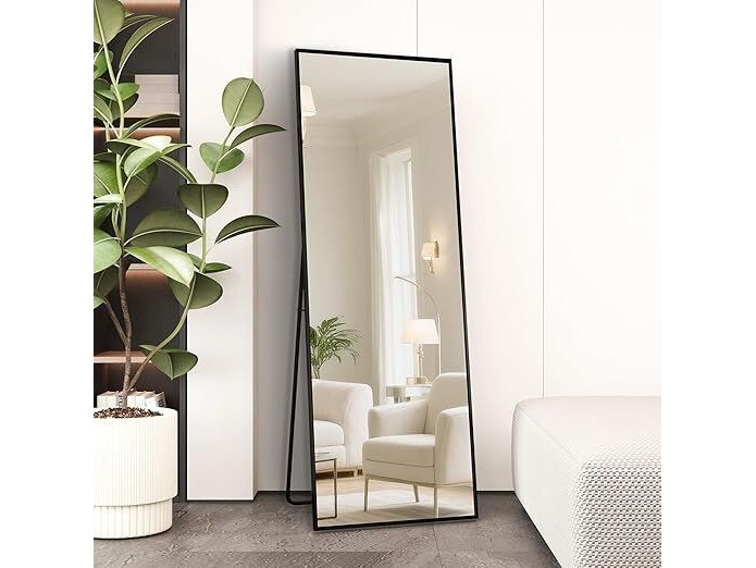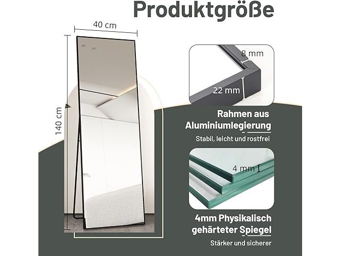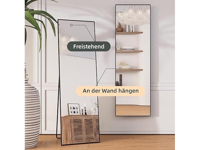 Ongebruikt, volledig, ok, Staande spiegel met metalen frame, 140 x 40 cm, HD-beeldkwaliteit met haken voor woonkamer, kleedkamer, zwart en goud,B09924PNYM