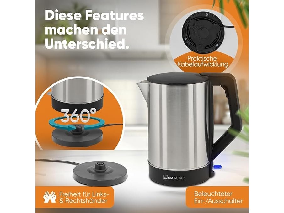 Ongebruikt, getest en werkend, volledig, ok, Clatronic waterkoker | 1,5 liter inhoud | scharnierend deksel | 2200 W | verborgen verwarmingselement | automatische uitschakeling | met snoerhaspel | WKS 3692 zwart/roestvrij staal,B079DDND7C