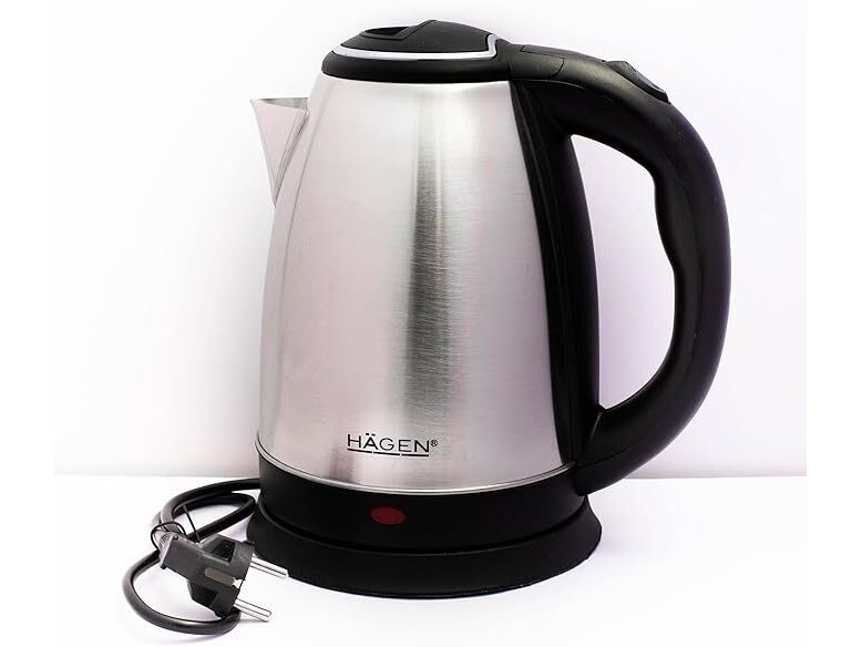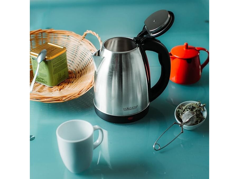 Ongebruikt, getest en werkend, volledig, originele verpakking ontbreekt, ok, Hagen - Compacte elektrische waterkoker van roestvrij staal, elegant design, 360° draaibare voetjes, inhoud 1,8 liter, vermogen 1500 W, verwijderbaar en wasbaar filter, zilverkleurig,B09V54S4NM
