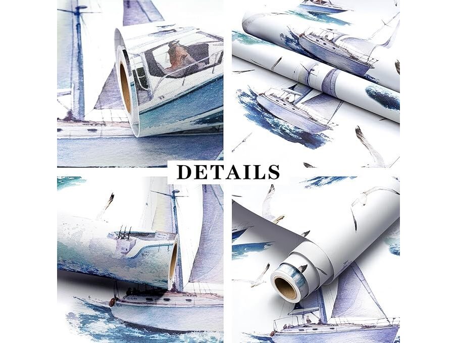 Ongeopend, in seal, 5 x ReWallpaper behang zelfklevend wit blauw 44.5CM×7M zelfklevende film kinderkamer kast nautisch behang wit patroon zeilboot decoratieve film zelfklevend meubilair voor badkamer waterdicht, B0DPHDJ81F