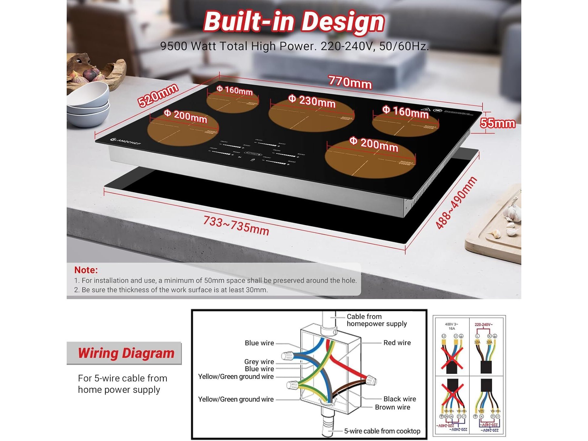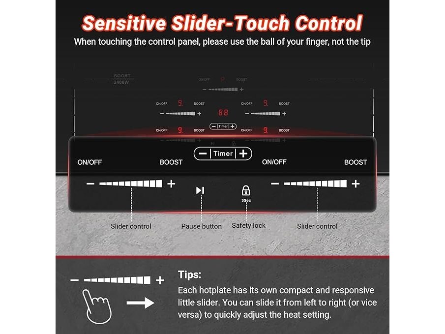 Ongebruikt, getest en werkend, volledig, ok, AMZCHEF Inductiekookplaat (80 cm), inbouw inductiekookplaat, 5 zones met booster en 9 niveaus, pauzefunctie, warmhouden, sliderbediening, timer, veiligheidsslot, 9500 W, B0DK4XR3KH