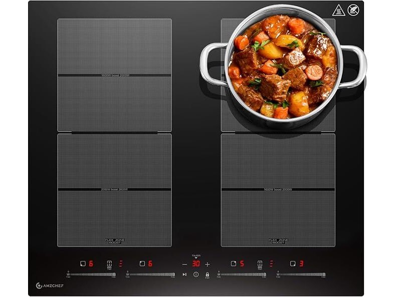 Gebruikssporen, getest en werkend, ok, bevestigingsbeugels ontbreken, AMZCHEF Inductiekookplaat 60 cm met 2 flexzones, 4 zones, inductiekookplaat met stille werking, 9 standen en booster, BBQ-functie, pauzefunctie en warmhouden, 7400 W, B0BWJ92F4X