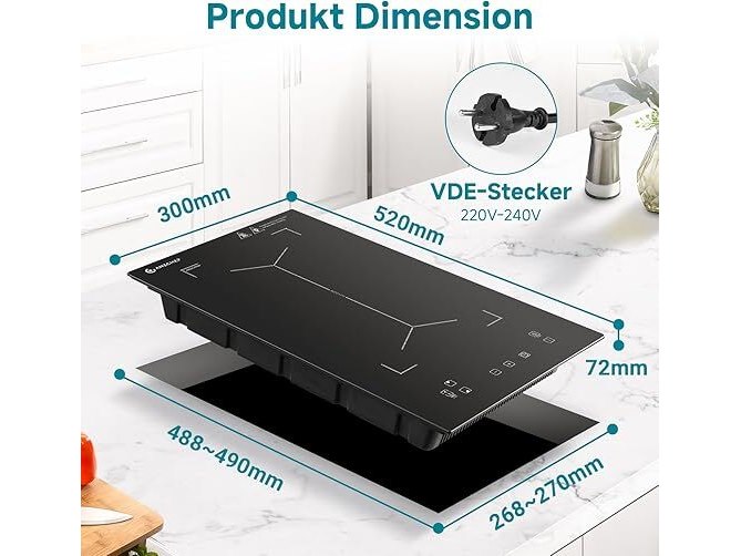 Ongebruikt, getest en werkend, volledig, ok, AMZCHEF Inductiekookplaat (2 zones), dubbele inductiekookplaat met flexibele zones en stekker, 10 vermogensniveaus, veiligheidsslot en timer, aanraakschuifregelaar, 3300 W, zwart, B0CNXK8RL5