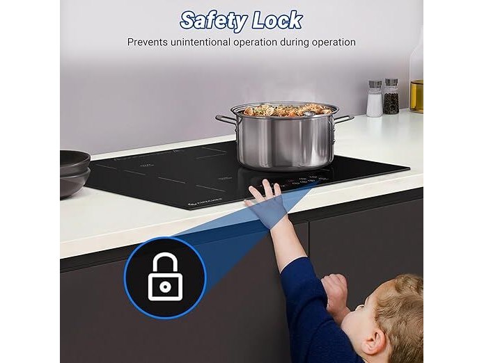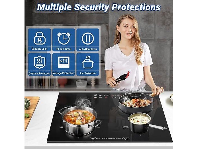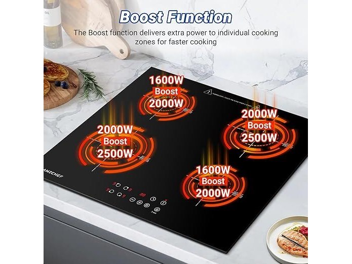 Ongebruikt, getest en werkend, volledig, ok, AMZCHEF Inductiekookplaat 60 cm, inbouw inductiekookplaat, 4 platen met boost-functie, 9 standen, veiligheidsslot, touch-bediening, timer, 7200 W, zwart,B0DTHB12FQ