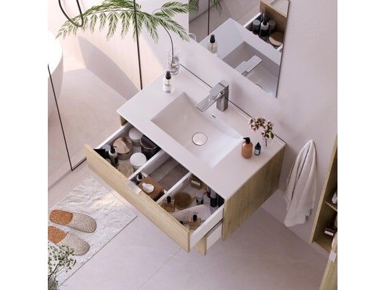 Ongeopend in originele verpakking - Enkele wastafelmeubel, 80 cm breed, eikenhouten look, Infinity - inclusief wastafel en spiegel
