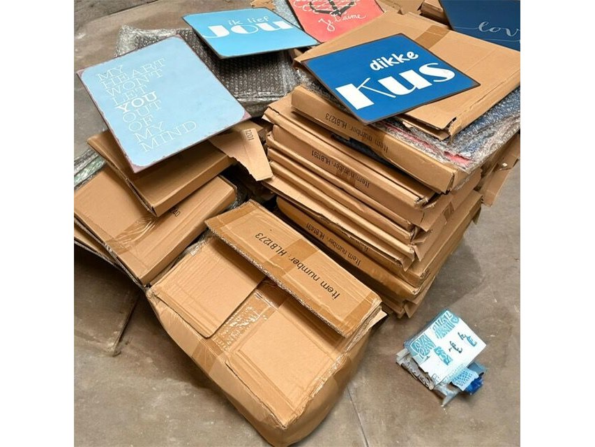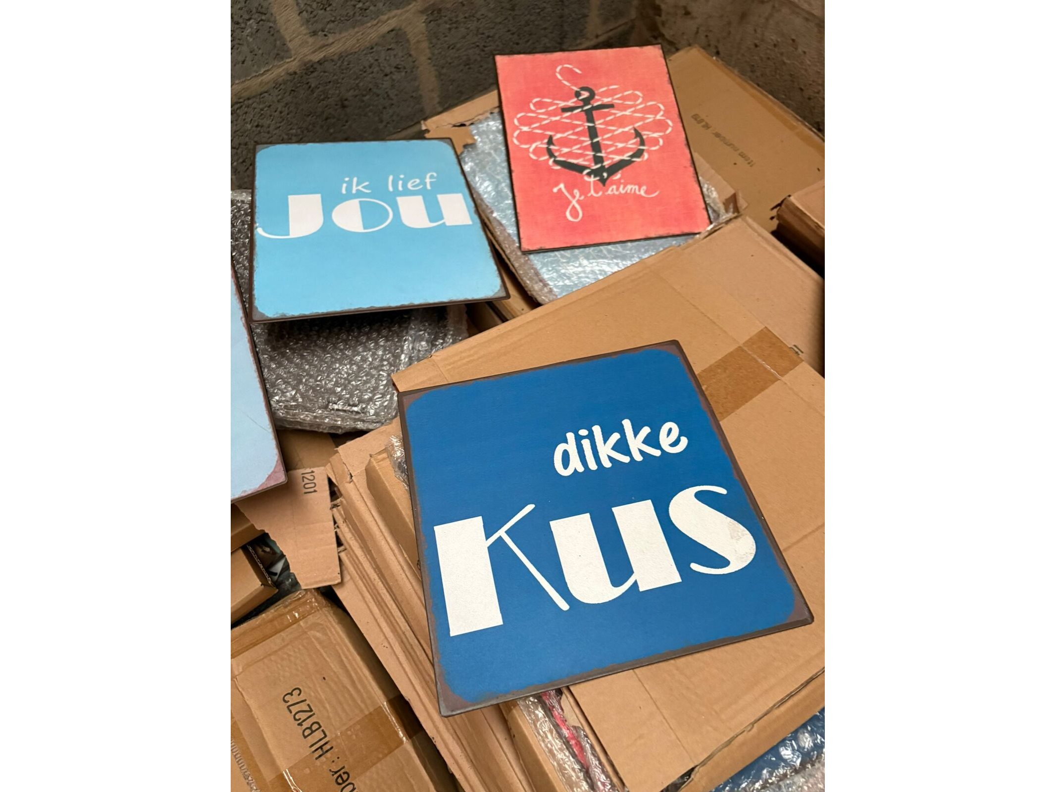 Pallet met ca 1100 decoratieve metalen bordjes, ongeveer 40 verschillende designs, Ongeopende verpakkingen
